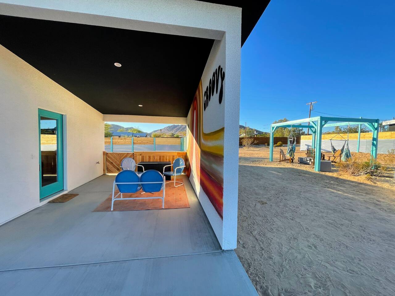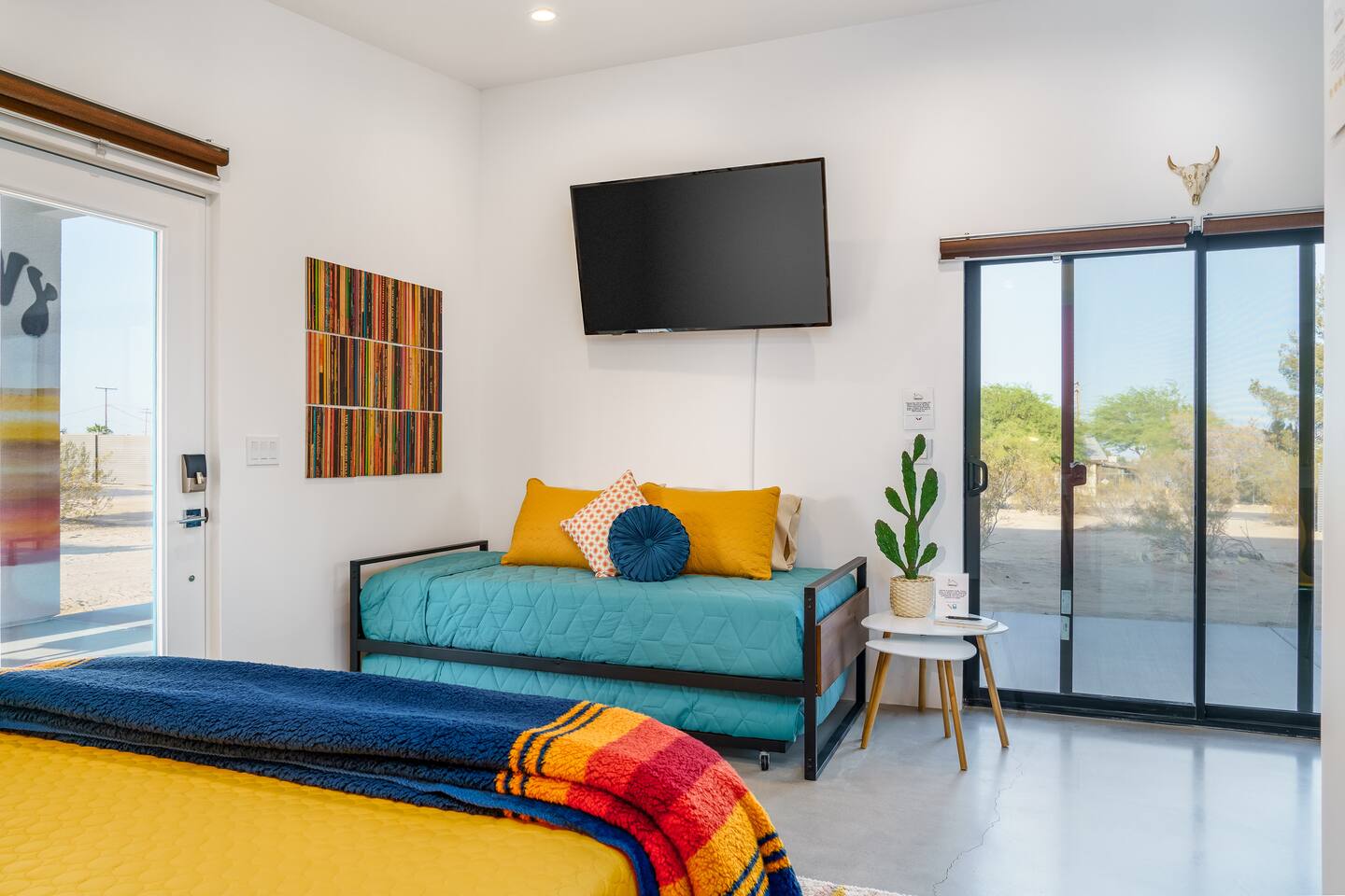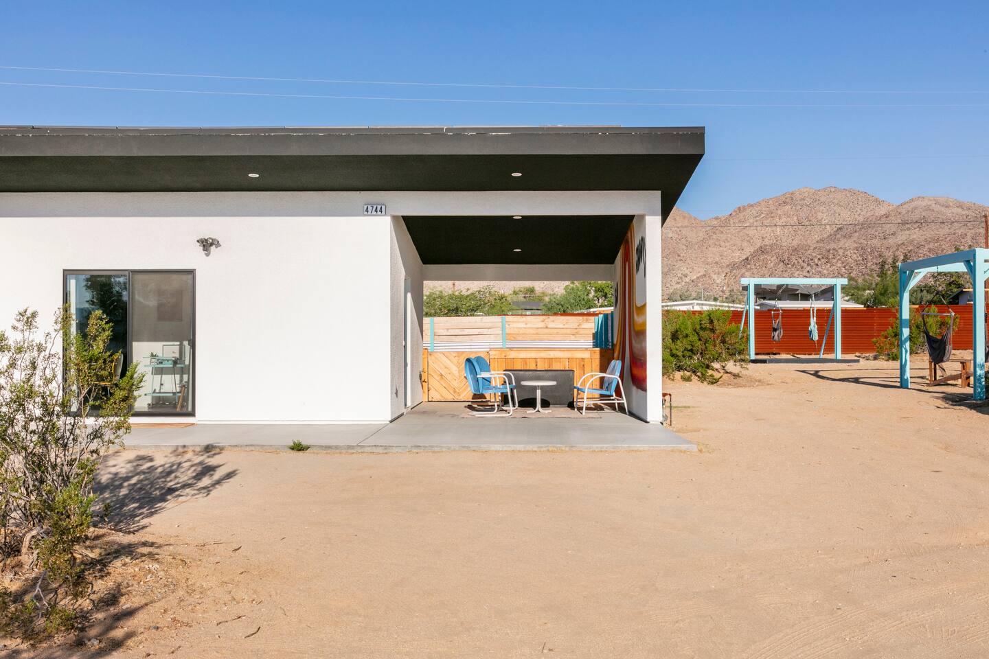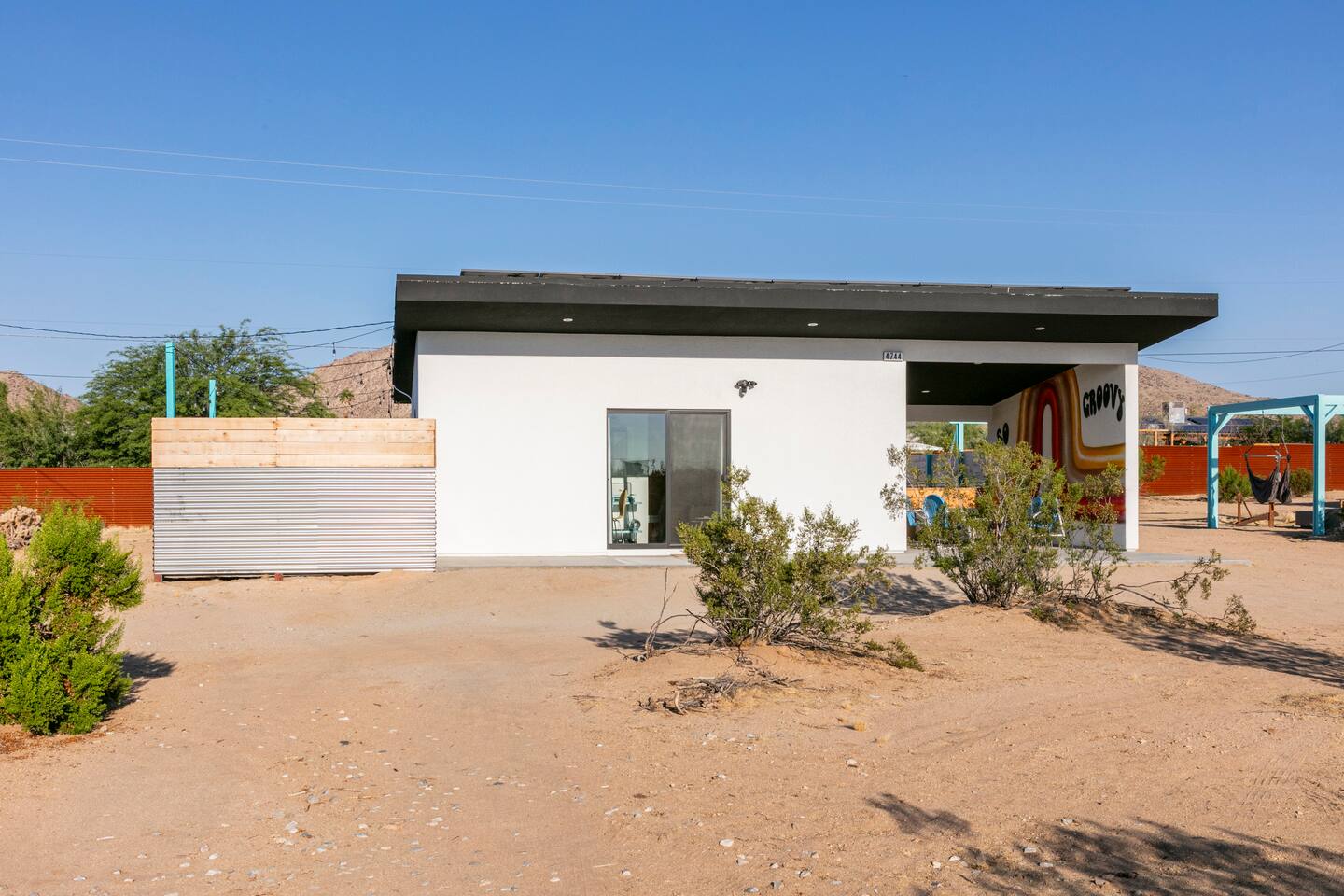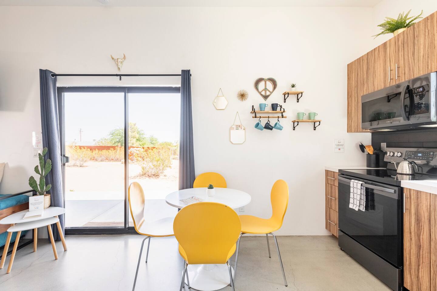 KEY FEATURES ☀ Spacious 391 square foot studio with 1 Queen sized bed and 2 Twin size trundle beds ☀ 1 full bathroom. ☀ Full kitchen, with all the tools needed to make a delicious meal! (there is no dishwasher available) ☀ Stocked coffee bar with assorted K-cups, whole bean coffee and coffee grounds ☀ Salt, pepper, and cooking spray are provided ☀ 55” flat screen TV with access to all streaming platforms (logins not provided) ☀ Free WiFi ☀ Washer + dryer ☀ Easy access; no steps to entry ☀ Convenient location; short drive to National Park, restaurants and activities ☀ Private fenced in backyard with hot tub and firepit ☀ On a large shared 1 acre lot with our 90s Haus ☀ Shared area with propane fire pit, pergola and hammocks ☆☆ BEDROOM & LIVING AREA ☆☆ Ultimate comfort and relaxation awaits you on our Queen size bed with Zinus memory foam mattress. There are also two Twin size trundle beds perfect for additional guests or kids. (FYI, there is no wall/room that separates these beds from one another. You will all be sleeping in the same “room”) You can have a cozy movie night relaxing in bed and watch your favorite shows on the 55” TV. Netflix, Hulu and Disney+ are available for your use, but you will need to provide your own login ☆☆ BATHROOMS ☆☆ There is one full size bathroom complete with plush bath linen, towels for the spa, hairdryer and first aid kit ☆☆ KITCHEN & DINING ROOM ☆☆ The fully equipped kitchen has everything you’ll need for whipping up tasty meals for the whole group, including stainless steel appliances, a toaster, a blender, a coffee machine, a Keurig, and all the basic kitchen essentials like pots, pans, plates, cups, and utensils. Enjoy meals together at the kitchen table with seating for 4. There is a stocked coffee bar with assorted K-cups, whole bean coffee and coffee grounds. Salt, pepper, and cooking spray are also included! ☆☆ OUTSIDE SPACE ☆☆ Step outside and into your private desert oasis. The entire backyard is fenced in, not only for your privacy, but also so your furry friends can safely explore! The best part about coming to Joshua Tree is being able to enjoy the outdoors and we think the backyard will do just that. The backyard features a hot tub, great for soaking in after long days hiking in the national park, as well as a fire pit surrounded by a pergola with hanging hammock chairs which is perfect for enjoying the starry night skies. ★☆ Book Today & Let Us Take Care Of You In Joshua Tree! ☆★
