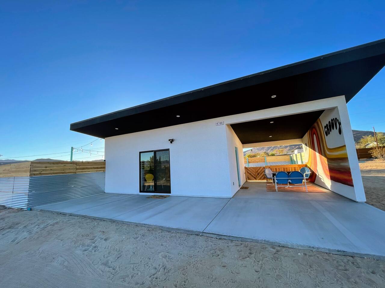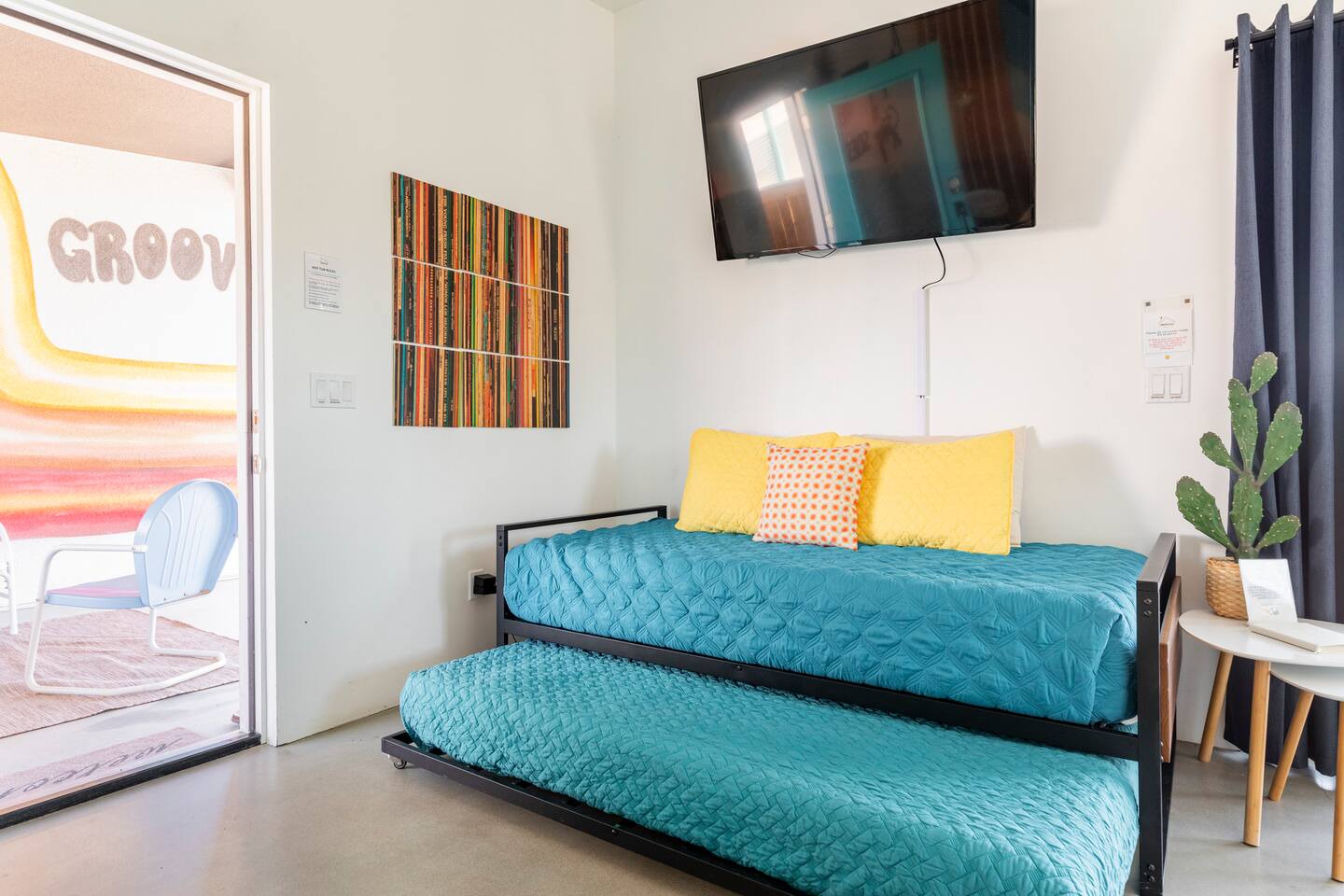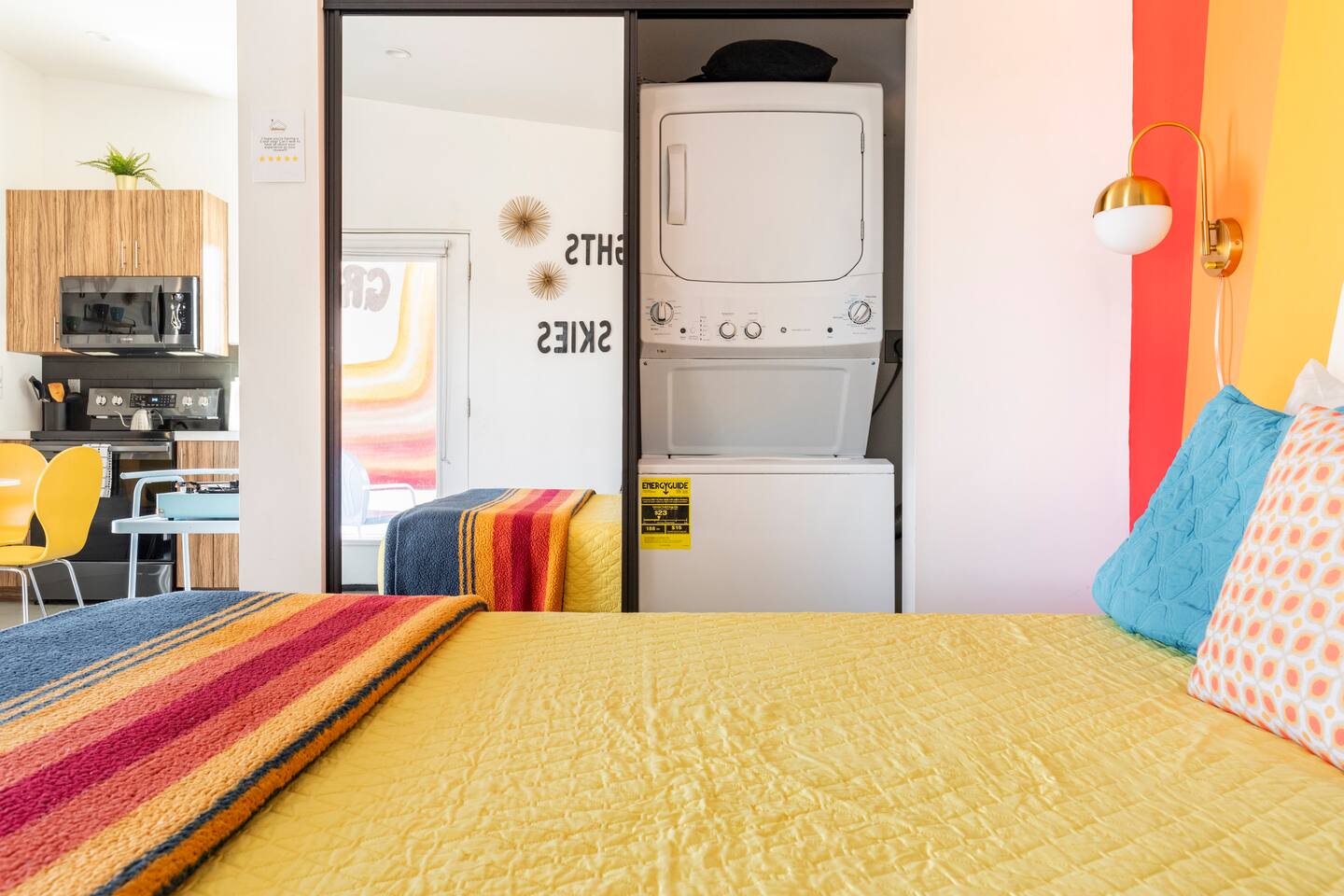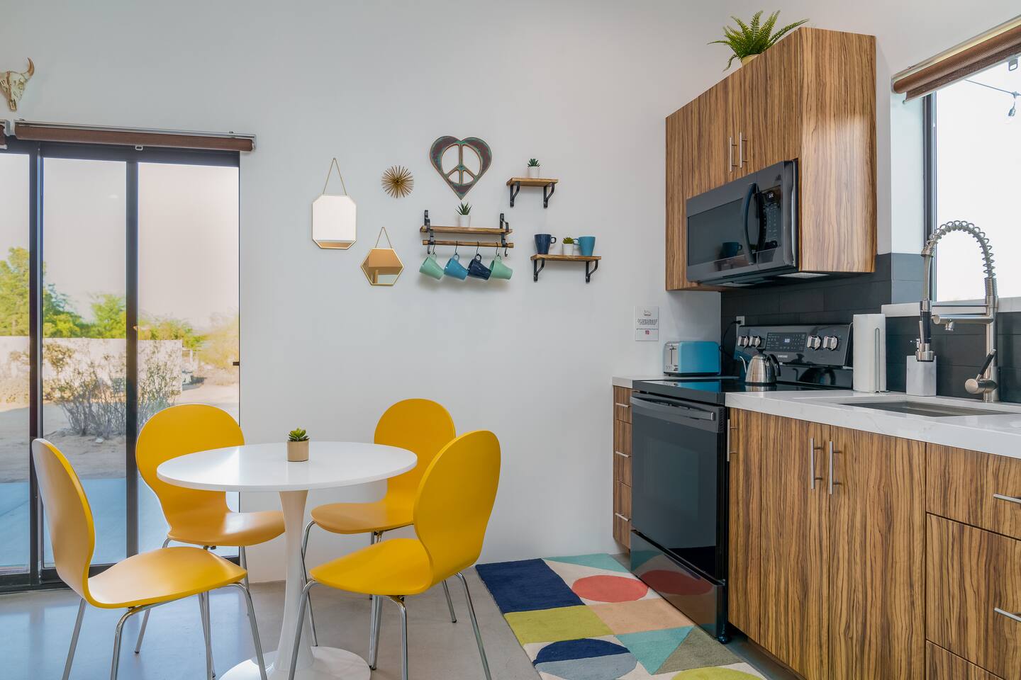 KEY FEATURES ☀ Spacious 391 square foot studio with 1 Queen sized bed and 2 Twin size trundle beds ☀ 1 full bathroom. ☀ Full kitchen, with all the tools needed to make a delicious meal! (there is no dishwasher available) ☀ Stocked coffee bar with assorted K-cups, whole bean coffee and coffee grounds ☀ Salt, pepper, and cooking spray are provided ☀ 55” flat screen TV with access to all streaming platforms (logins not provided) ☀ Free WiFi ☀ Washer + dryer ☀ Easy access; no steps to entry ☀ Convenient location; short drive to National Park, restaurants and activities ☀ Private fenced in backyard with hot tub and firepit ☀ On a large shared 1 acre lot with our 90s Haus ☀ Shared area with propane fire pit, pergola and hammocks ☆☆ BEDROOM & LIVING AREA ☆☆ Ultimate comfort and relaxation awaits you on our Queen size bed with Zinus memory foam mattress. There are also two Twin size trundle beds perfect for additional guests or kids. (FYI, there is no wall/room that separates these beds from one another. You will all be sleeping in the same “room”) You can have a cozy movie night relaxing in bed and watch your favorite shows on the 55” TV. Netflix, Hulu and Disney+ are available for your use, but you will need to provide your own login ☆☆ BATHROOMS ☆☆ There is one full size bathroom complete with plush bath linen, towels for the spa, hairdryer and first aid kit ☆☆ KITCHEN & DINING ROOM ☆☆ The fully equipped kitchen has everything you’ll need for whipping up tasty meals for the whole group, including stainless steel appliances, a toaster, a blender, a coffee machine, a Keurig, and all the basic kitchen essentials like pots, pans, plates, cups, and utensils. Enjoy meals together at the kitchen table with seating for 4. There is a stocked coffee bar with assorted K-cups, whole bean coffee and coffee grounds. Salt, pepper, and cooking spray are also included! ☆☆ OUTSIDE SPACE ☆☆ Step outside and into your private desert oasis. The entire backyard is fenced in, not only for your privacy, but also so your furry friends can safely explore! The best part about coming to Joshua Tree is being able to enjoy the outdoors and we think the backyard will do just that. The backyard features a hot tub, great for soaking in after long days hiking in the national park, as well as a fire pit surrounded by a pergola with hanging hammock chairs which is perfect for enjoying the starry night skies. ★☆ Book Today & Let Us Take Care Of You In Joshua Tree! ☆★