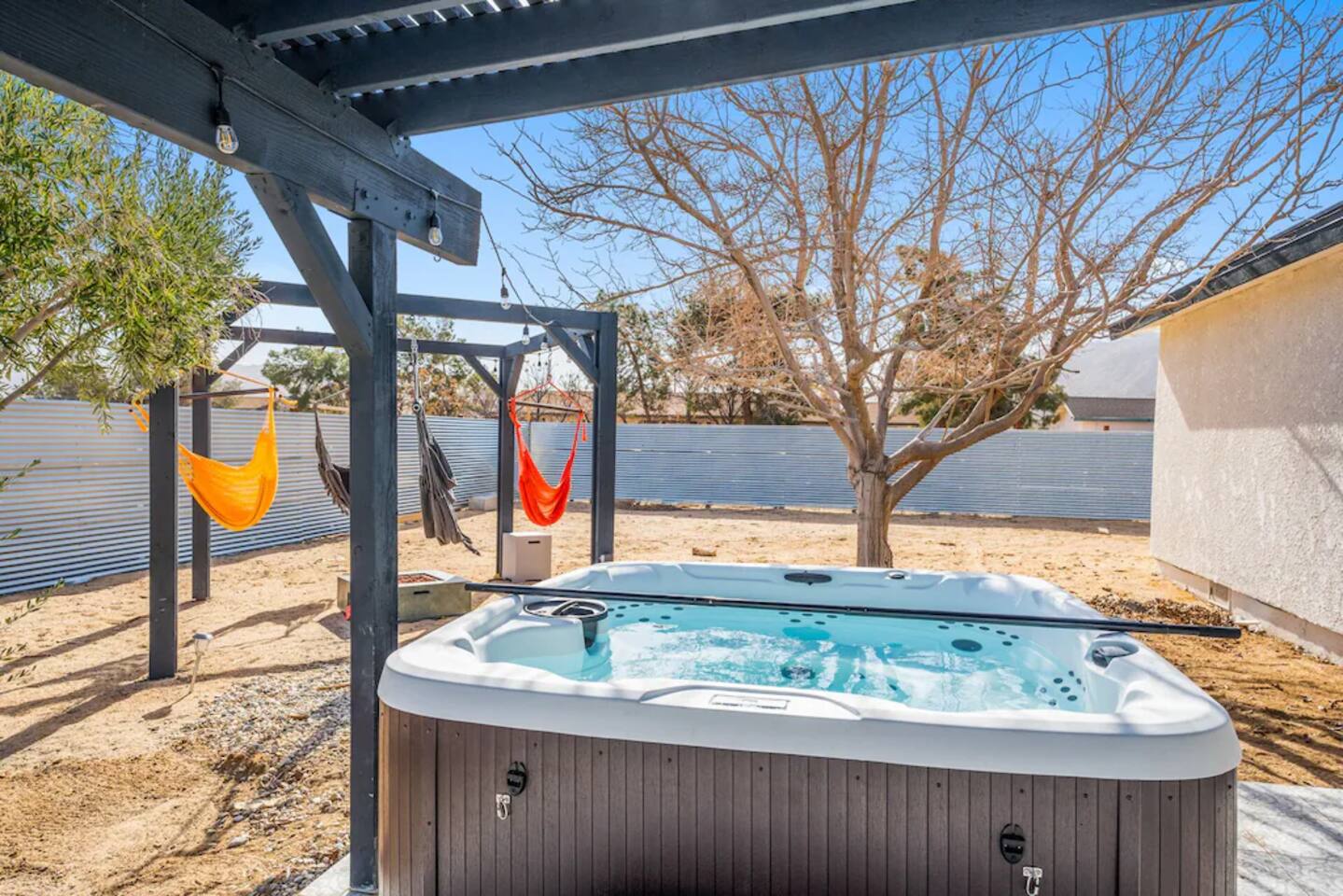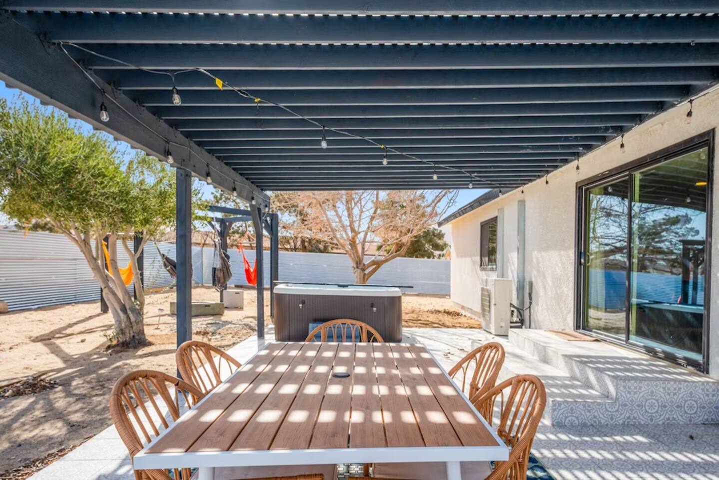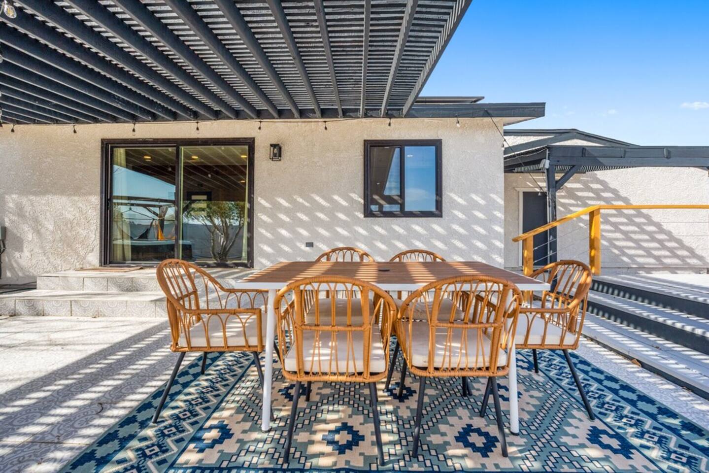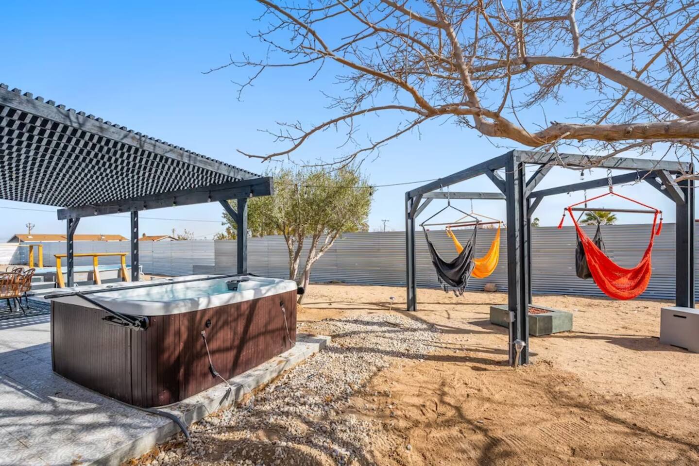 The space KEY FEATURES: ☀ 3 beautifully decorated bedrooms; 3 Queen-sized beds ☀ 2 full bathroom ☀ Open floor kitchen, dining + lounge area ☀ Fully-equipped kitchen ☀ Stocked coffee bar with assorted K-cups, whole bean coffee and coffee grounds ☀ Salt, pepper, and cooking spray are provided ☀ Large smart TV ☀ Private backyard w/ cowboy pool, hot tub, fire pit + pergola w/ hanging hammock chairs ☀ Air conditioning + central heating ☀ Dedicated workspace + wifi ☀ External security cameras covering the front door ☀ On site laundry ☀ Free parking on-site ☀ Single-level home w/ stairless access ☆☆ BEDROOMS ☆☆ This perfect desert home provides you with three beautiful bedrooms to rest your head for the night. All bedrooms are stylishly furnished with queen-sized beds and topped with extra-comfortable Zinus memory foam mattresses. Our guests rave about our luxurious mattresses! All of the spacious bedrooms are light, airy spaces and offer plenty of storage space for your clothing and personal belongings. The thoughtful touches and beautiful decor make them the perfect spot to kick back and relax after a long day seeing the sights of the desert ☆☆ BATHROOMS ☆☆ Make use of the good-sized bathrooms, complete with gorgeous tiled showers, and stylish vanity. This bright space is the perfect place for unwinding after an energetic hike through Joshua Tree National Park. ☆☆ KITCHEN & LOUNGE ☆☆ Our kitchen, dining area, and lounge are full of natural light, making it a relaxing space to gather in as a family or small group. We provide everything you need to make delicious meals, from new appliances to a dedicated coffee station. We know how important a good cup of Joe is, so our coffee station features an automatic coffee machine as well as a drip coffee kettle. Enjoy coffee your way! Bar stools are arranged around the kitchen island, making it a lovely spot for breakfast or just to chat with the chef. For formal and fun dinners, make use of the dining table. It’s set for six and overlooks the backyard, ideal for a relaxing meal. The whole space is completed with the spacious living room. Here you’ll be able to enjoy evenings in front of the smart TV, curling up with a good book, or enjoying the company of family and friends ☆☆ OUTSIDE SPACE ☆☆ Our favorite feature of our peaceful desert oasis house is the fully-fenced backyard. We’ve lovingly created a private, relaxing space for you to enjoy. Why not take advantage of our hot tub? You’ll find a heated jacuzzi, which will help you soak away any tiredness you might have from your adventures of the day. For the ultimate desert experience, turn on the pretty string lights, light up the fire pit and make some s’mores as the evening draws in. Stargazing is a must when you’re in the desert, and you can do so at the pergola, where you’ll be able to sway under the stars in a cozy hammock. ★☆ Book Today & Let Us Take Care Of You In Joshua Tree! ☆★