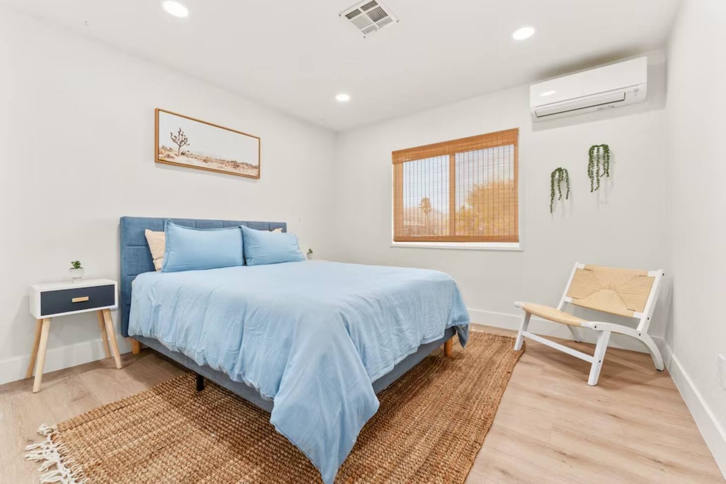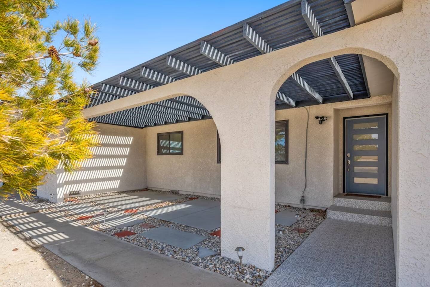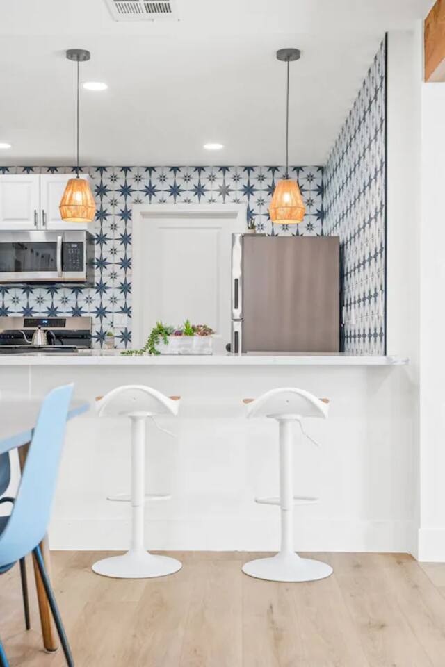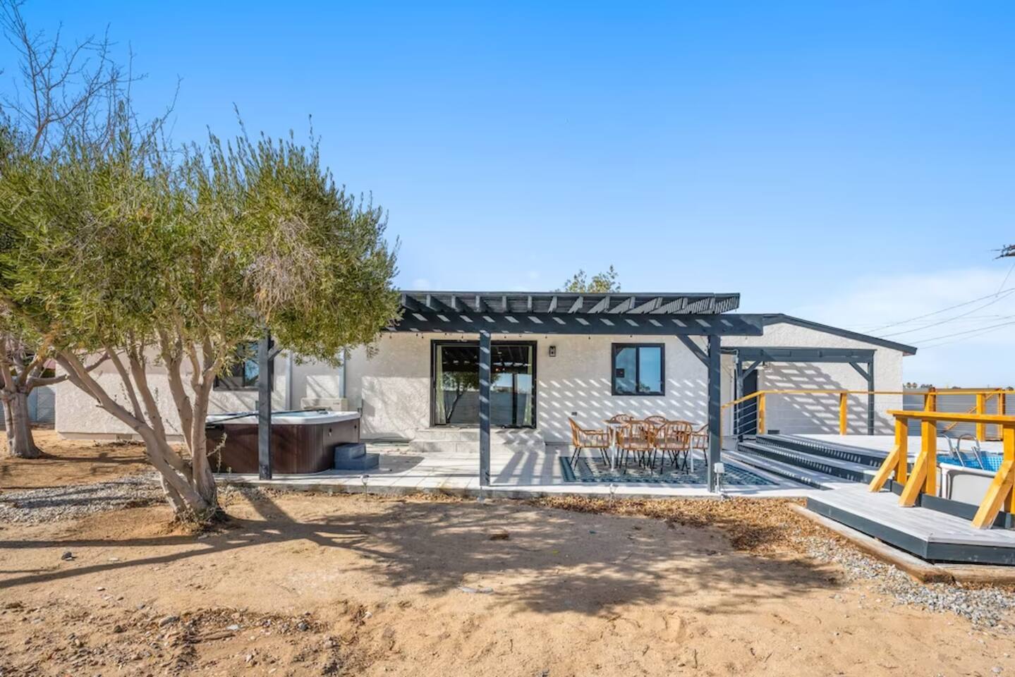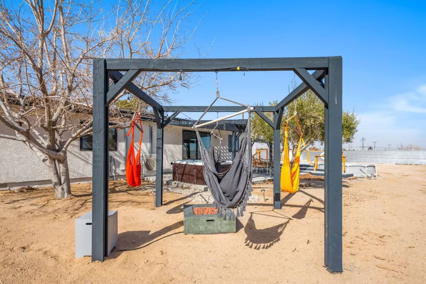 The space KEY FEATURES: ☀ 3 beautifully decorated bedrooms; 3 Queen-sized beds ☀ 2 full bathroom ☀ Open floor kitchen, dining + lounge area ☀ Fully-equipped kitchen ☀ Stocked coffee bar with assorted K-cups, whole bean coffee and coffee grounds ☀ Salt, pepper, and cooking spray are provided ☀ Large smart TV ☀ Private backyard w/ cowboy pool, hot tub, fire pit + pergola w/ hanging hammock chairs ☀ Air conditioning + central heating ☀ Dedicated workspace + wifi ☀ External security cameras covering the front door ☀ On site laundry ☀ Free parking on-site ☀ Single-level home w/ stairless access ☆☆ BEDROOMS ☆☆ This perfect desert home provides you with three beautiful bedrooms to rest your head for the night. All bedrooms are stylishly furnished with queen-sized beds and topped with extra-comfortable Zinus memory foam mattresses. Our guests rave about our luxurious mattresses! All of the spacious bedrooms are light, airy spaces and offer plenty of storage space for your clothing and personal belongings. The thoughtful touches and beautiful decor make them the perfect spot to kick back and relax after a long day seeing the sights of the desert ☆☆ BATHROOMS ☆☆ Make use of the good-sized bathrooms, complete with gorgeous tiled showers, and stylish vanity. This bright space is the perfect place for unwinding after an energetic hike through Joshua Tree National Park. ☆☆ KITCHEN & LOUNGE ☆☆ Our kitchen, dining area, and lounge are full of natural light, making it a relaxing space to gather in as a family or small group. We provide everything you need to make delicious meals, from new appliances to a dedicated coffee station. We know how important a good cup of Joe is, so our coffee station features an automatic coffee machine as well as a drip coffee kettle. Enjoy coffee your way! Bar stools are arranged around the kitchen island, making it a lovely spot for breakfast or just to chat with the chef. For formal and fun dinners, make use of the dining table. It’s set for six and overlooks the backyard, ideal for a relaxing meal. The whole space is completed with the spacious living room. Here you’ll be able to enjoy evenings in front of the smart TV, curling up with a good book, or enjoying the company of family and friends ☆☆ OUTSIDE SPACE ☆☆ Our favorite feature of our peaceful desert oasis house is the fully-fenced backyard. We’ve lovingly created a private, relaxing space for you to enjoy. Why not take advantage of our hot tub? You’ll find a heated jacuzzi, which will help you soak away any tiredness you might have from your adventures of the day. For the ultimate desert experience, turn on the pretty string lights, light up the fire pit and make some s’mores as the evening draws in. Stargazing is a must when you’re in the desert, and you can do so at the pergola, where you’ll be able to sway under the stars in a cozy hammock. ★☆ Book Today & Let Us Take Care Of You In Joshua Tree! ☆★