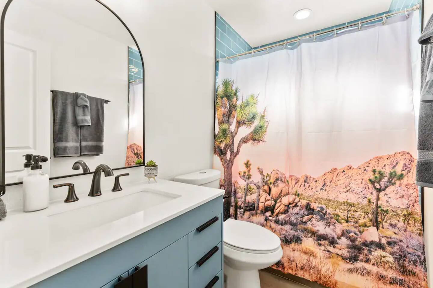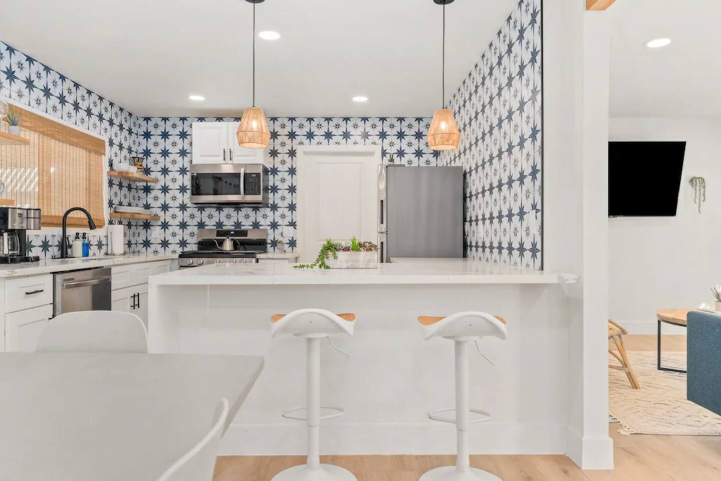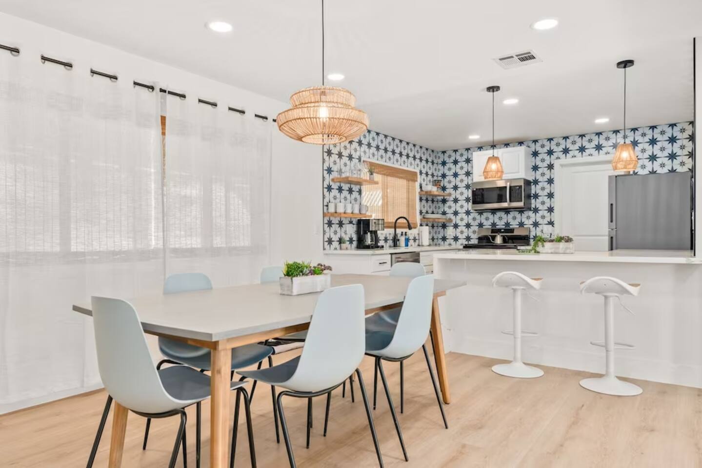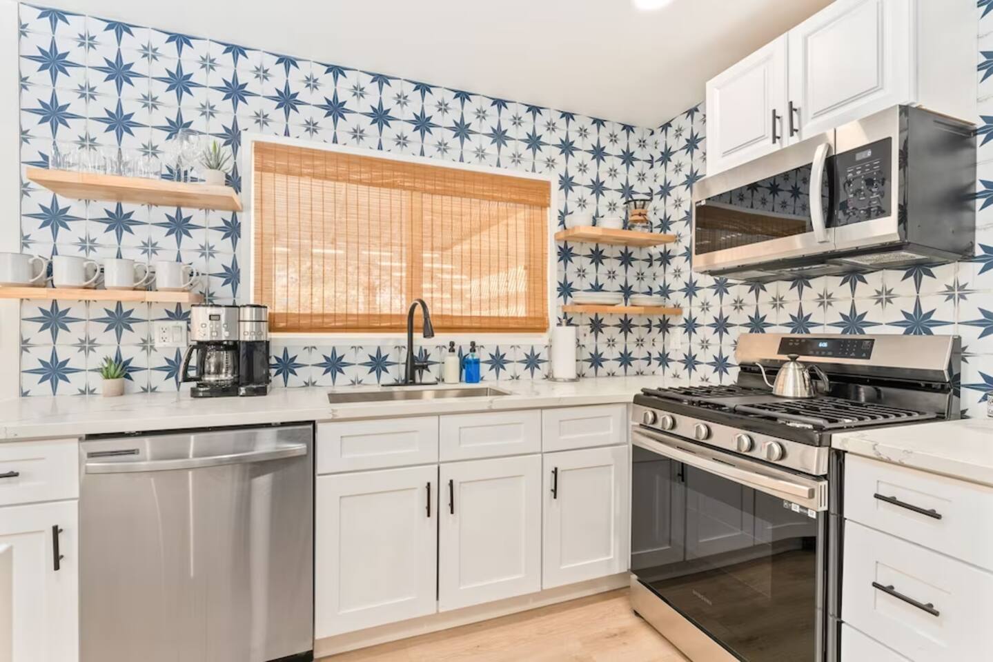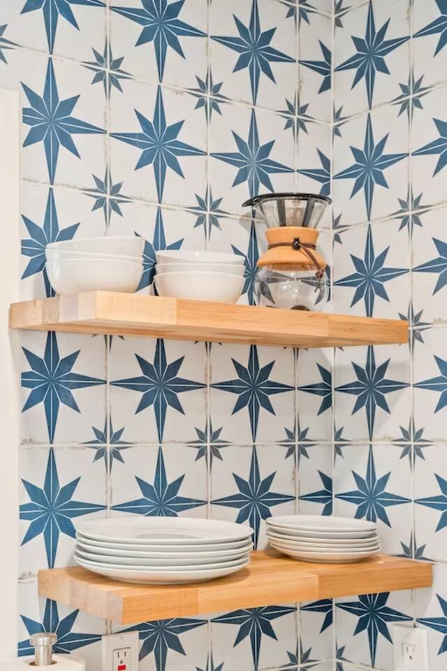 The space KEY FEATURES: ☀ 3 beautifully decorated bedrooms; 3 Queen-sized beds ☀ 2 full bathroom ☀ Open floor kitchen, dining + lounge area ☀ Fully-equipped kitchen ☀ Stocked coffee bar with assorted K-cups, whole bean coffee and coffee grounds ☀ Salt, pepper, and cooking spray are provided ☀ Large smart TV ☀ Private backyard w/ cowboy pool, hot tub, fire pit + pergola w/ hanging hammock chairs ☀ Air conditioning + central heating ☀ Dedicated workspace + wifi ☀ External security cameras covering the front door ☀ On site laundry ☀ Free parking on-site ☀ Single-level home w/ stairless access ☆☆ BEDROOMS ☆☆ This perfect desert home provides you with three beautiful bedrooms to rest your head for the night. All bedrooms are stylishly furnished with queen-sized beds and topped with extra-comfortable Zinus memory foam mattresses. Our guests rave about our luxurious mattresses! All of the spacious bedrooms are light, airy spaces and offer plenty of storage space for your clothing and personal belongings. The thoughtful touches and beautiful decor make them the perfect spot to kick back and relax after a long day seeing the sights of the desert ☆☆ BATHROOMS ☆☆ Make use of the good-sized bathrooms, complete with gorgeous tiled showers, and stylish vanity. This bright space is the perfect place for unwinding after an energetic hike through Joshua Tree National Park. ☆☆ KITCHEN & LOUNGE ☆☆ Our kitchen, dining area, and lounge are full of natural light, making it a relaxing space to gather in as a family or small group. We provide everything you need to make delicious meals, from new appliances to a dedicated coffee station. We know how important a good cup of Joe is, so our coffee station features an automatic coffee machine as well as a drip coffee kettle. Enjoy coffee your way! Bar stools are arranged around the kitchen island, making it a lovely spot for breakfast or just to chat with the chef. For formal and fun dinners, make use of the dining table. It’s set for six and overlooks the backyard, ideal for a relaxing meal. The whole space is completed with the spacious living room. Here you’ll be able to enjoy evenings in front of the smart TV, curling up with a good book, or enjoying the company of family and friends ☆☆ OUTSIDE SPACE ☆☆ Our favorite feature of our peaceful desert oasis house is the fully-fenced backyard. We’ve lovingly created a private, relaxing space for you to enjoy. Why not take advantage of our hot tub? You’ll find a heated jacuzzi, which will help you soak away any tiredness you might have from your adventures of the day. For the ultimate desert experience, turn on the pretty string lights, light up the fire pit and make some s’mores as the evening draws in. Stargazing is a must when you’re in the desert, and you can do so at the pergola, where you’ll be able to sway under the stars in a cozy hammock. ★☆ Book Today & Let Us Take Care Of You In Joshua Tree! ☆★