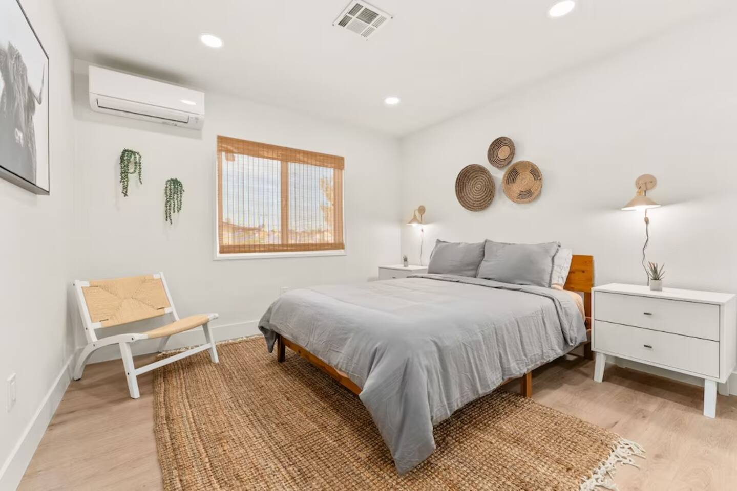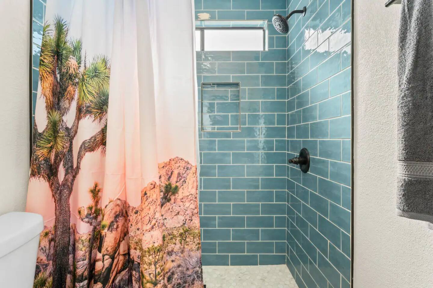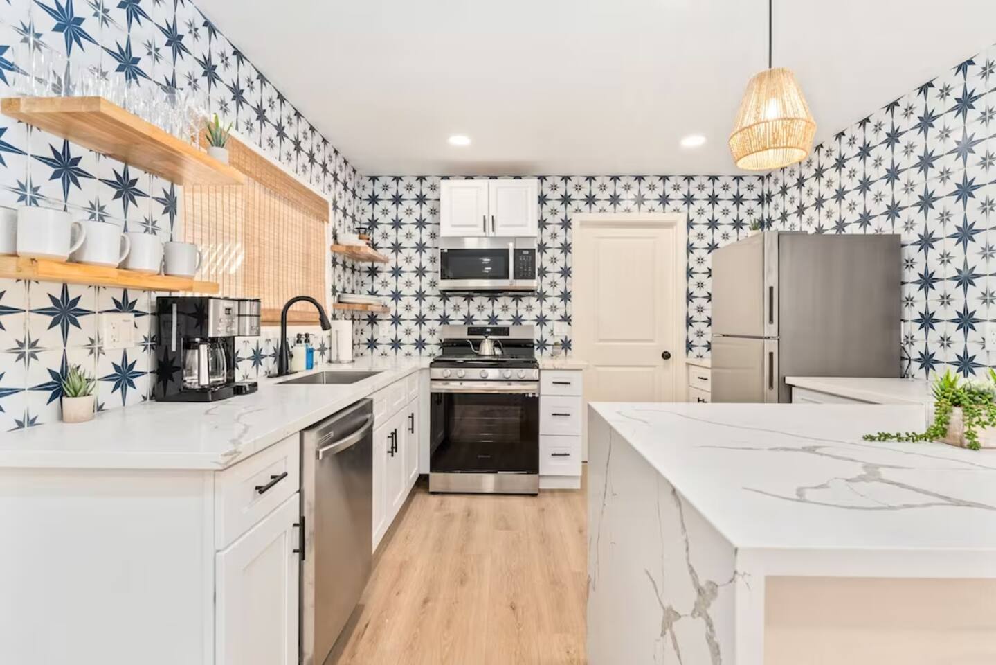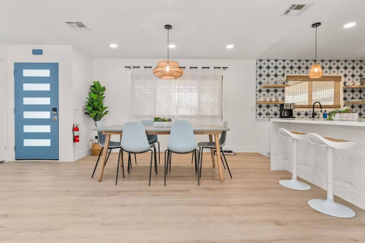 The space KEY FEATURES: ☀ 3 beautifully decorated bedrooms; 3 Queen-sized beds ☀ 2 full bathroom ☀ Open floor kitchen, dining + lounge area ☀ Fully-equipped kitchen ☀ Stocked coffee bar with assorted K-cups, whole bean coffee and coffee grounds ☀ Salt, pepper, and cooking spray are provided ☀ Large smart TV ☀ Private backyard w/ cowboy pool, hot tub, fire pit + pergola w/ hanging hammock chairs ☀ Air conditioning + central heating ☀ Dedicated workspace + wifi ☀ External security cameras covering the front door ☀ On site laundry ☀ Free parking on-site ☀ Single-level home w/ stairless access ☆☆ BEDROOMS ☆☆ This perfect desert home provides you with three beautiful bedrooms to rest your head for the night. All bedrooms are stylishly furnished with queen-sized beds and topped with extra-comfortable Zinus memory foam mattresses. Our guests rave about our luxurious mattresses! All of the spacious bedrooms are light, airy spaces and offer plenty of storage space for your clothing and personal belongings. The thoughtful touches and beautiful decor make them the perfect spot to kick back and relax after a long day seeing the sights of the desert ☆☆ BATHROOMS ☆☆ Make use of the good-sized bathrooms, complete with gorgeous tiled showers, and stylish vanity. This bright space is the perfect place for unwinding after an energetic hike through Joshua Tree National Park. ☆☆ KITCHEN & LOUNGE ☆☆ Our kitchen, dining area, and lounge are full of natural light, making it a relaxing space to gather in as a family or small group. We provide everything you need to make delicious meals, from new appliances to a dedicated coffee station. We know how important a good cup of Joe is, so our coffee station features an automatic coffee machine as well as a drip coffee kettle. Enjoy coffee your way! Bar stools are arranged around the kitchen island, making it a lovely spot for breakfast or just to chat with the chef. For formal and fun dinners, make use of the dining table. It’s set for six and overlooks the backyard, ideal for a relaxing meal. The whole space is completed with the spacious living room. Here you’ll be able to enjoy evenings in front of the smart TV, curling up with a good book, or enjoying the company of family and friends ☆☆ OUTSIDE SPACE ☆☆ Our favorite feature of our peaceful desert oasis house is the fully-fenced backyard. We’ve lovingly created a private, relaxing space for you to enjoy. Why not take advantage of our hot tub? You’ll find a heated jacuzzi, which will help you soak away any tiredness you might have from your adventures of the day. For the ultimate desert experience, turn on the pretty string lights, light up the fire pit and make some s’mores as the evening draws in. Stargazing is a must when you’re in the desert, and you can do so at the pergola, where you’ll be able to sway under the stars in a cozy hammock. ★☆ Book Today & Let Us Take Care Of You In Joshua Tree! ☆★