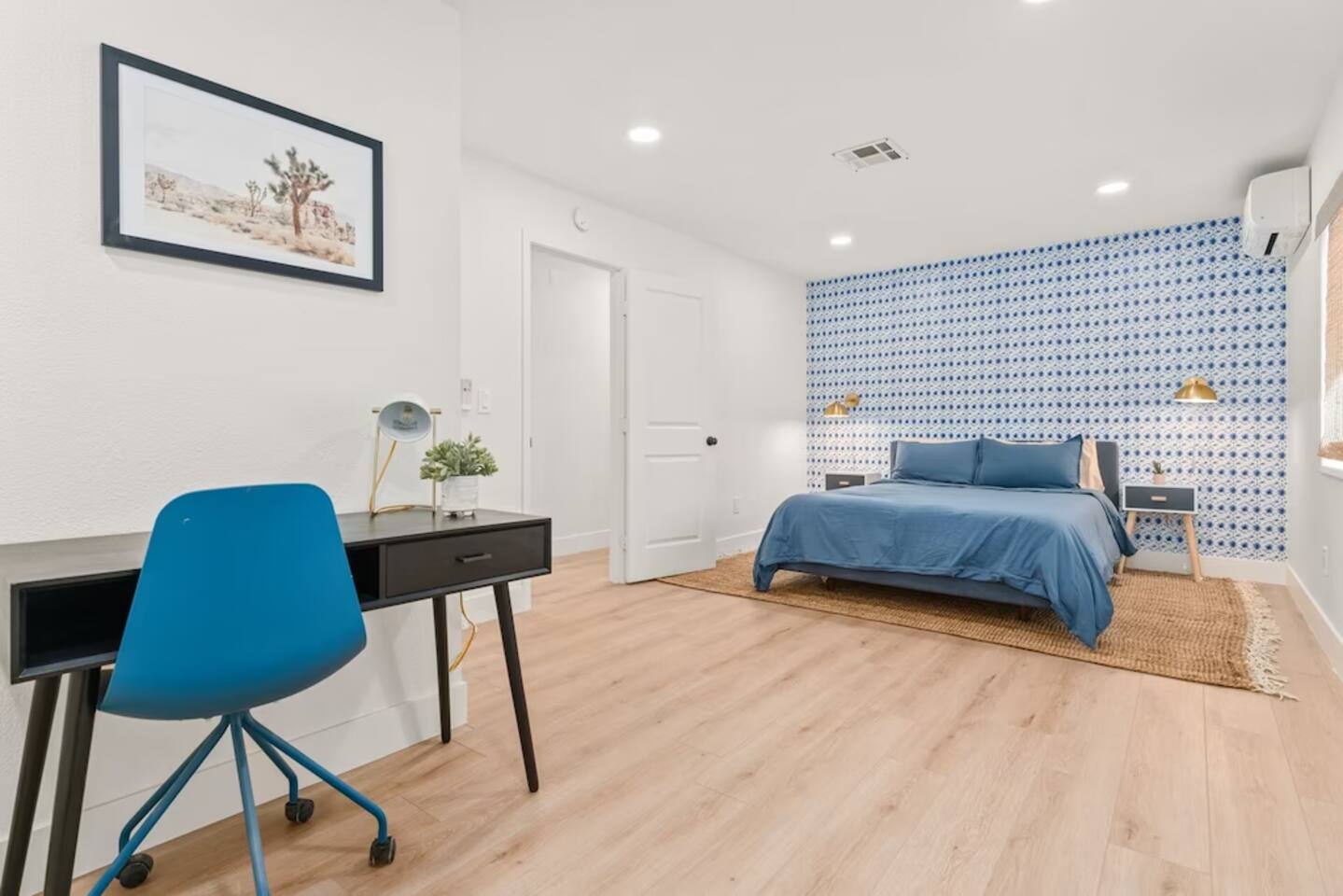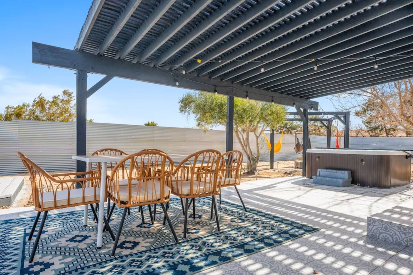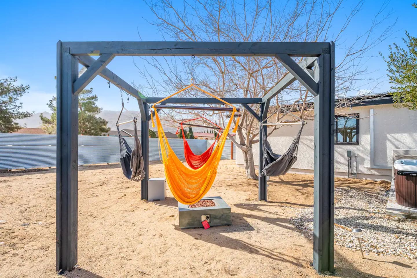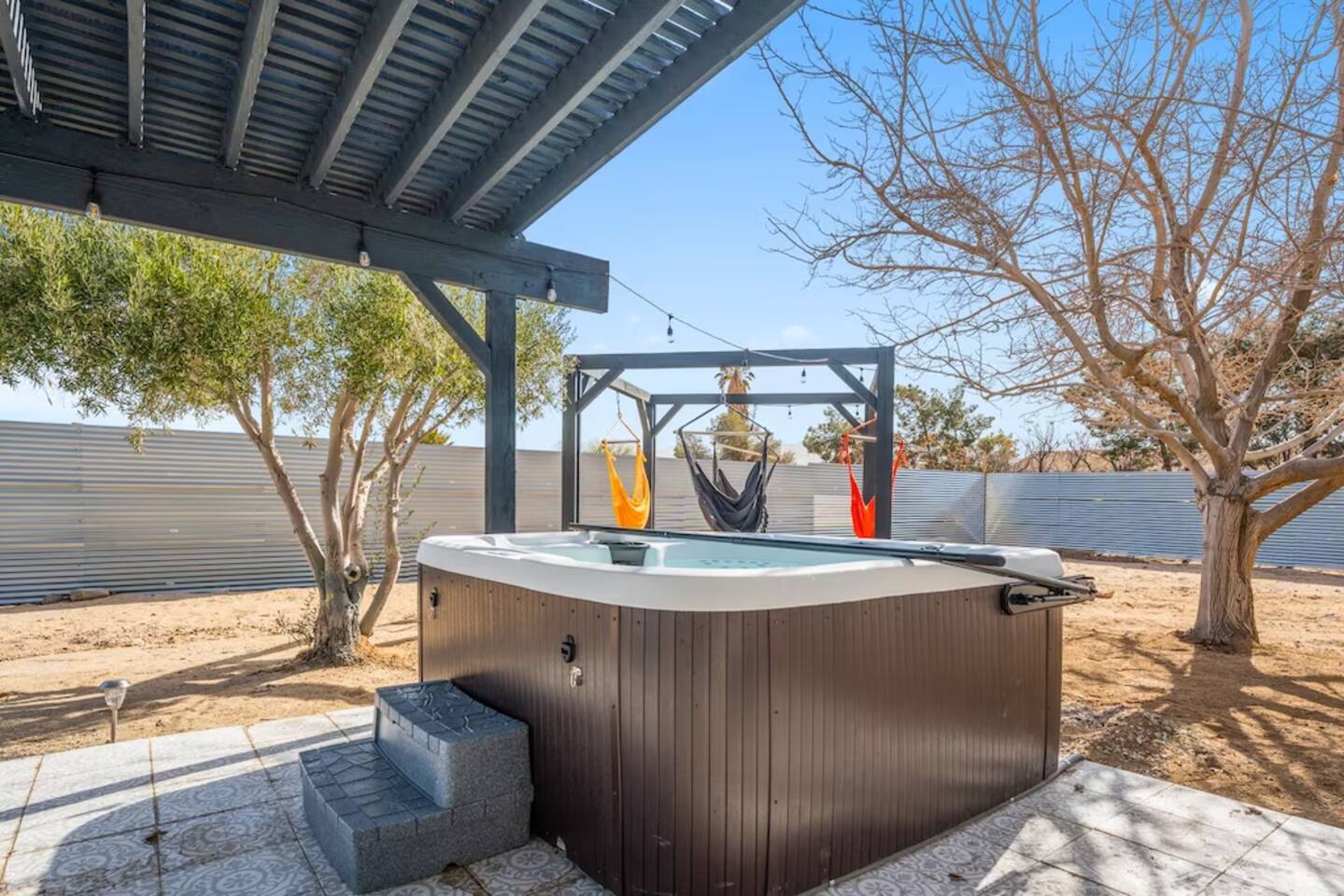 It’s easy to imagine yourself unwinding beneath the palm trees at this beautifully remodeled home. Designed for families and small groups, it’s the perfect place to rest, recharge, and enjoy the desert landscape. The outdoor space features a hot tub, fire pit, and hammocks—perfect for stargazing under the night sky. 6 Min Drive to Joshua Tree National Park (East Entrance) 7 min to Stater Bros Grocery Store 20 Min Drive to Downtown Joshua Tree