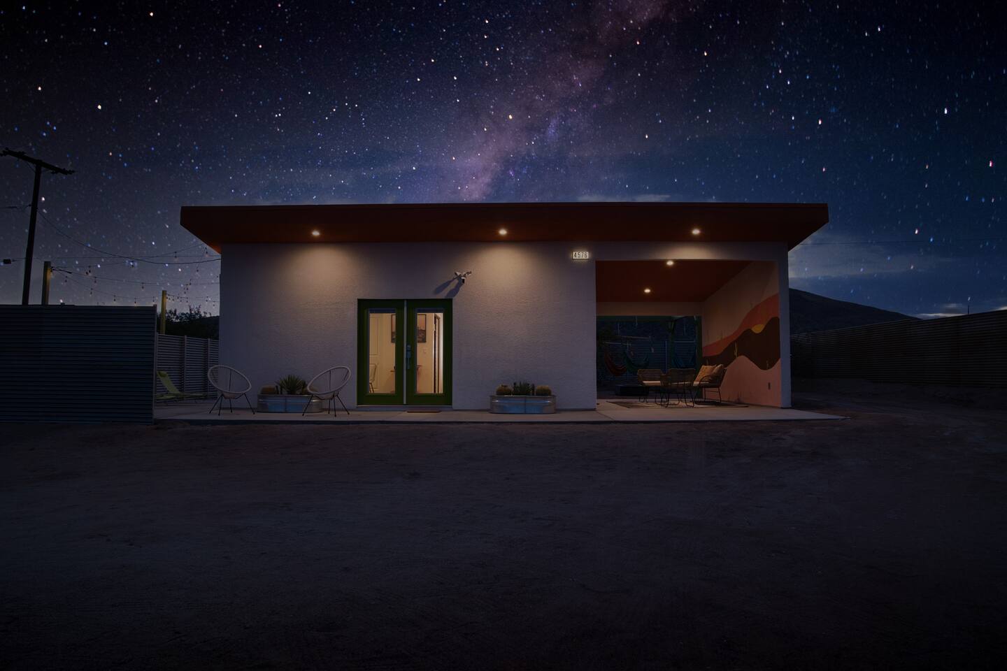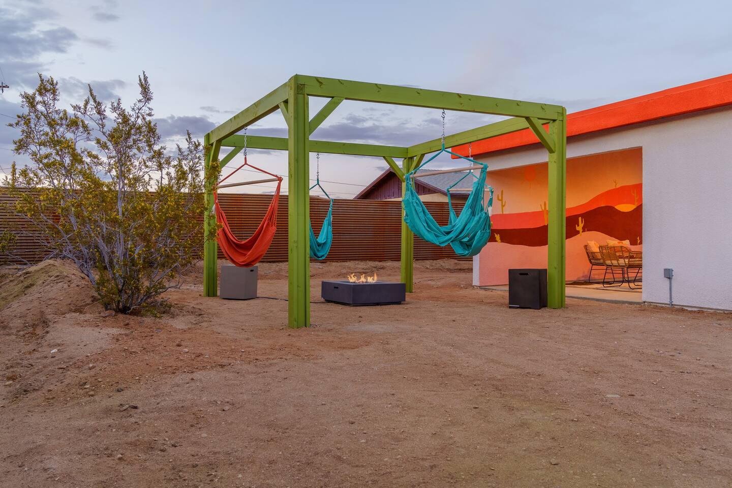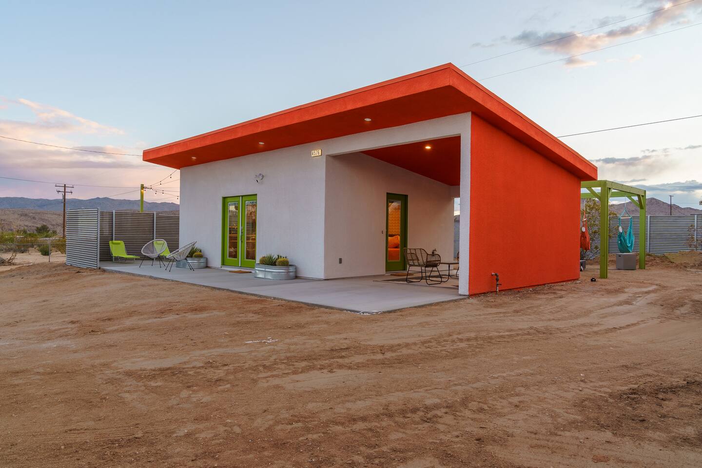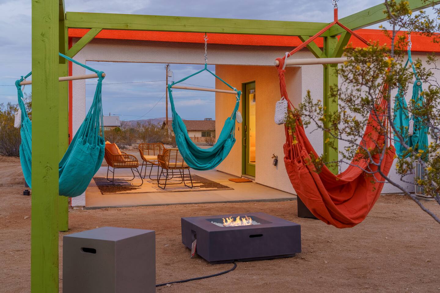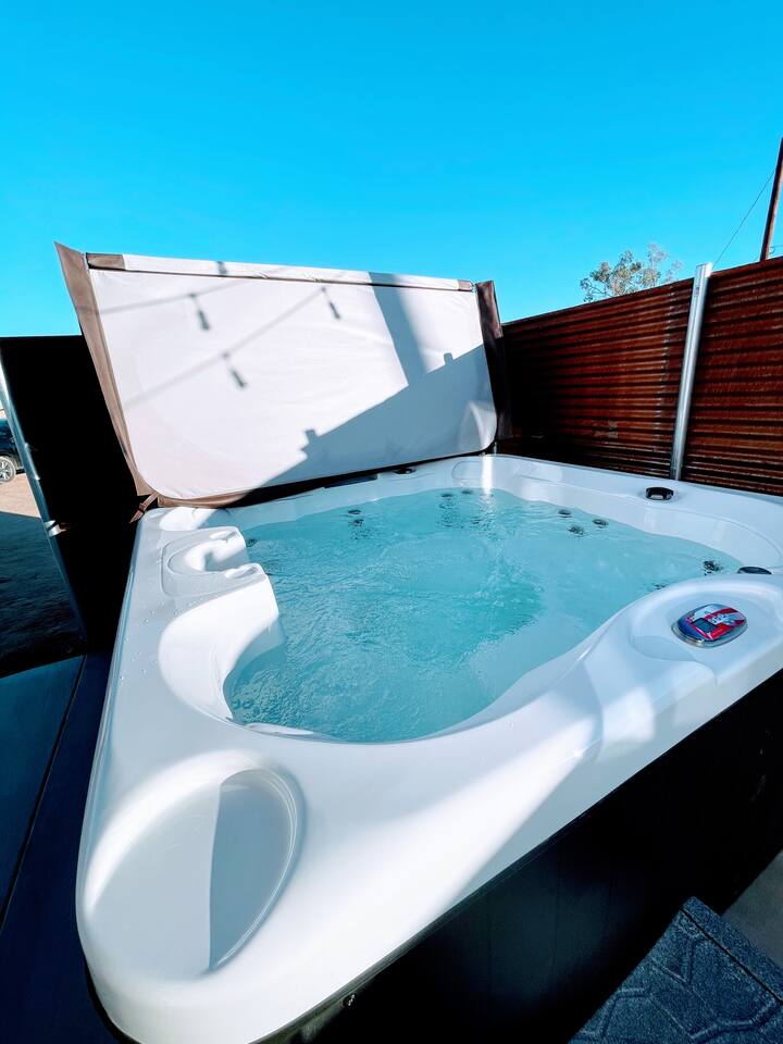 Leave the everyday behind and unwind beneath the desert stars in our spacious, design-forward tiny home. Perfect for couples or small groups, this peaceful retreat features a private hot tub, crackling fire pit, and a dreamy pergola with hanging hammock chairs—ideal for stargazing, storytelling, and slow evenings under the sky. 15 Mins Drive to the West Entrance to Joshua Tree National Park 5 Mins drive to downtown JT 12 Mins drive to Walmart Relax, Enjoy and Explore Joshua Tree!