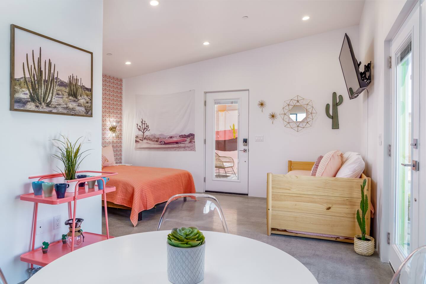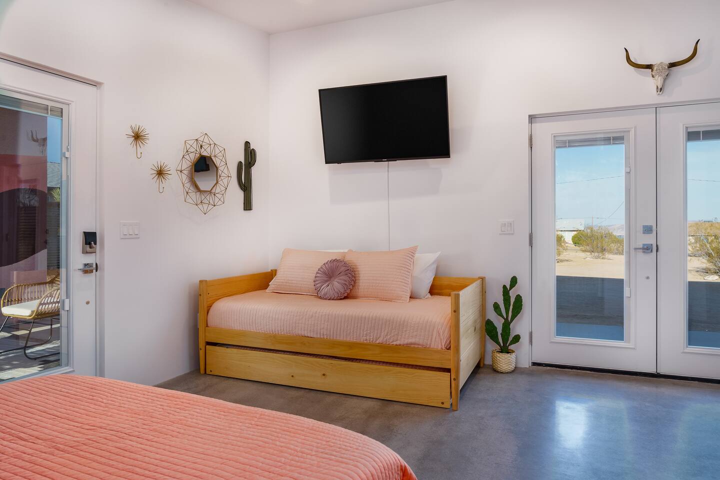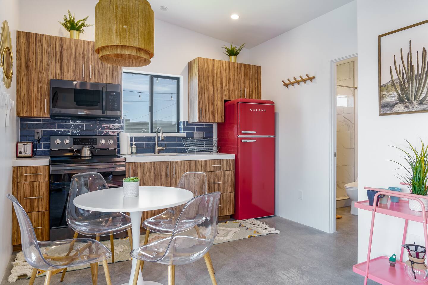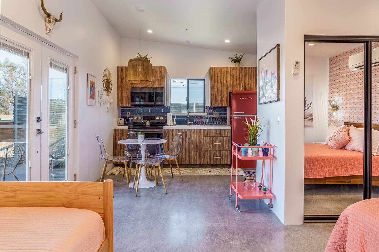KEY FEATURES ☀ Spacious 391 square foot studio with 1 Queen sized bed and 2 Twin size trundle beds ☀ 1 full bathroom. ☀ Full kitchen, with all the tools needed to make a delicious meal! (there is no dishwasher available) ☀ Stocked coffee bar with assorted K-cups, whole bean coffee and coffee grounds ☀ Salt, pepper, and cooking spray are provided ☀ 55” flat screen TV with access to all streaming platforms (logins not provided) ☀ Free WiFi ☀ Washer + dryer ☀ Easy access; no steps to entry ☀ Fully fenced in backyard with hot tub, propane firepit, and pergola with handing hammock chairs ☀ Convenient location; short drive to National Park, restaurants and activities ☀ Beautiful Views of Joshua Tree Mountain Range ☆☆ BEDROOM & LIVING AREA ☆☆ Ultimate comfort and relaxation awaits you on our Queen size bed with Zinus memory foam mattress. There are also two Twin size trundle beds perfect for additional guests or kids. (FYI, there is no wall/room that separates these beds from one another. You will all be sleeping in the same “room”) You can have a cozy movie night relaxing in bed and watch your favorite shows on the 55” TV. Netflix, Hulu and Disney+ are available for your use, but you will need to provide your own login ☆☆ BATHROOMS ☆☆ There is one full size bathroom complete with plush bath linen, towels for the spa, hairdryer and first aid kit ☆☆ KITCHEN & DINING ROOM ☆☆ The fully equipped kitchen has everything you’ll need for whipping up tasty meals for the whole group, including stainless steel appliances, a toaster, a blender, a coffee machine, a Keurig, and all the basic kitchen essentials like pots, pans, plates, cups, and utensils. Enjoy meals together at the kitchen table with seating for 4. There is a stocked coffee bar with assorted K-cups, whole bean coffee and coffee grounds. Salt, pepper, and cooking spray are also included! ☆☆ OUTSIDE SPACE ☆☆ Step outside and into your private desert oasis. The best part about coming to Joshua Tree is being able to enjoy the outdoors and we think the backyard will do just that. The backyard features a hot tub, great for soaking in after long days hiking in the national park, as well as a fire pit surrounded by a pergola with hanging hammock chairs which is perfect for enjoying the starry night skies. ★☆ Book Today & Let Us Take Care Of You In Joshua Tree! ☆★