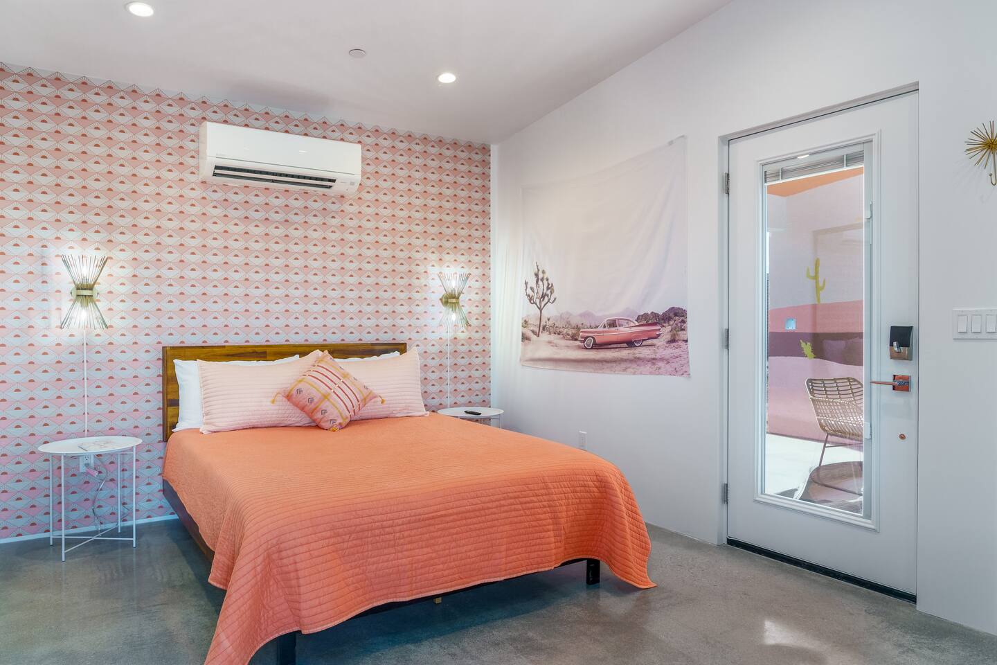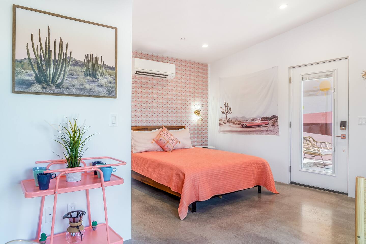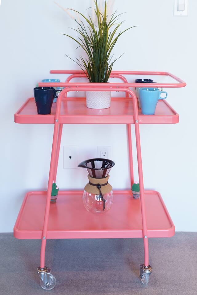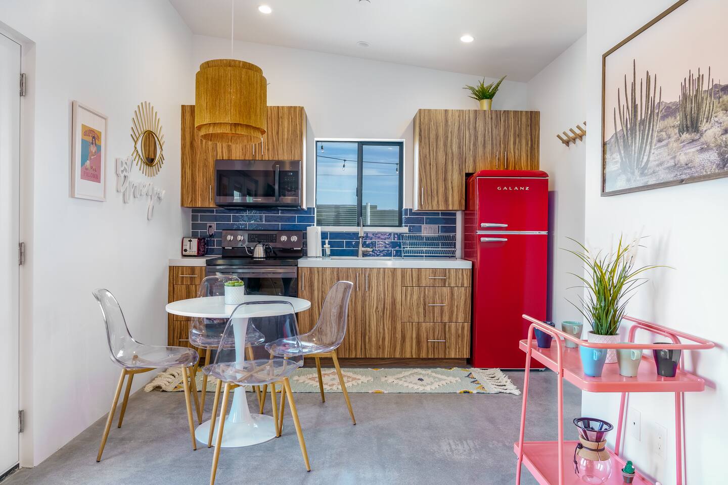 KEY FEATURES ☀ Spacious 391 square foot studio with 1 Queen sized bed and 2 Twin size trundle beds ☀ 1 full bathroom. ☀ Full kitchen, with all the tools needed to make a delicious meal! (there is no dishwasher available) ☀ Stocked coffee bar with assorted K-cups, whole bean coffee and coffee grounds ☀ Salt, pepper, and cooking spray are provided ☀ 55” flat screen TV with access to all streaming platforms (logins not provided) ☀ Free WiFi ☀ Washer + dryer ☀ Easy access; no steps to entry ☀ Fully fenced in backyard with hot tub, propane firepit, and pergola with handing hammock chairs ☀ Convenient location; short drive to National Park, restaurants and activities ☀ Beautiful Views of Joshua Tree Mountain Range ☆☆ BEDROOM & LIVING AREA ☆☆ Ultimate comfort and relaxation awaits you on our Queen size bed with Zinus memory foam mattress. There are also two Twin size trundle beds perfect for additional guests or kids. (FYI, there is no wall/room that separates these beds from one another. You will all be sleeping in the same “room”) You can have a cozy movie night relaxing in bed and watch your favorite shows on the 55” TV. Netflix, Hulu and Disney+ are available for your use, but you will need to provide your own login ☆☆ BATHROOMS ☆☆ There is one full size bathroom complete with plush bath linen, towels for the spa, hairdryer and first aid kit ☆☆ KITCHEN & DINING ROOM ☆☆ The fully equipped kitchen has everything you’ll need for whipping up tasty meals for the whole group, including stainless steel appliances, a toaster, a blender, a coffee machine, a Keurig, and all the basic kitchen essentials like pots, pans, plates, cups, and utensils. Enjoy meals together at the kitchen table with seating for 4. There is a stocked coffee bar with assorted K-cups, whole bean coffee and coffee grounds. Salt, pepper, and cooking spray are also included! ☆☆ OUTSIDE SPACE ☆☆ Step outside and into your private desert oasis. The best part about coming to Joshua Tree is being able to enjoy the outdoors and we think the backyard will do just that. The backyard features a hot tub, great for soaking in after long days hiking in the national park, as well as a fire pit surrounded by a pergola with hanging hammock chairs which is perfect for enjoying the starry night skies. ★☆ Book Today & Let Us Take Care Of You In Joshua Tree! ☆★