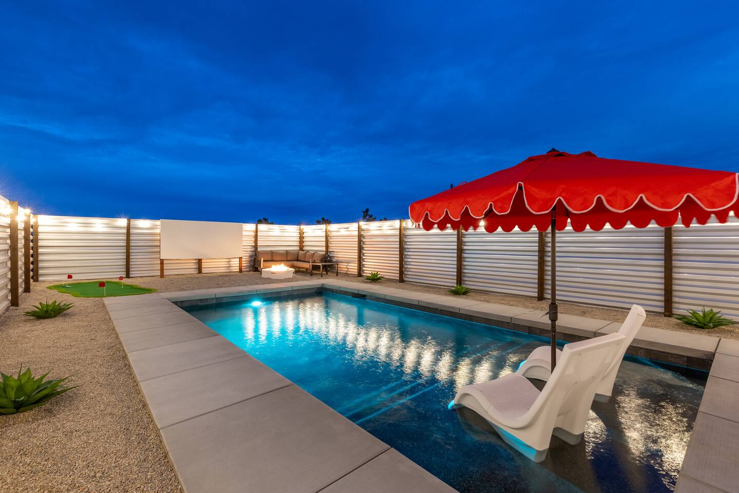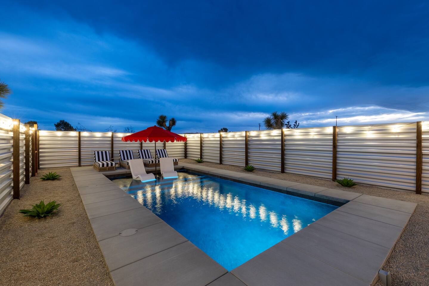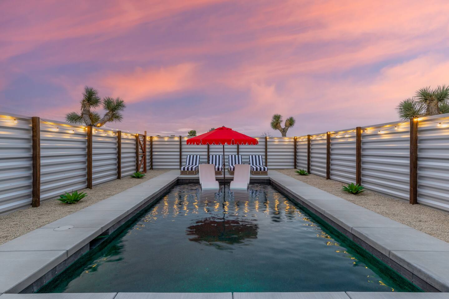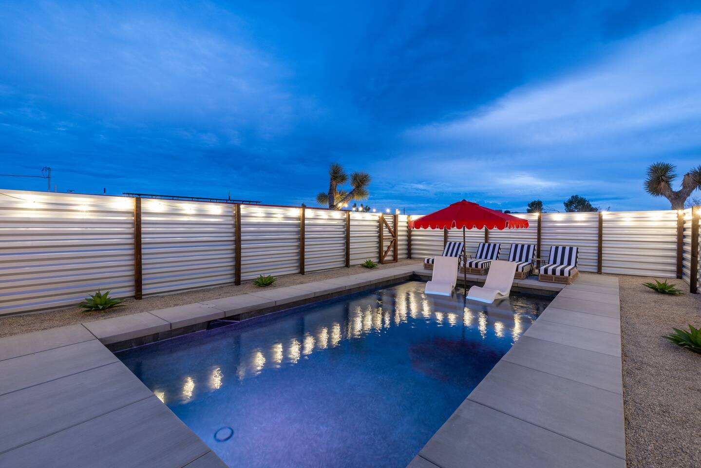 🛸 The Ultimate Outdoor Space Prepare to be amazed by your private, fully-fenced backyard retreat. We've created a luxurious space perfect for enjoying the sunny days and even more incredible desert nights! 👽New In-Ground Pool: Dive into the brand-new, in-ground pool for a refreshing dip, or request to have it heated for a cozy night swim! The pool goes up to 5 feet deep but also includes a nice sized "lounge step" that's great for tanning or just chilling out while you stream your favorite show directly in front of the pool on the screen! 👽Outdoor Movie Nights: Enhance your evening with an unforgettable viewing experience! Grab a spot on the lounge chairs or a floatie in the pool and enjoy your favorite films on the large outdoor projector screen. You can log in to your own streaming accounts to access all your favorites! 👽Star-Gazing Comfort: The backyard also includes a fire pit and sectional where you can cozy up, while the front yard also has a traditional desert cowboy tub, and a pergola with hanging hammock chairs in front of another fire pit for comfortable, classic Joshua Tree stargazing under the ambient string lights. 👽Jacuzzi: Slip into the perfectly heated Jacuzzi to soak away the day's adventures and chill under the stars! KEY FEATURES ☀ INSANE outdoor amenities - pool/hot tub/fire pits/projector/putting green ☀ Spacious 2 bedroom tiny home with 2 King size beds ☀ 1 full bathroom ☀ Full kitchen, with stainless steel and all the tools needed to make a delicious meal! ☀ Stocked coffee bar with assorted K-cups, whole bean coffee and coffee grounds ☀ Salt, pepper, and cooking spray are provided ☀ 55” flat screen TV with access to all streaming platforms (logins not provided) ☀ Free WiFi ☀ Washer + dryer ☀ Easy access; no steps to entry ☀ Convenient location; short drive to National Park, restaurants and activities ☀️ Important Pool Information 🔥Heating Fee: The in-ground pool can be heated to 80F degrees for an additional fee of $200/day. This fee must be paid in full prior to your arrival. - A minimum notice of 24 hours is needed to have the pool heated for your arrival, as it takes time to warm such a large body of water. 🛟Safety: Swim at your own risk. No lifeguard is present. No diving in the pool or spa. 🧰Maintenance: Pool maintenance occurs every Monday afternoon. The pool is available for use before and after maintenance and the technician is completely out of your way when they swing by! 🦩Pool Toys: Pool toys are not provided—feel free to bring your own! ☆☆ BEDROOMS☆☆ Even space travelers need to sleep and when you do, relax in ultimate comfort on a King size bed Zinus memory foam mattress. Two spacious bedrooms provide you with plenty of privacy and space and the ability to rest and recharge for another day of adventure. ☆☆ BATHROOMS ☆☆ There is one full size bathroom complete with plush bath linen, towels for the spa, hairdryer and first aid kit ☆☆ LIVING ROOM ☆☆ Whether you’re in need of an afternoon nap after a long day of exploration and space travel or simply a spot to hang out with friends or family, the living room is the perfect place. You’ll have access to multiple streaming services on the 55” flat-screen TV, and there’s also a fireplace to get you in the desert vibe. ☆☆ KITCHEN & DINING ROOM ☆☆ The fully equipped kitchen has everything you’ll need for whipping up tasty meals for the whole group, including stainless steel appliances, a toaster, a blender, a coffee machine, a Keurig, and all the basic kitchen essentials like pots, pans, plates, cups, and utensils. Enjoy meals together at the kitchen table with seating for 6. There is a stocked coffee bar with assorted K-cups, whole bean coffee and coffee grounds. Salt, pepper, and cooking spray are also included! ☆☆ OUTSIDE SPACE ☆☆ Step outside and into your own desert oasis. The entire yard is fenced in, not only for your privacy, but also so your furry friends can safely explore! Feel free to shut the front gate to fully enclose the yard. The best part about coming to Joshua Tree is being able to enjoy the outdoors and we think the yard will do just that. The neighborhood is pretty quiet and you most likely won’t even see or hear anyone! ★☆ Book Today & Let Us Take Care Of You In Joshua Tree! ☆★