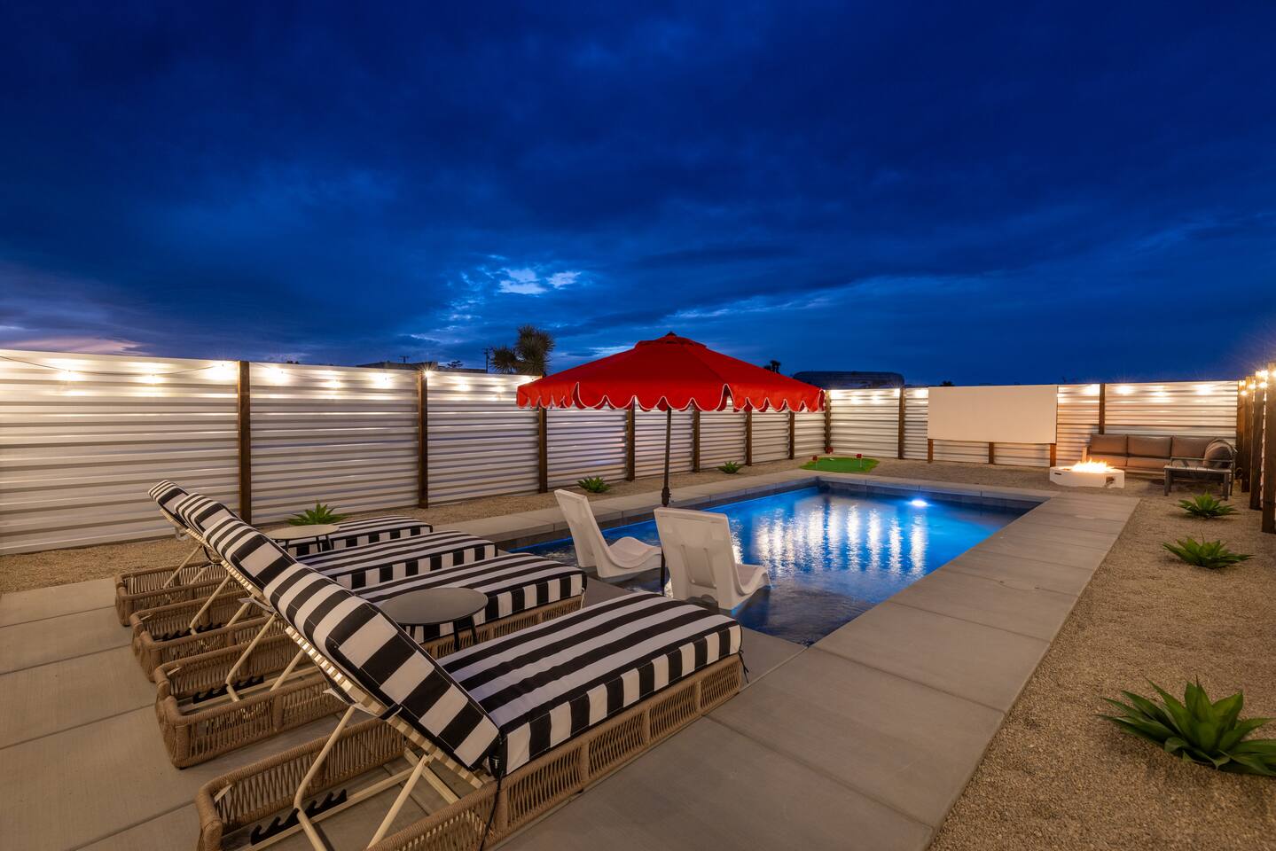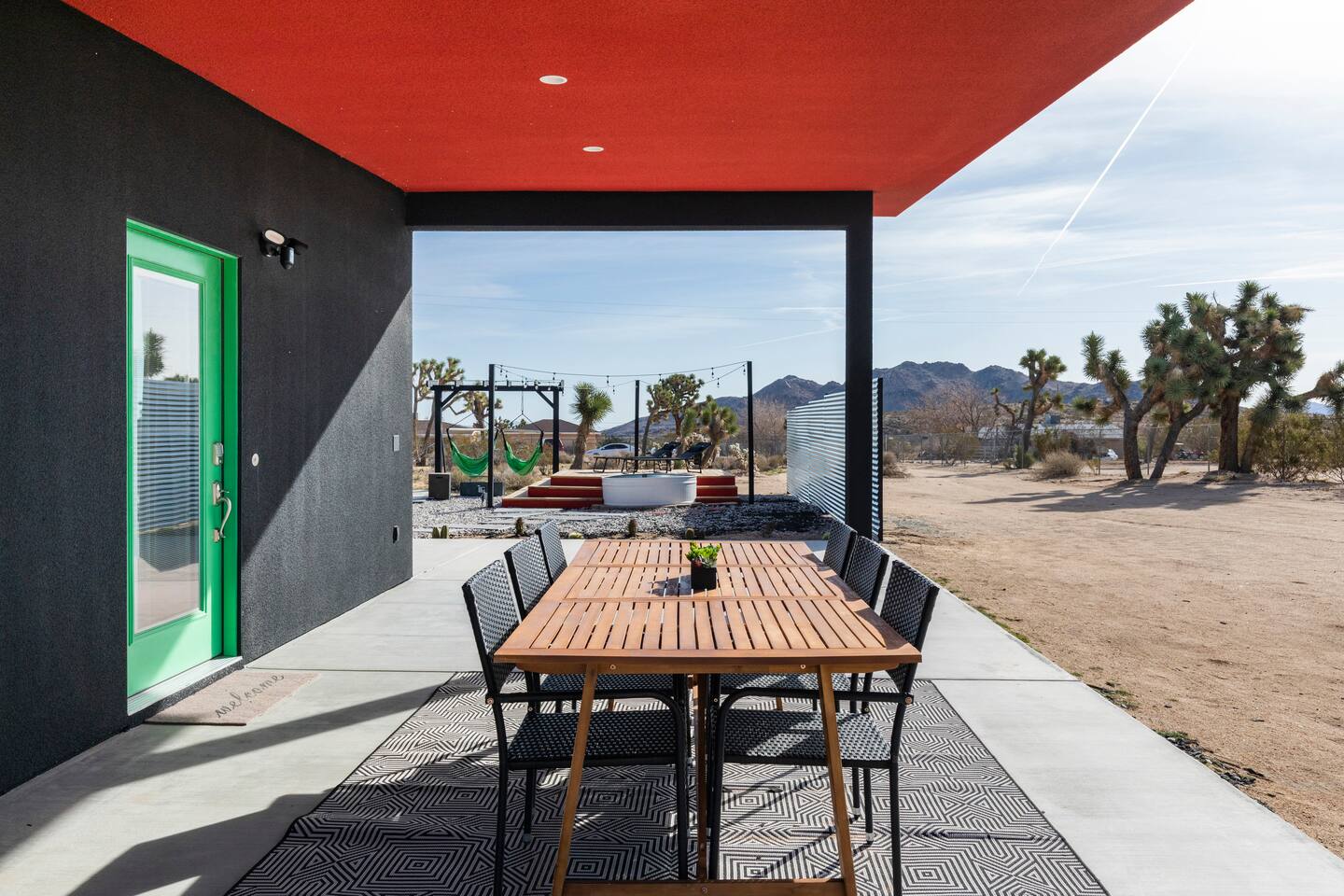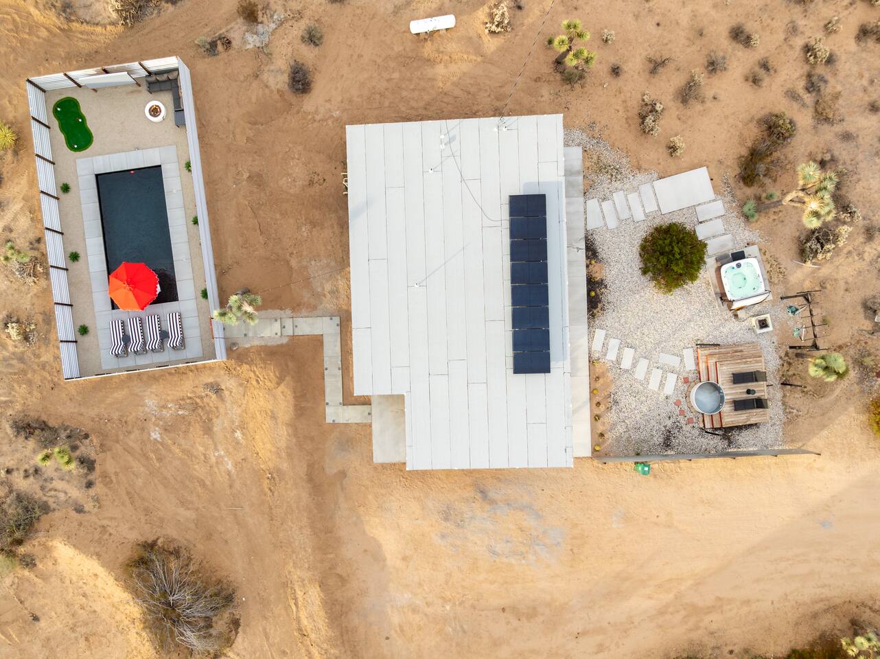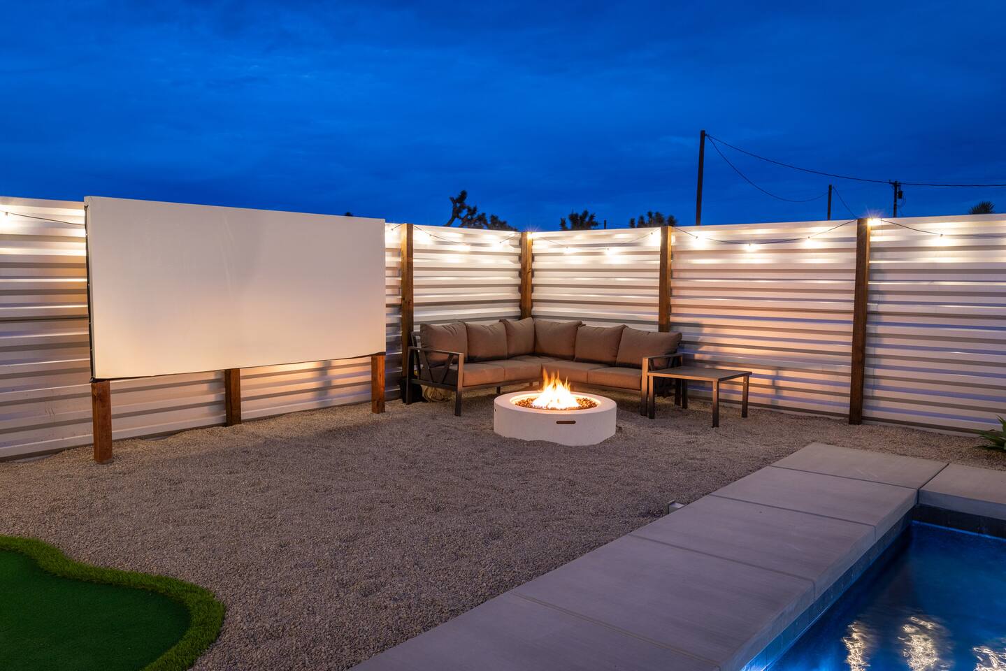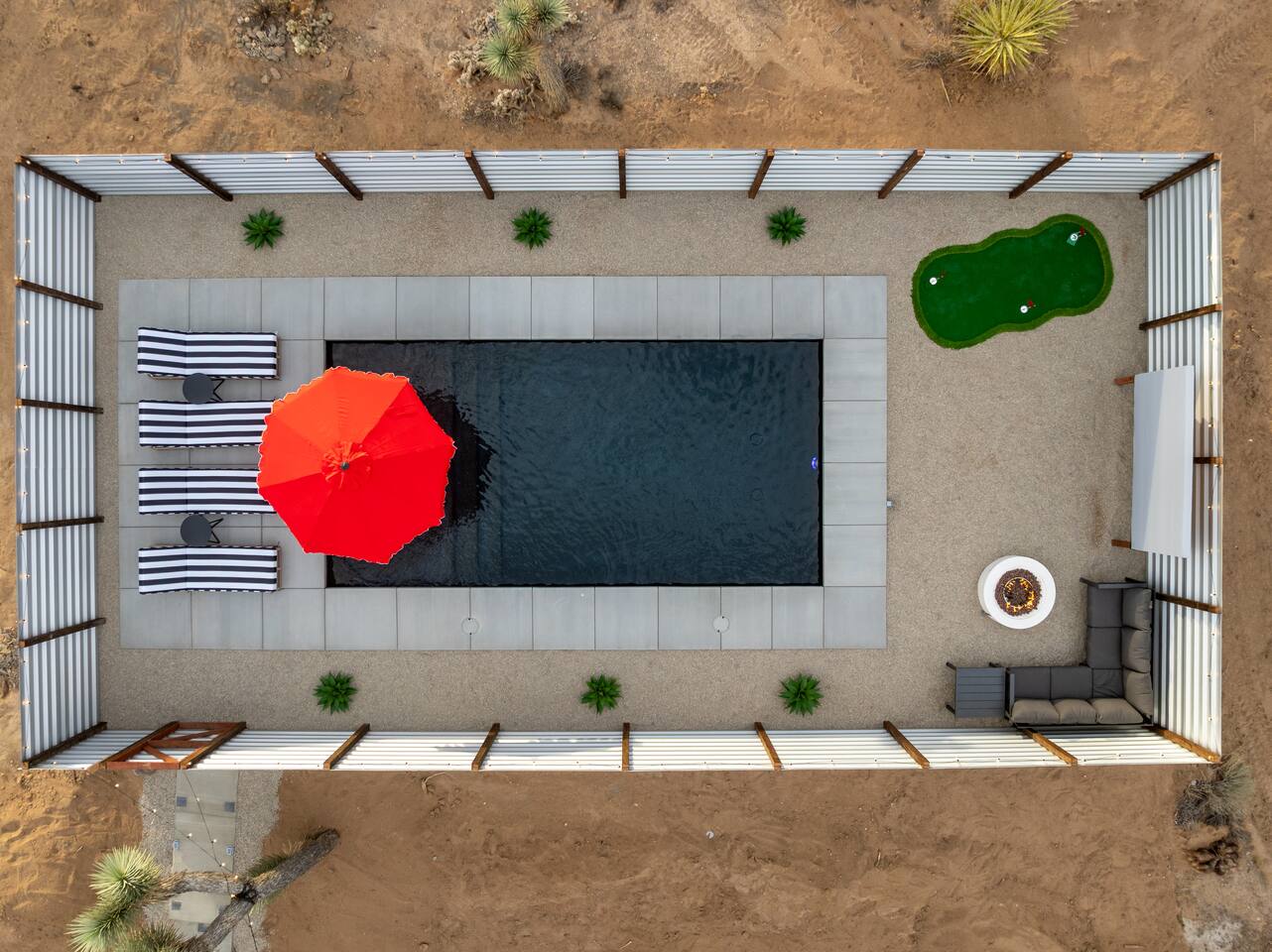 🛸 The Ultimate Outdoor Space Prepare to be amazed by your private, fully-fenced backyard retreat. We've created a luxurious space perfect for enjoying the sunny days and even more incredible desert nights! 👽New In-Ground Pool: Dive into the brand-new, in-ground pool for a refreshing dip, or request to have it heated for a cozy night swim! The pool goes up to 5 feet deep but also includes a nice sized "lounge step" that's great for tanning or just chilling out while you stream your favorite show directly in front of the pool on the screen! 👽Outdoor Movie Nights: Enhance your evening with an unforgettable viewing experience! Grab a spot on the lounge chairs or a floatie in the pool and enjoy your favorite films on the large outdoor projector screen. You can log in to your own streaming accounts to access all your favorites! 👽Star-Gazing Comfort: The backyard also includes a fire pit and sectional where you can cozy up, while the front yard also has a traditional desert cowboy tub, and a pergola with hanging hammock chairs in front of another fire pit for comfortable, classic Joshua Tree stargazing under the ambient string lights. 👽Jacuzzi: Slip into the perfectly heated Jacuzzi to soak away the day's adventures and chill under the stars! KEY FEATURES ☀ INSANE outdoor amenities - pool/hot tub/fire pits/projector/putting green ☀ Spacious 2 bedroom tiny home with 2 King size beds ☀ 1 full bathroom ☀ Full kitchen, with stainless steel and all the tools needed to make a delicious meal! ☀ Stocked coffee bar with assorted K-cups, whole bean coffee and coffee grounds ☀ Salt, pepper, and cooking spray are provided ☀ 55” flat screen TV with access to all streaming platforms (logins not provided) ☀ Free WiFi ☀ Washer + dryer ☀ Easy access; no steps to entry ☀ Convenient location; short drive to National Park, restaurants and activities ☀️ Important Pool Information 🔥Heating Fee: The in-ground pool can be heated to 80F degrees for an additional fee of $200/day. This fee must be paid in full prior to your arrival. - A minimum notice of 24 hours is needed to have the pool heated for your arrival, as it takes time to warm such a large body of water. 🛟Safety: Swim at your own risk. No lifeguard is present. No diving in the pool or spa. 🧰Maintenance: Pool maintenance occurs every Monday afternoon. The pool is available for use before and after maintenance and the technician is completely out of your way when they swing by! 🦩Pool Toys: Pool toys are not provided—feel free to bring your own! ☆☆ BEDROOMS☆☆ Even space travelers need to sleep and when you do, relax in ultimate comfort on a King size bed Zinus memory foam mattress. Two spacious bedrooms provide you with plenty of privacy and space and the ability to rest and recharge for another day of adventure. ☆☆ BATHROOMS ☆☆ There is one full size bathroom complete with plush bath linen, towels for the spa, hairdryer and first aid kit ☆☆ LIVING ROOM ☆☆ Whether you’re in need of an afternoon nap after a long day of exploration and space travel or simply a spot to hang out with friends or family, the living room is the perfect place. You’ll have access to multiple streaming services on the 55” flat-screen TV, and there’s also a fireplace to get you in the desert vibe. ☆☆ KITCHEN & DINING ROOM ☆☆ The fully equipped kitchen has everything you’ll need for whipping up tasty meals for the whole group, including stainless steel appliances, a toaster, a blender, a coffee machine, a Keurig, and all the basic kitchen essentials like pots, pans, plates, cups, and utensils. Enjoy meals together at the kitchen table with seating for 6. There is a stocked coffee bar with assorted K-cups, whole bean coffee and coffee grounds. Salt, pepper, and cooking spray are also included! ☆☆ OUTSIDE SPACE ☆☆ Step outside and into your own desert oasis. The entire yard is fenced in, not only for your privacy, but also so your furry friends can safely explore! Feel free to shut the front gate to fully enclose the yard. The best part about coming to Joshua Tree is being able to enjoy the outdoors and we think the yard will do just that. The neighborhood is pretty quiet and you most likely won’t even see or hear anyone! ★☆ Book Today & Let Us Take Care Of You In Joshua Tree! ☆★
