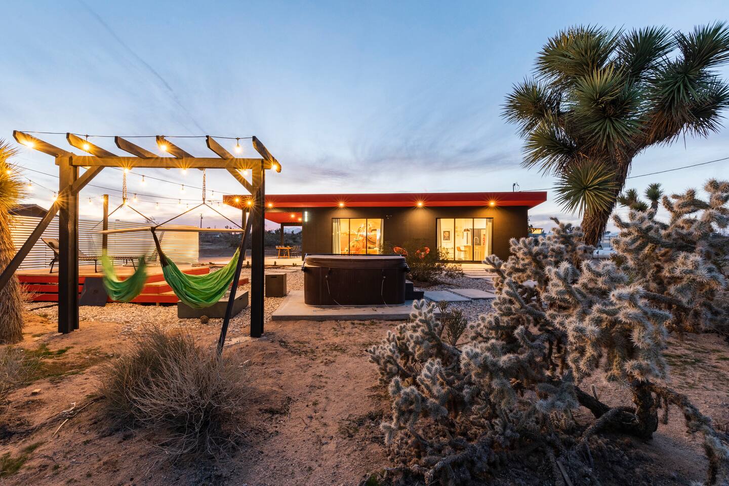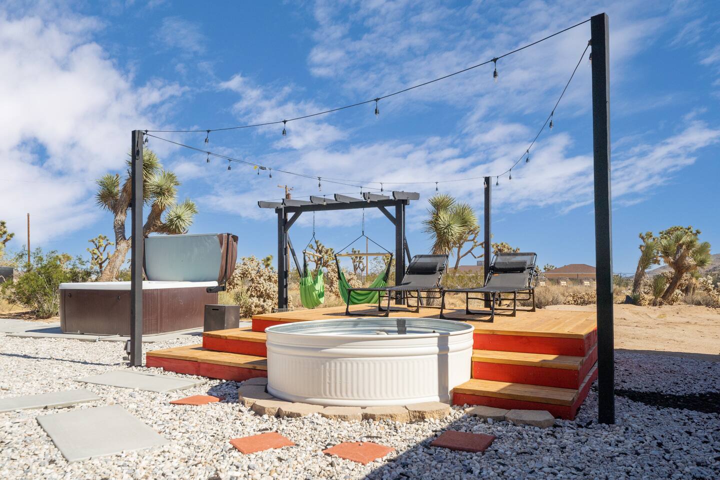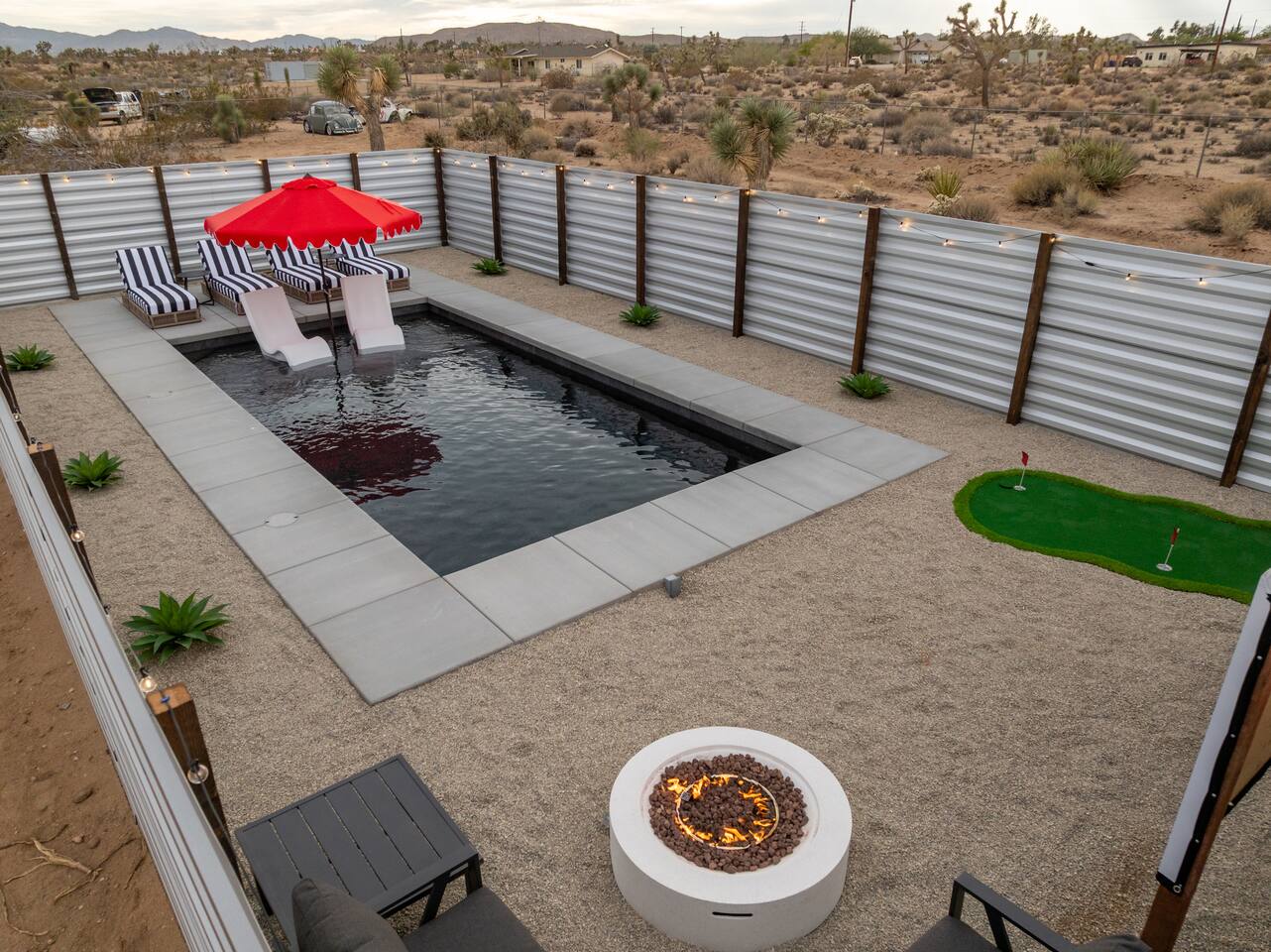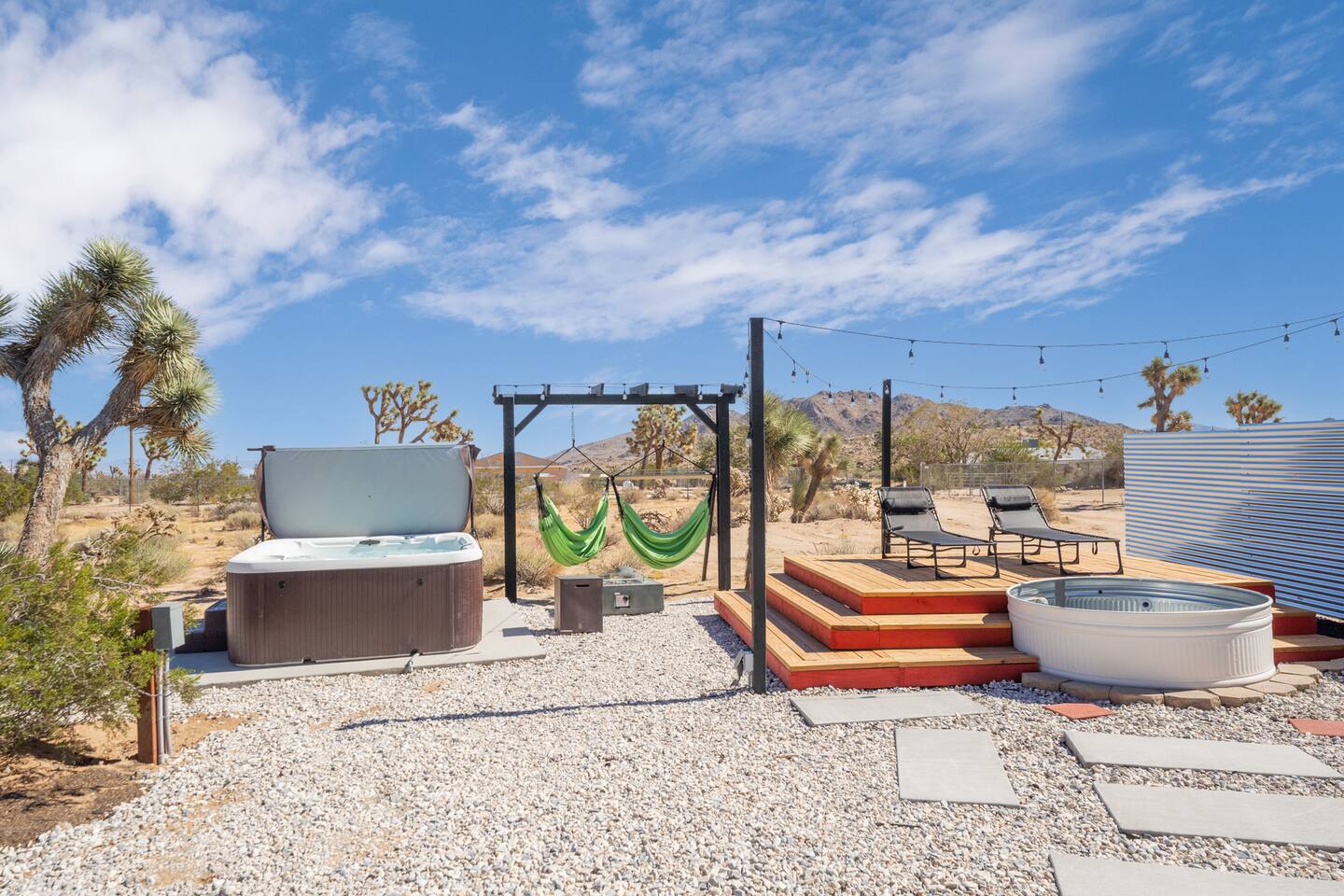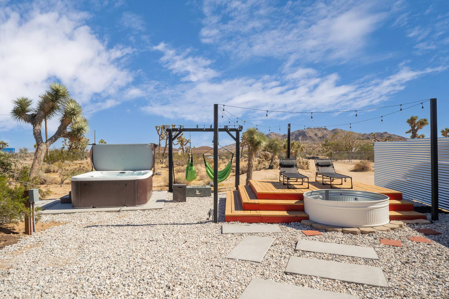 🚀 Houston, we’ve landed on Mars! Welcome to our out-of-this-world 2-bedroom tiny home — a stylish escape that feels light years away without leaving Earth. Perfect for couples or small groups, enjoy your private pool, putting green, outdoor movie screen with projector, large yard, hot tub, cowboy tub, two fire pits, and hammock chairs for stargazing. 🌵 Just 18 mins to Joshua Tree National Park’s west entrance, 9 mins to downtown JT, and 8 mins to Walmart. Super remote, yet close enough!