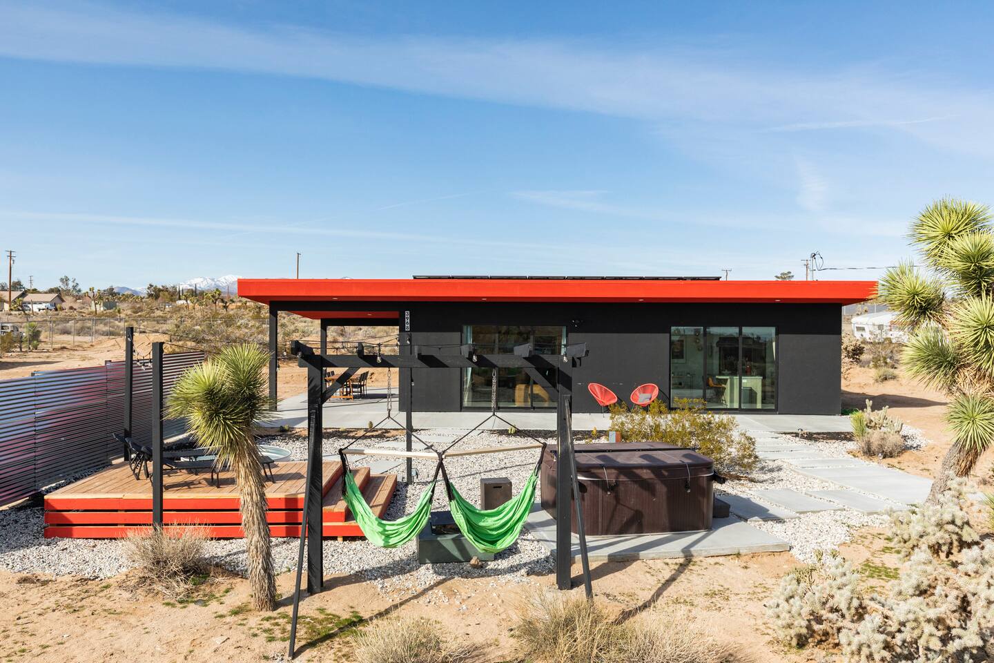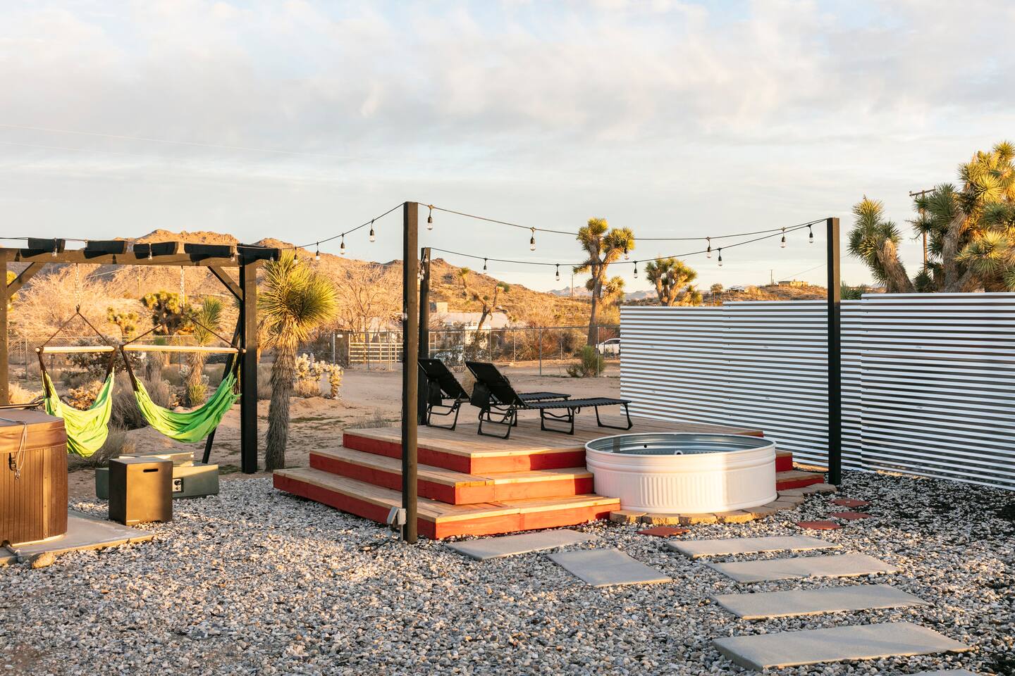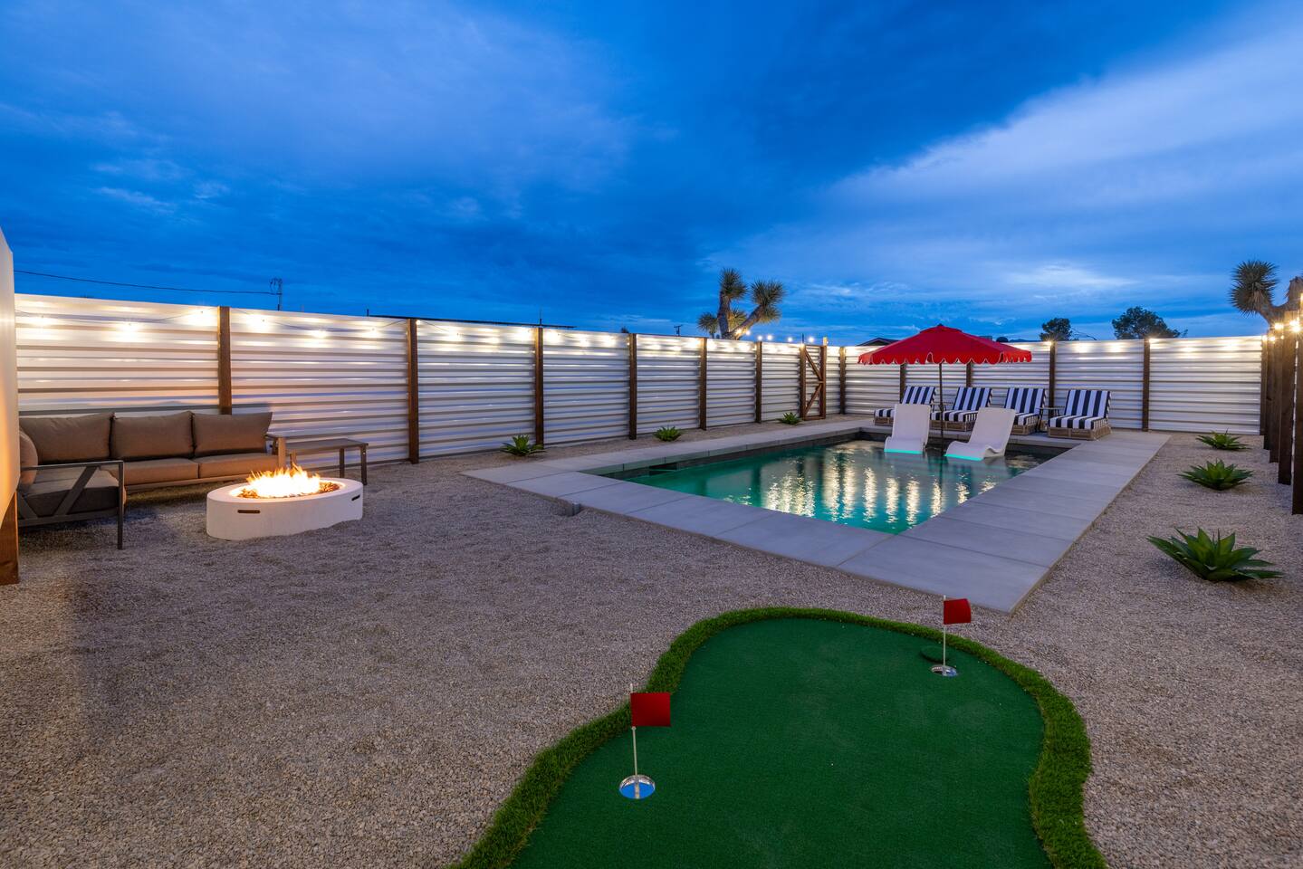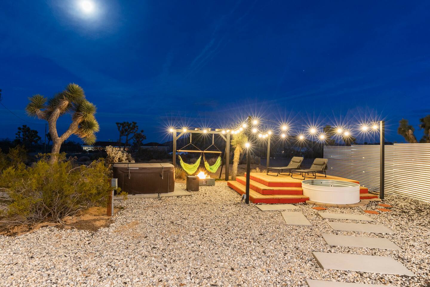 🚀 Houston, we’ve landed on Mars! Welcome to our out-of-this-world 2-bedroom tiny home — a stylish escape that feels light years away without leaving Earth. Perfect for couples or small groups, enjoy your private pool, putting green, outdoor movie screen with projector, large yard, hot tub, cowboy tub, two fire pits, and hammock chairs for stargazing. 🌵 Just 18 mins to Joshua Tree National Park’s west entrance, 9 mins to downtown JT, and 8 mins to Walmart. Super remote, yet close enough!