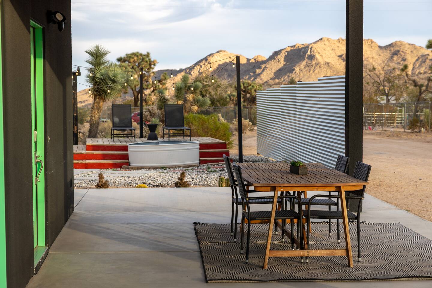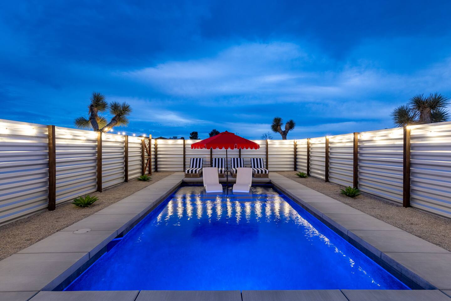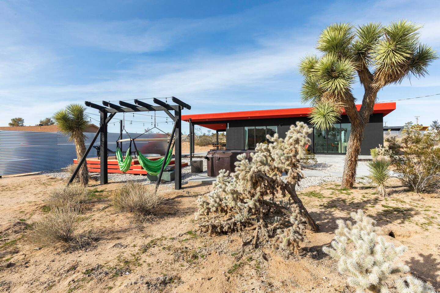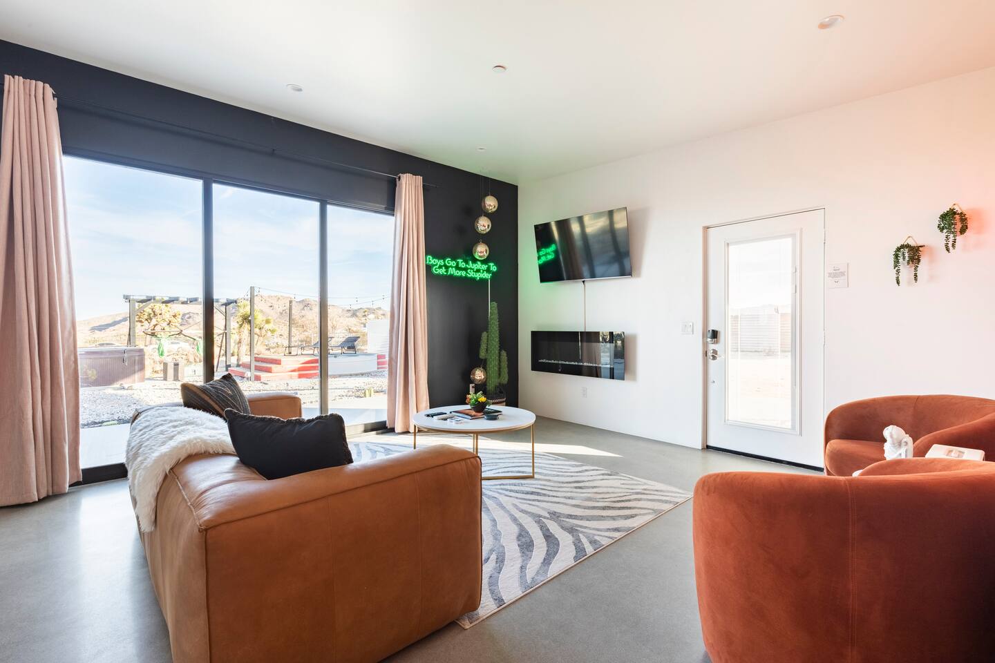 🚀 Houston, we’ve landed on Mars! Welcome to our out-of-this-world 2-bedroom tiny home — a stylish escape that feels light years away without leaving Earth. Perfect for couples or small groups, enjoy your private pool, putting green, outdoor movie screen with projector, large yard, hot tub, cowboy tub, two fire pits, and hammock chairs for stargazing. 🌵 Just 18 mins to Joshua Tree National Park’s west entrance, 9 mins to downtown JT, and 8 mins to Walmart. Super remote, yet close enough!