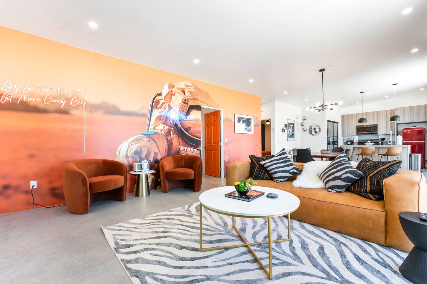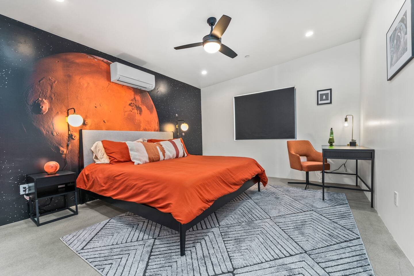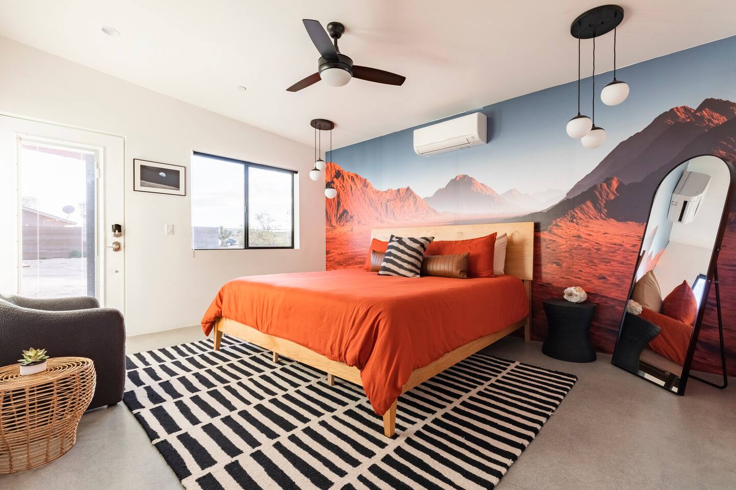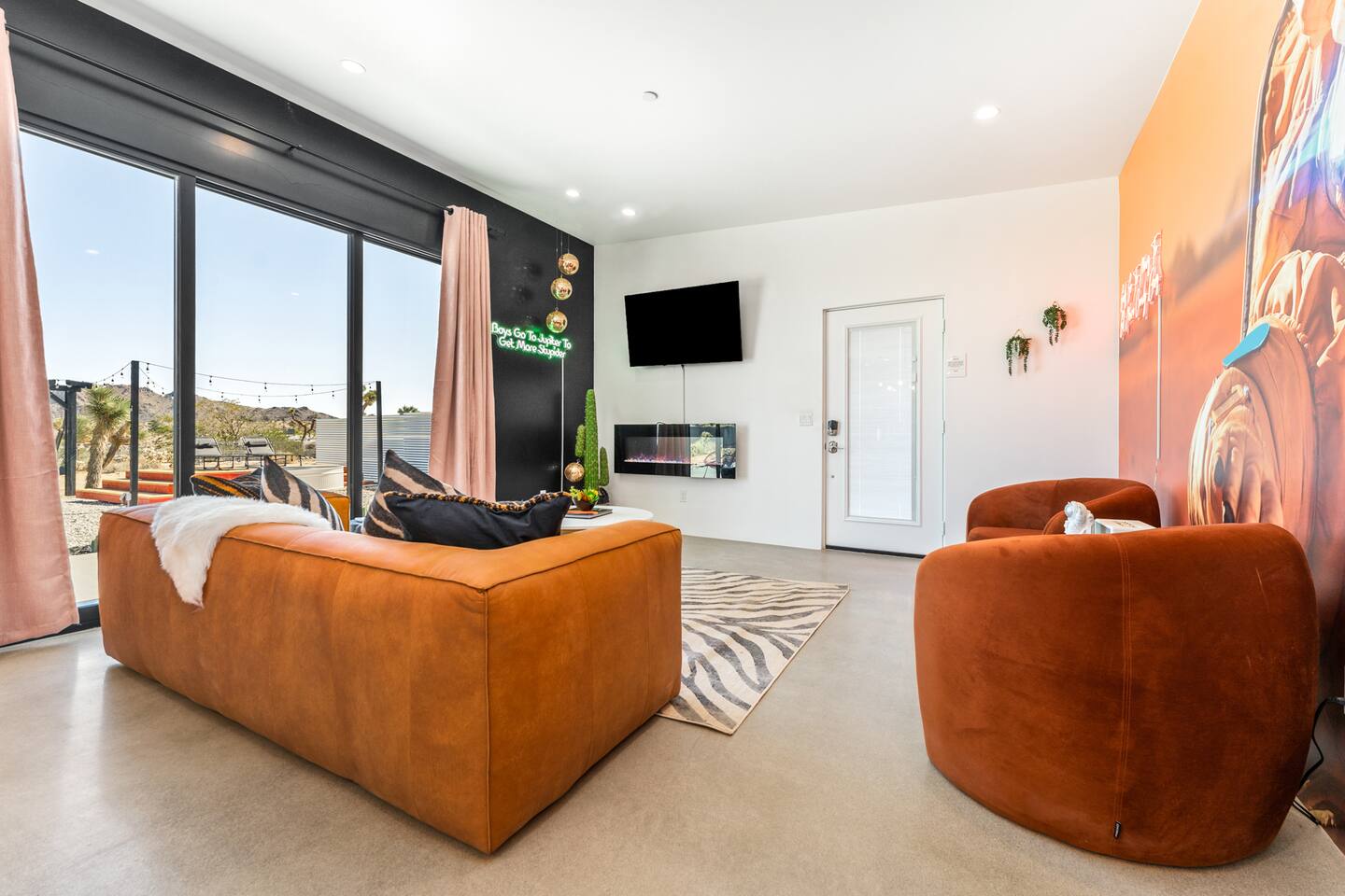 🚀 Houston, we’ve landed on Mars! Welcome to our out-of-this-world 2-bedroom tiny home — a stylish escape that feels light years away without leaving Earth. Perfect for couples or small groups, enjoy your private pool, putting green, outdoor movie screen with projector, large yard, hot tub, cowboy tub, two fire pits, and hammock chairs for stargazing. 🌵 Just 18 mins to Joshua Tree National Park’s west entrance, 9 mins to downtown JT, and 8 mins to Walmart. Super remote, yet close enough!