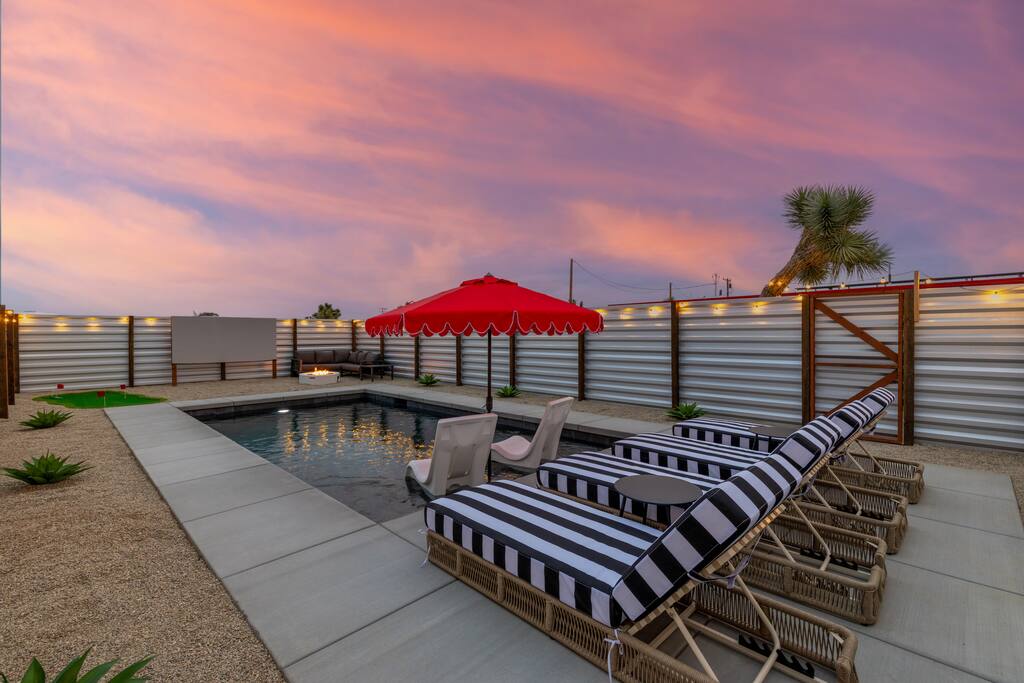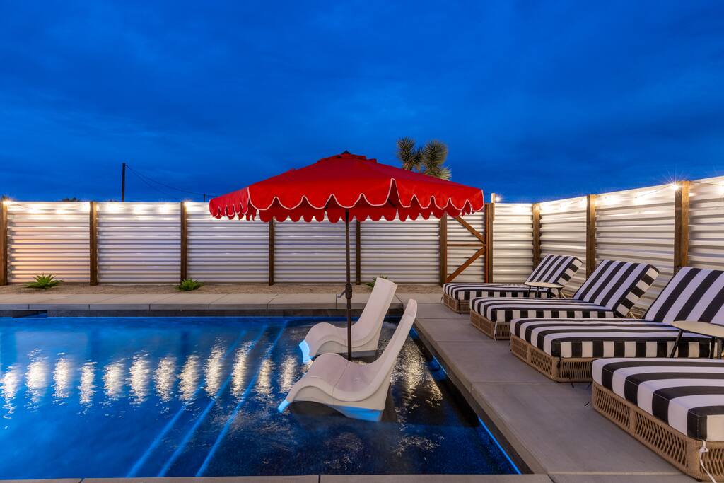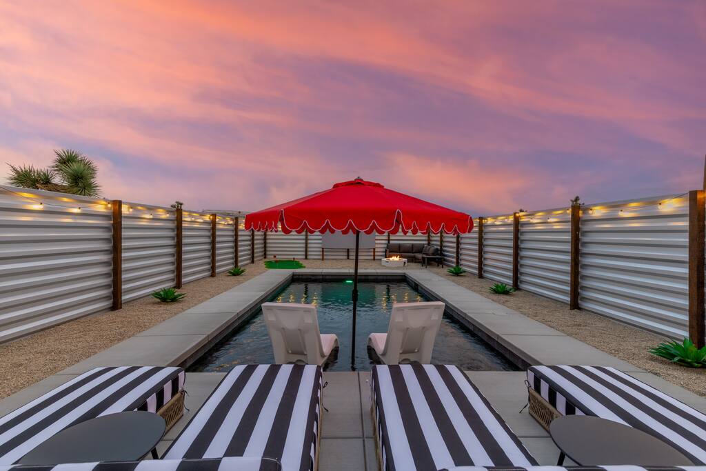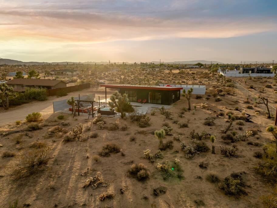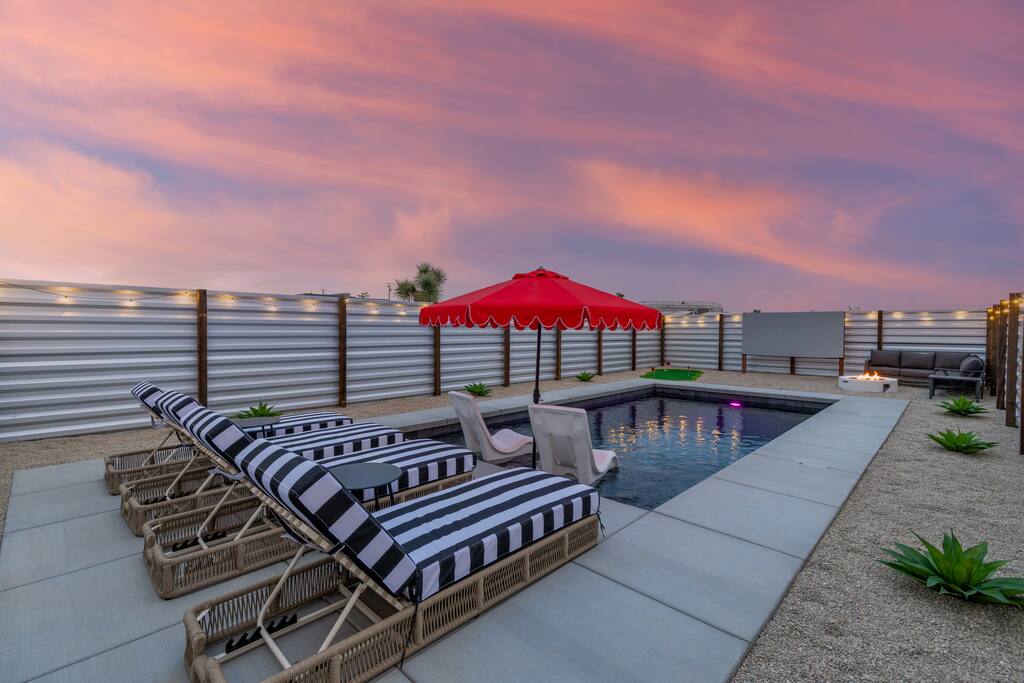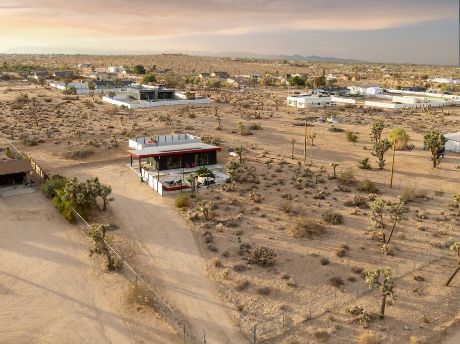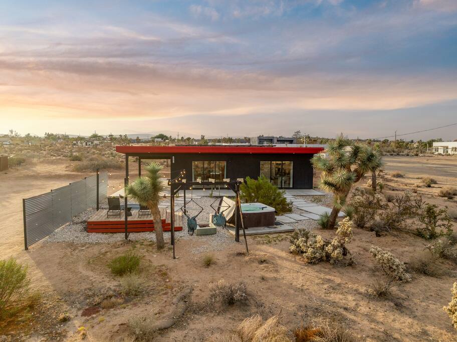 🚀 Houston, we’ve touched down on Mars! Welcome to our out-of-this-world 2-bedroom tiny home, designed to give you a stylish escape that feels light years away, without ever leaving Earth. This is the perfect getaway for a couple or a small group and includes a large yard, hot tub, cowboy pool, fire pit and pergola with hanging hammock chairs to enjoy the night sky. 18 Mins Drive to the West Entrance to Joshua Tree National Park 9 Mins drive to downtown JT 8 Mins drive to Walmart