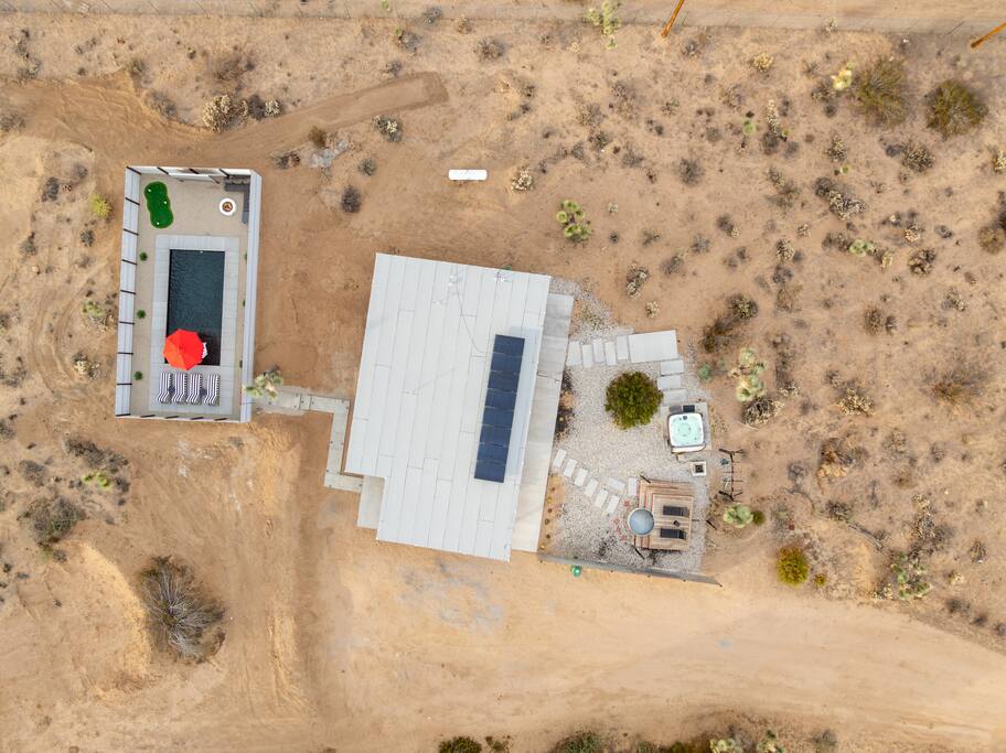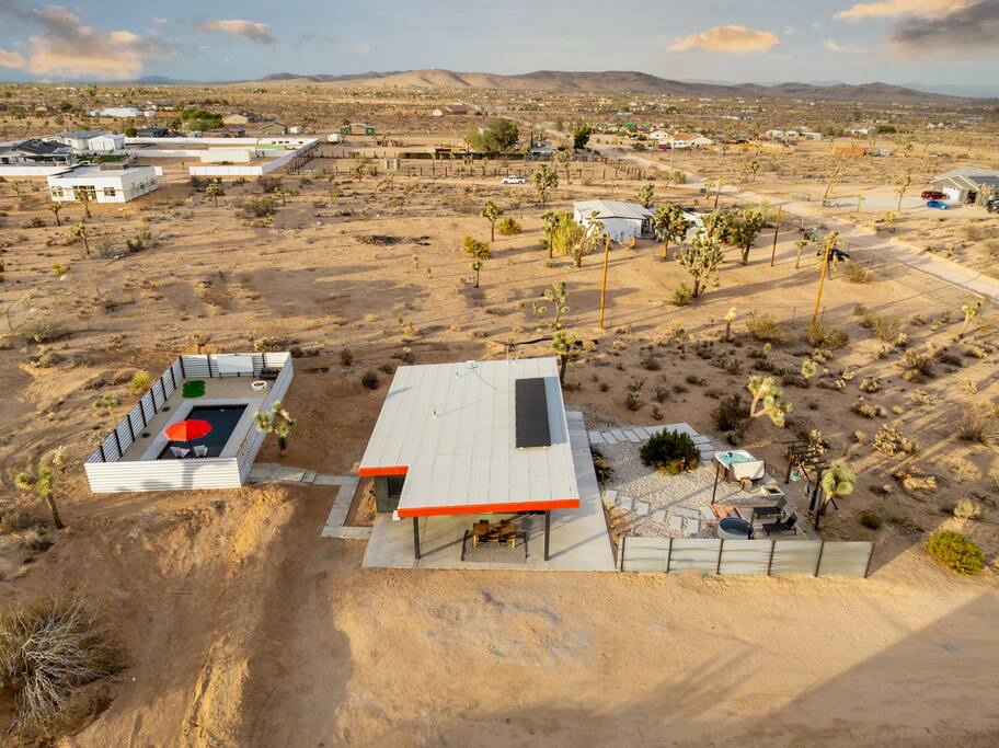 KEY FEATURES ☀ Spacious 2 bedroom tiny home with 2 King size beds ☀ 1 full bathroom ☀ Full kitchen, with stainless steel and all the tools needed to make a delicious meal! ☀ Stocked coffee bar with assorted K-cups, whole bean coffee and coffee grounds ☀ Salt, pepper, and cooking spray are provided ☀ 55” flat screen TV with access to all streaming platforms (logins not provided) ☀ Free WiFi ☀ Washer + dryer ☀ Easy access; no steps to entry ☀ Convenient location; short drive to National Park, restaurants and activities ☆☆ BEDROOMS☆☆ Even space travelers need to sleep and when you do, relax in ultimate comfort on a King size bed Zinus memory foam mattress. Two spacious bedrooms provide you with plenty of privacy and space and the ability to rest and recharge for another day of adventure. ☆☆ BATHROOMS ☆☆ There is one full size bathroom complete with plush bath linen, towels for the spa, hairdryer and first aid kit ☆☆ LIVING ROOM ☆☆ Whether you’re in need of an afternoon nap after a long day of exploration and space travel or simply a spot to hang out with friends or family, the living room is the perfect place. You’ll have access to multiple streaming services on the 55” flat-screen TV, and there’s also a fireplace to get you in the desert vibe. ☆☆ KITCHEN & DINING ROOM ☆☆ The fully equipped kitchen has everything you’ll need for whipping up tasty meals for the whole group, including stainless steel appliances, a toaster, a blender, a coffee machine, a Keurig, and all the basic kitchen essentials like pots, pans, plates, cups, and utensils. Enjoy meals together at the kitchen table with seating for 6. There is a stocked coffee bar with assorted K-cups, whole bean coffee and coffee grounds. Salt, pepper, and cooking spray are also included! ☆☆ OUTSIDE SPACE ☆☆ Step outside and into your own desert oasis. The entire yard is fenced in, not only for your privacy, but also so your furry friends can safely explore! Please make sure to shut the front gate to fully enclose the yard. The best part about coming to Joshua Tree is being able to enjoy the outdoors and we think the yard will do just that. The backyard features a dining table and chair for 6, cowboy pool and hot tub which is great for soaking in after long days hiking in the national park, as well as a fire pit surrounded by a pergola with hanging hammock chairs which is perfect for enjoying the starry night skies. ★☆ Book Today & Let Us Take Care Of You In Joshua Tree! ☆★