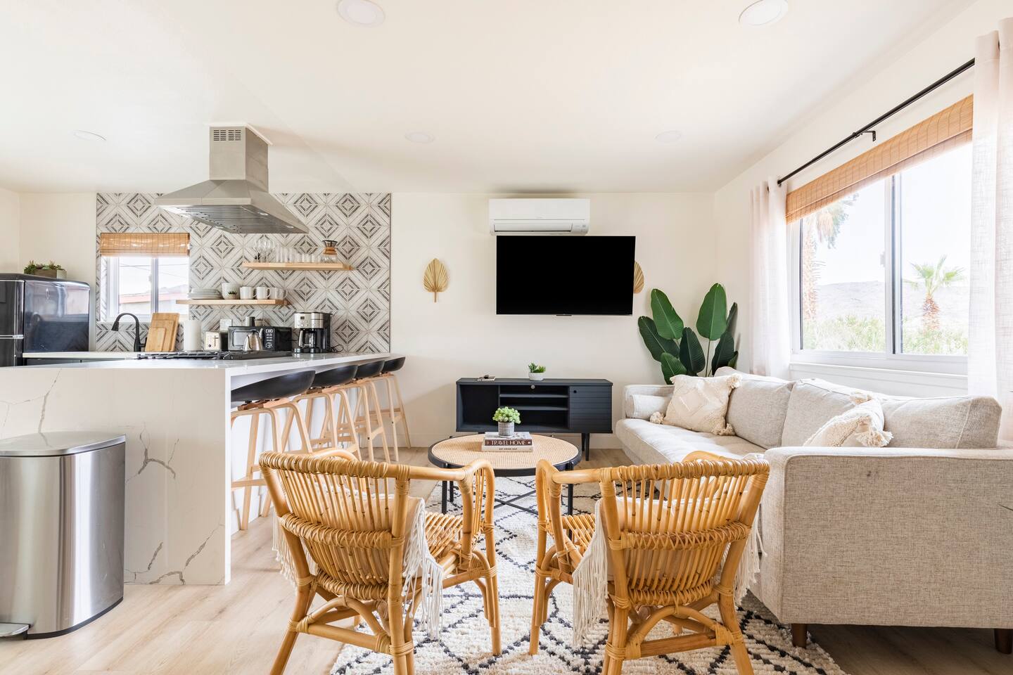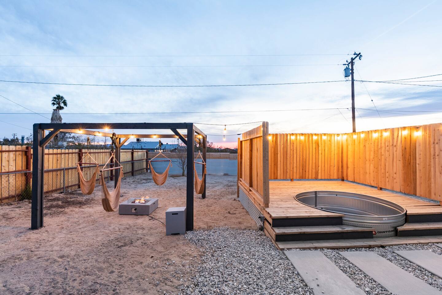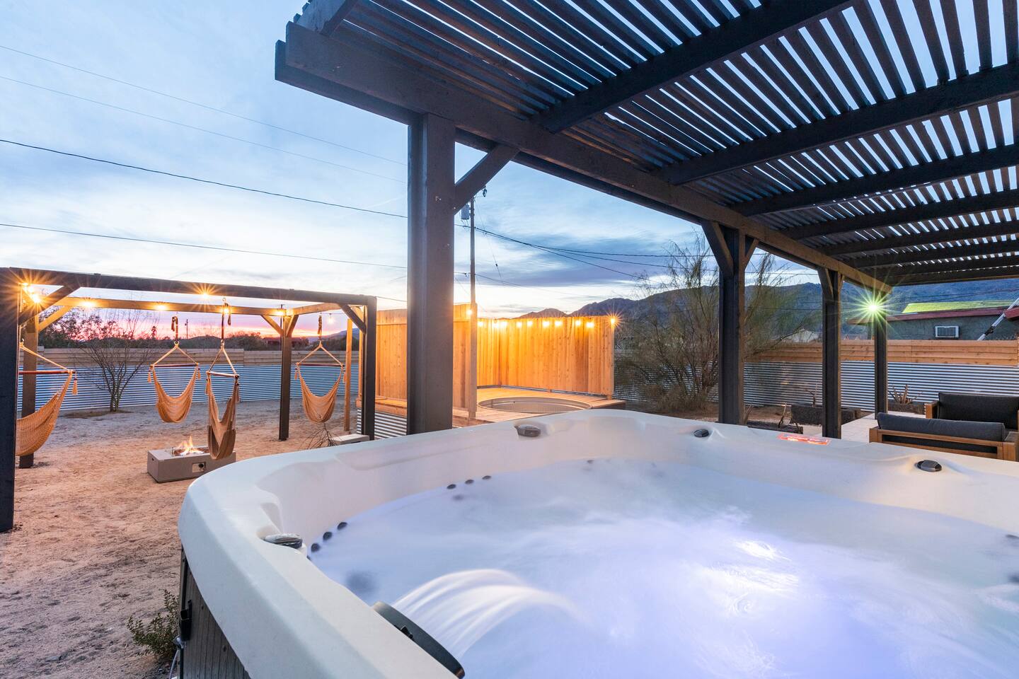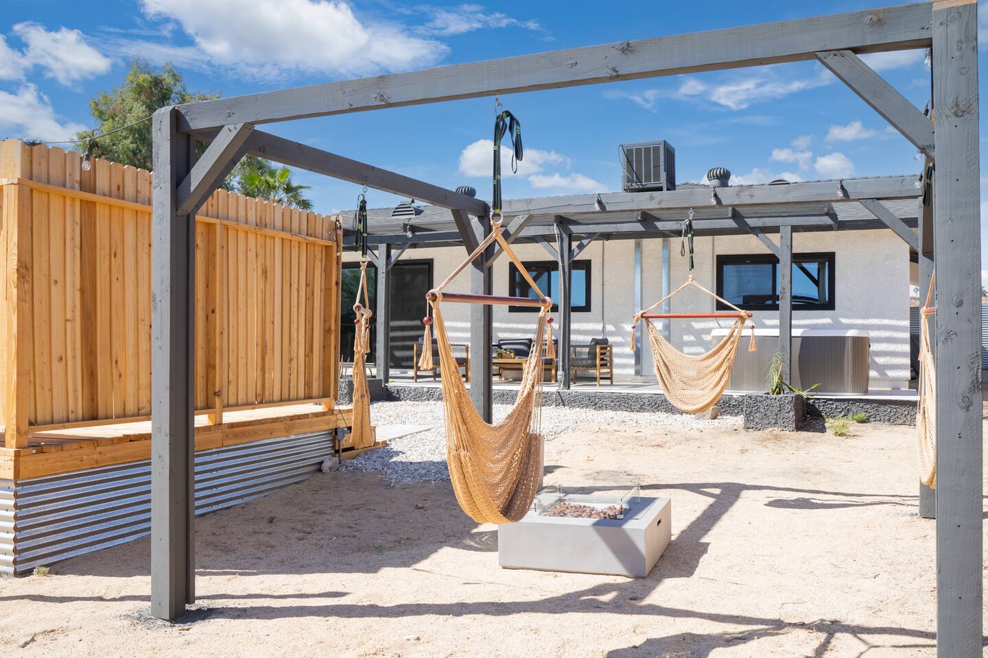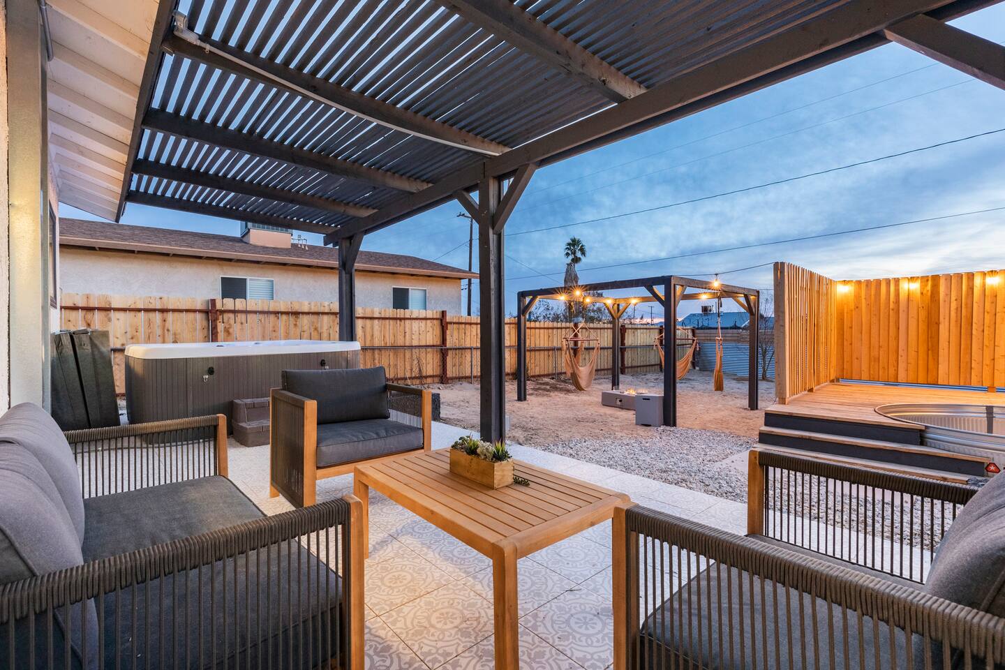 Picturing yourself relaxing underneath the palm trees is easy in this beautiful Tulum inspired home. Newly-remodeled, this home is perfect for families and small groups. Make the most of the stunning landscape with our incredible indoor and outdoor amenities! A brand new game room, hot tub, fire pit, stock tank pool, and hammocks await you for fun and relaxation! 22 Mins Drive to Joshua Tree National Park 2 min to Stater Bros Grocery Store 13 Mins Drive to Downtown Joshua Tree