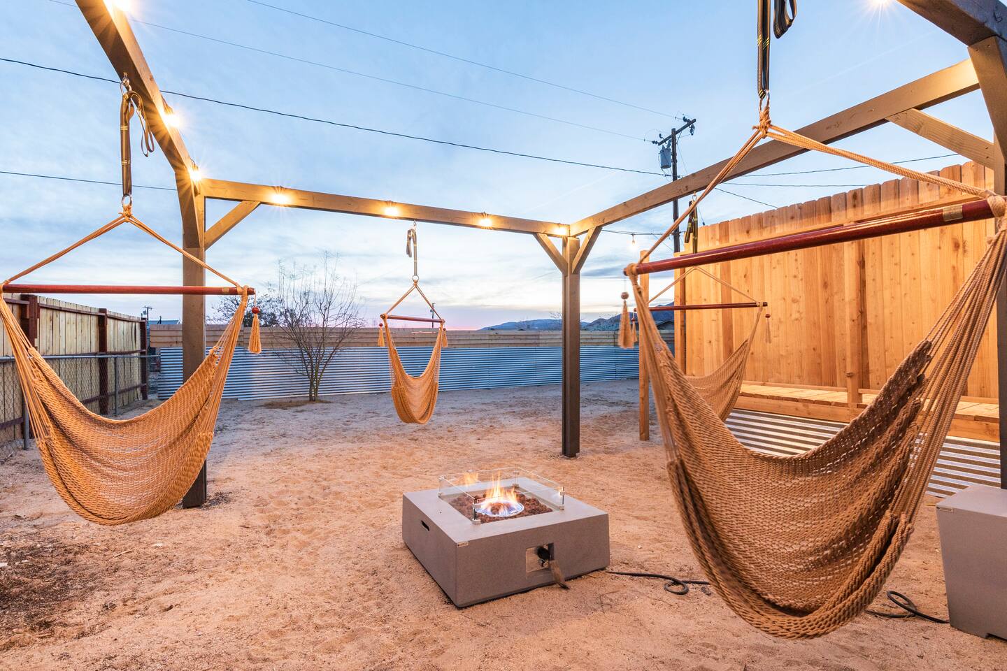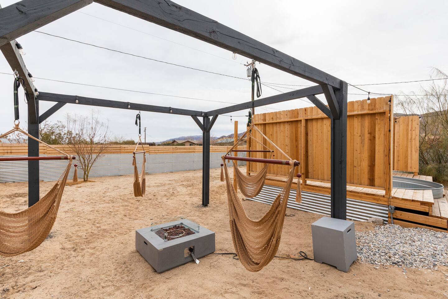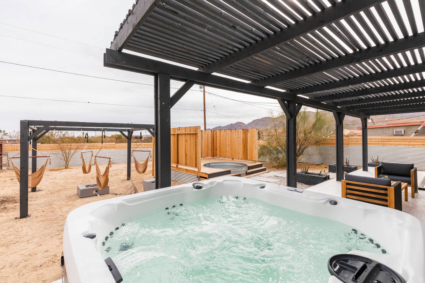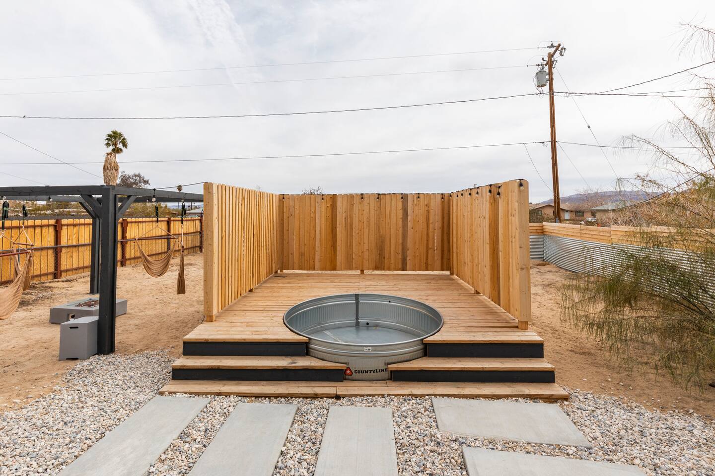 Picturing yourself relaxing underneath the palm trees is easy in this beautiful Tulum inspired home. Newly-remodeled, this home is perfect for families and small groups. Make the most of the stunning landscape with our incredible indoor and outdoor amenities! A brand new game room, hot tub, fire pit, stock tank pool, and hammocks await you for fun and relaxation! 22 Mins Drive to Joshua Tree National Park 2 min to Stater Bros Grocery Store 13 Mins Drive to Downtown Joshua Tree