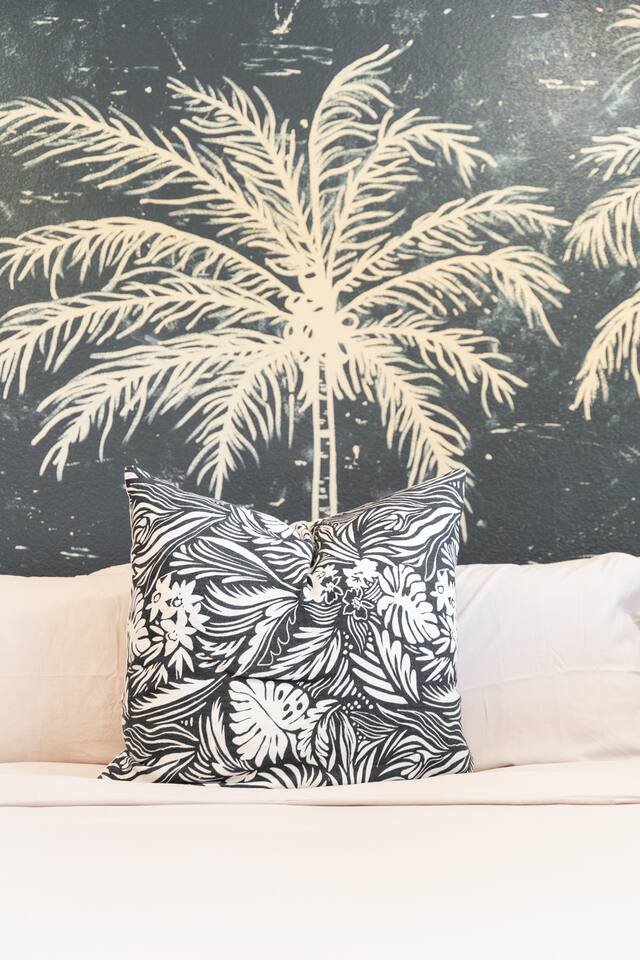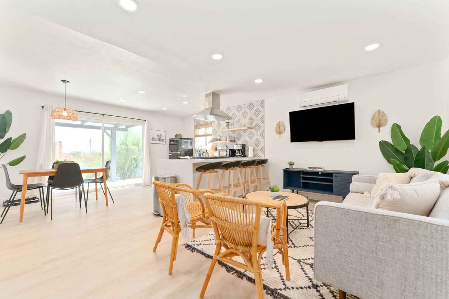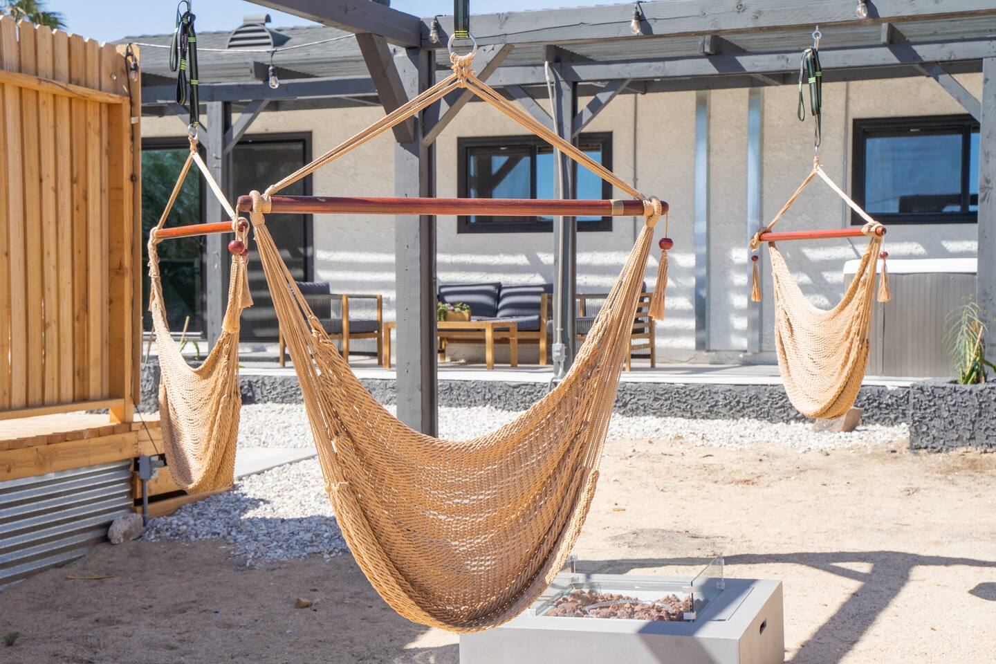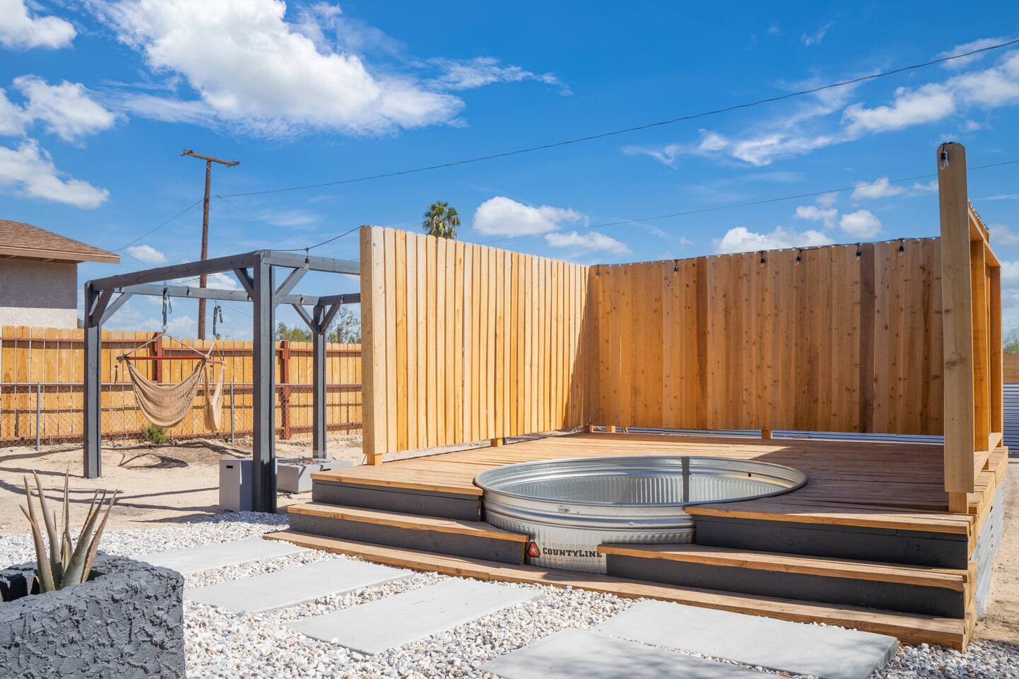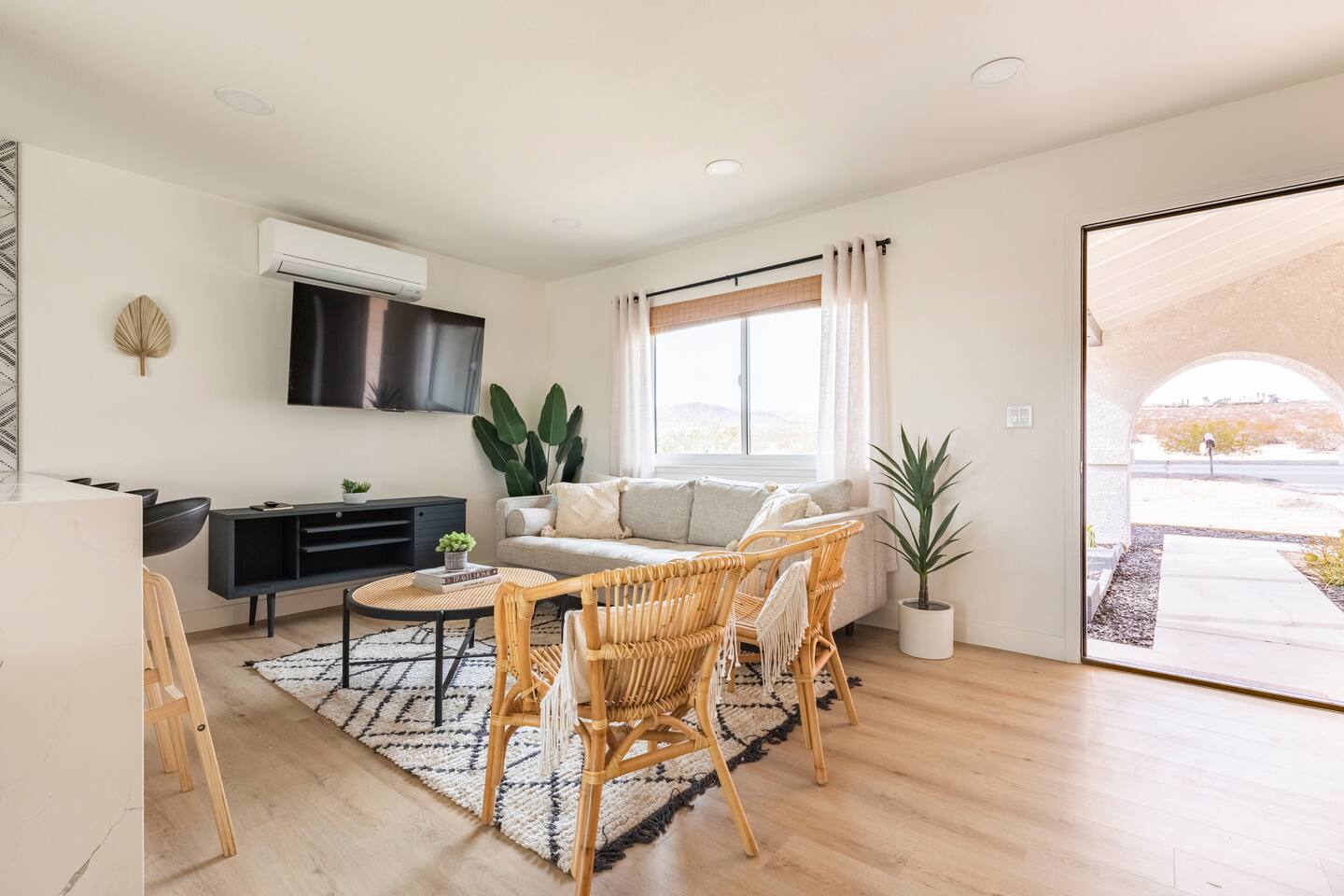 Picturing yourself relaxing underneath the palm trees is easy in this beautiful Tulum inspired home. Newly-remodeled, this home is perfect for families and small groups. Make the most of the stunning landscape with our incredible indoor and outdoor amenities! A brand new game room, hot tub, fire pit, stock tank pool, and hammocks await you for fun and relaxation! 22 Mins Drive to Joshua Tree National Park 2 min to Stater Bros Grocery Store 13 Mins Drive to Downtown Joshua Tree