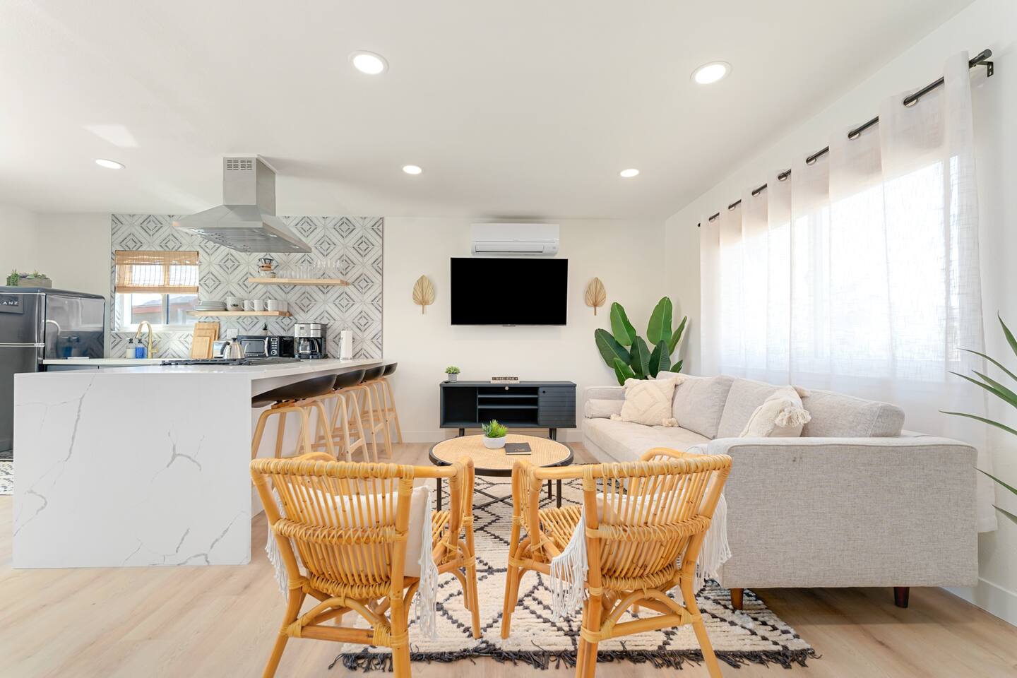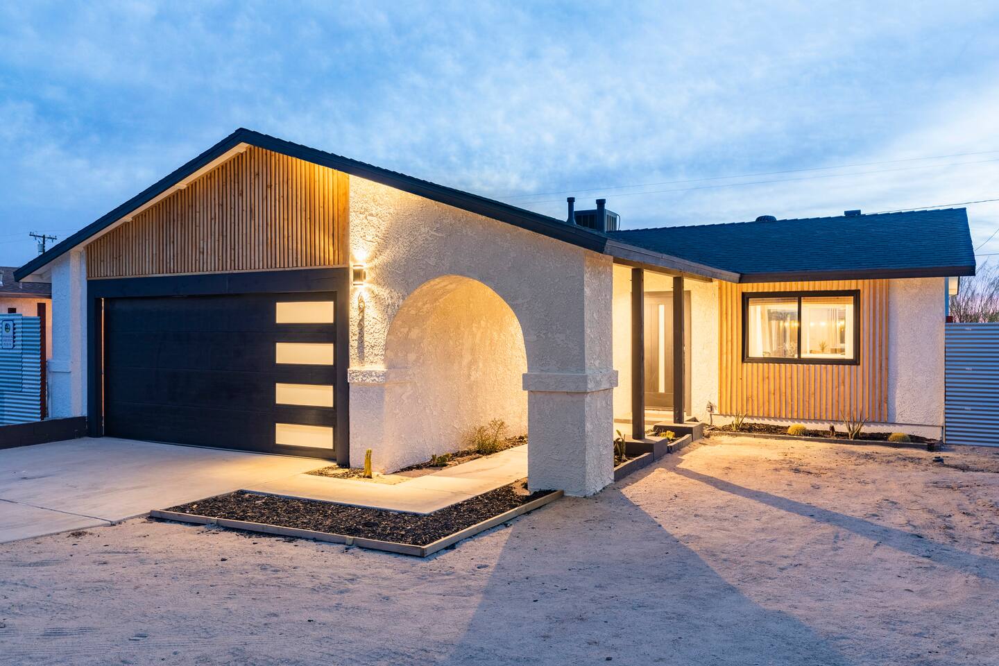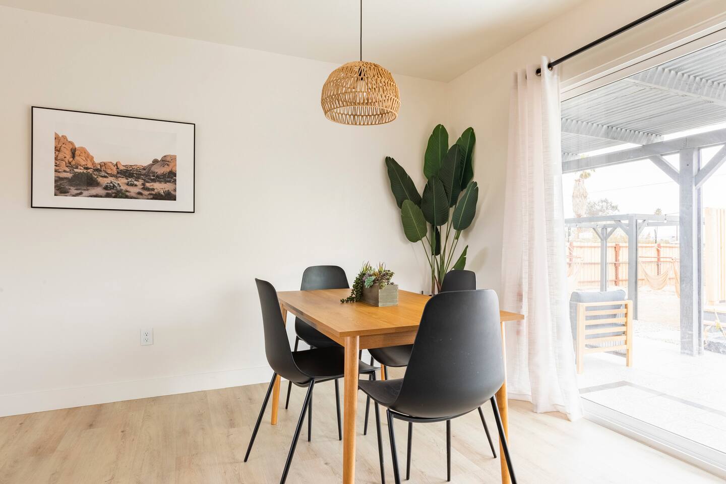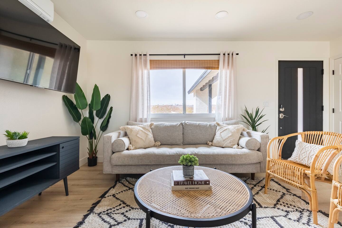 Picturing yourself relaxing underneath the palm trees is easy in this beautiful Tulum inspired home. Newly-remodeled, this home is perfect for families and small groups. Make the most of the stunning landscape with our incredible indoor and outdoor amenities! A brand new game room, hot tub, fire pit, stock tank pool, and hammocks await you for fun and relaxation! 22 Mins Drive to Joshua Tree National Park 2 min to Stater Bros Grocery Store 13 Mins Drive to Downtown Joshua Tree