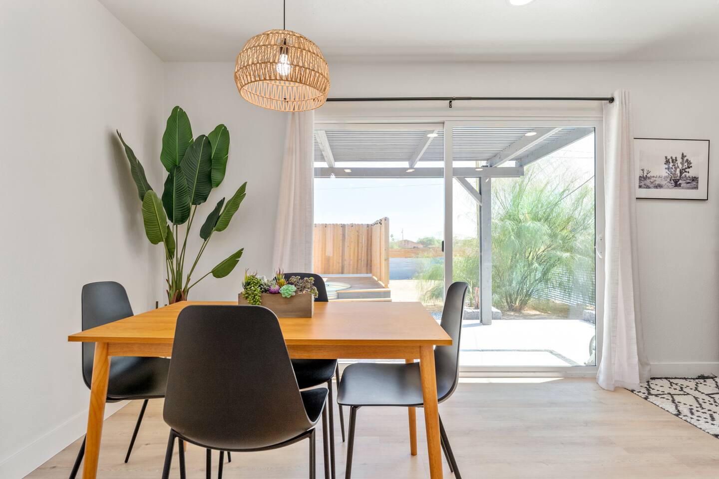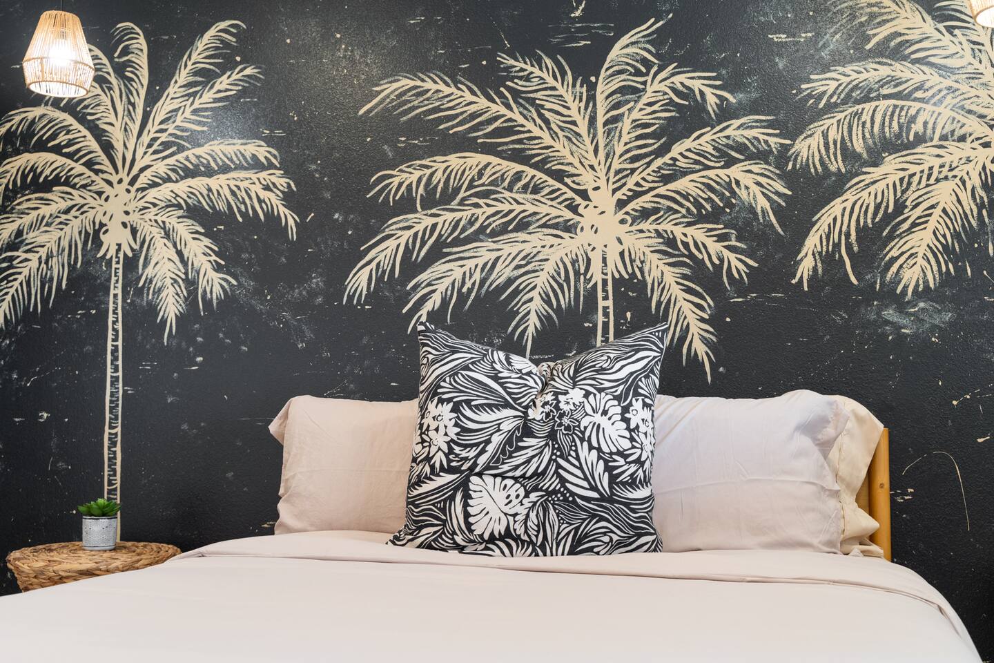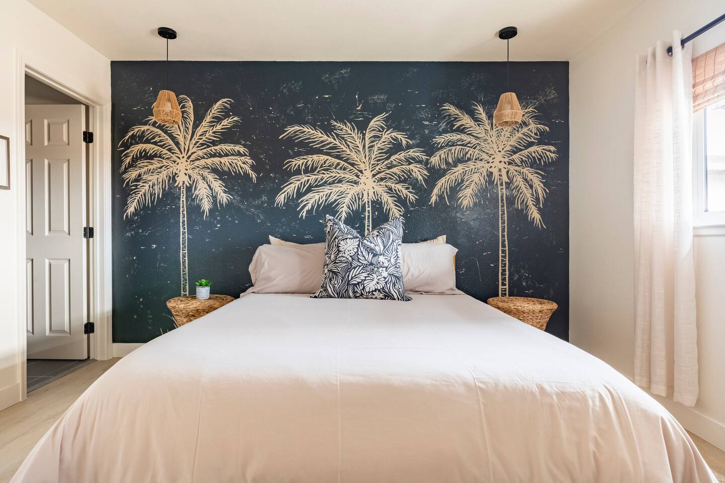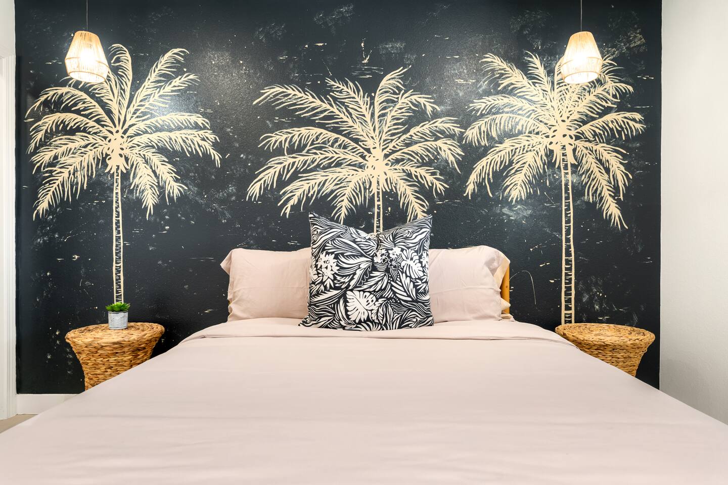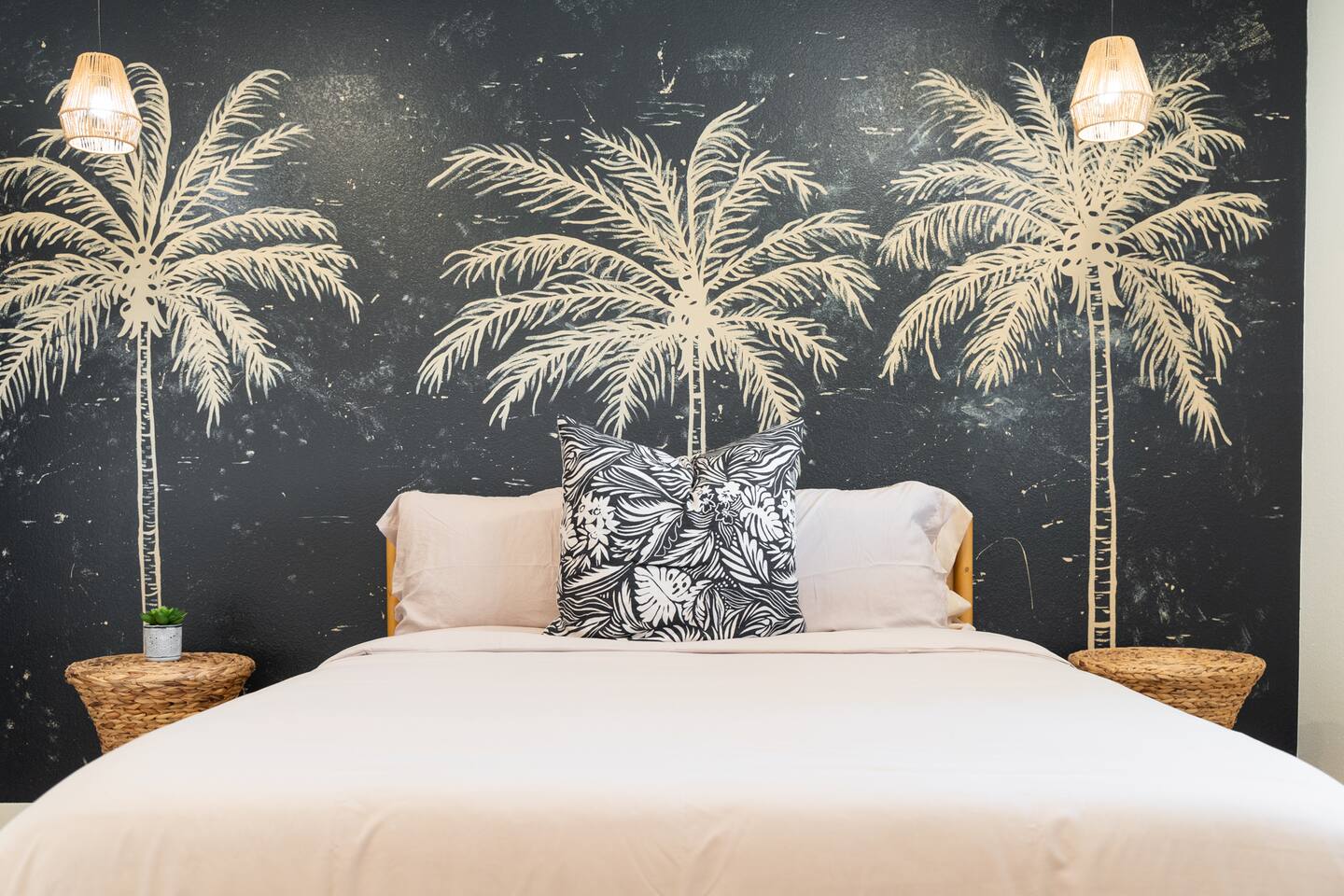 Picturing yourself relaxing underneath the palm trees is easy in this beautiful Tulum inspired home. Newly-remodeled, this home is perfect for families and small groups. Make the most of the stunning landscape with our incredible indoor and outdoor amenities! A brand new game room, hot tub, fire pit, stock tank pool, and hammocks await you for fun and relaxation! 22 Mins Drive to Joshua Tree National Park 2 min to Stater Bros Grocery Store 13 Mins Drive to Downtown Joshua Tree