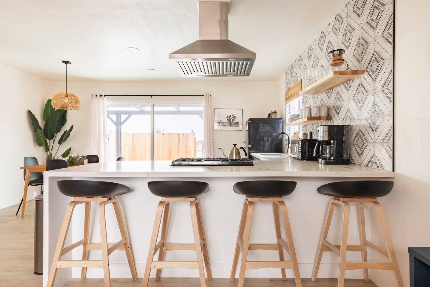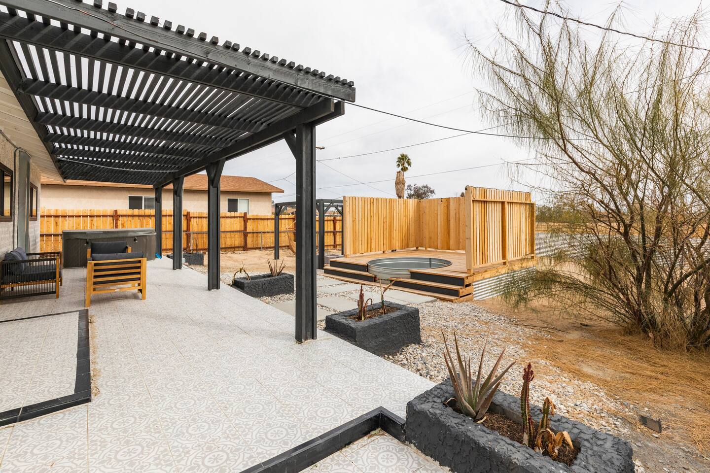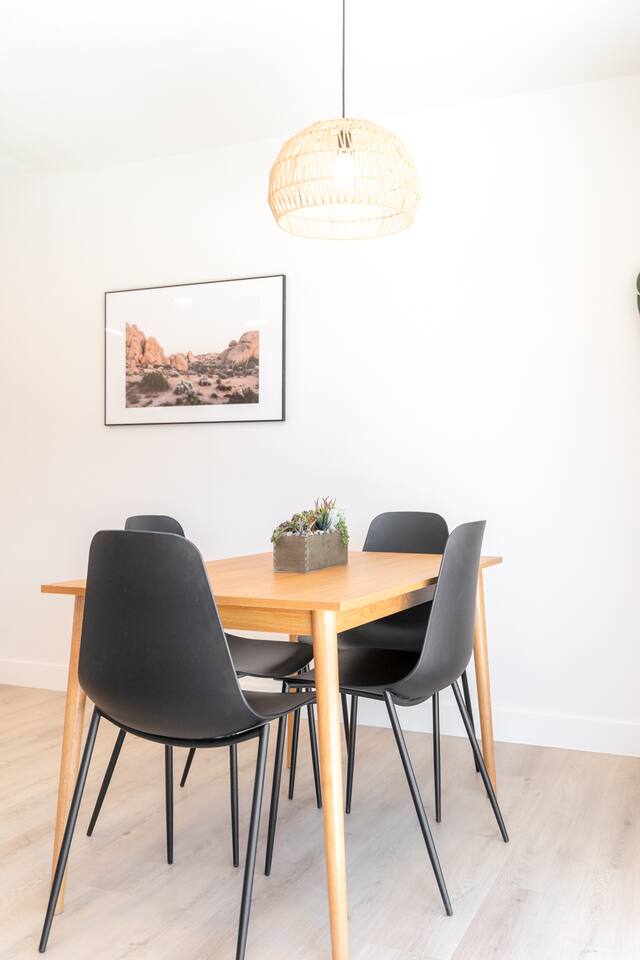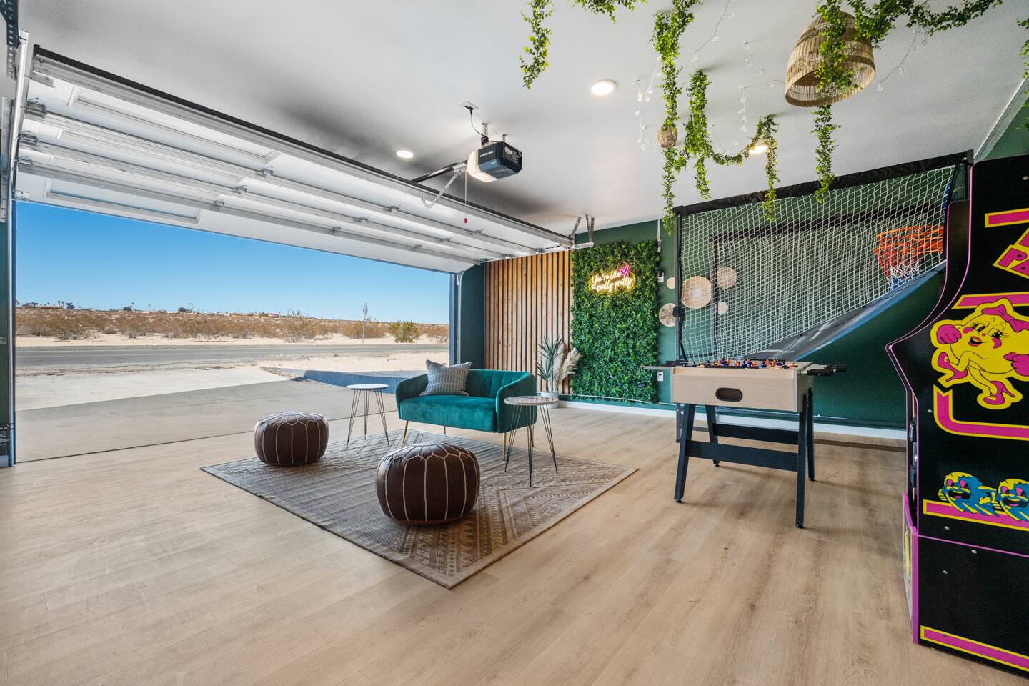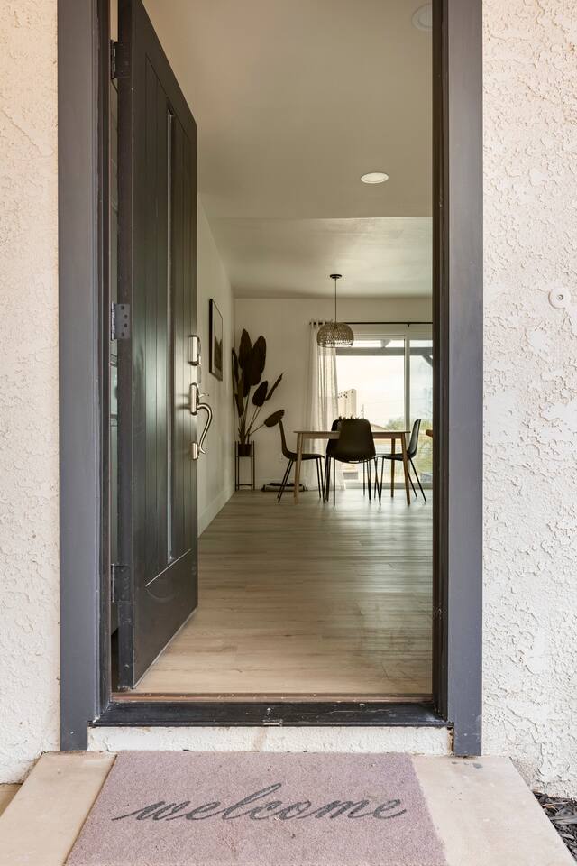KEY FEATURES: ☀ 2 beautifully decorated bedrooms; 2 Queen-sized beds ☀ 2 full bathroom; both are showers only ☀ Open floor kitchen, dining + lounge area ☀ Fully-equipped kitchen ☀ Stocked coffee bar with assorted K-cups, whole bean coffee and coffee grounds ☀ Salt, pepper, and cooking spray are provided ☀ Large smart TV ☀ Private backyard w/ a stock tank pool, hot tub, fire pit + pergola w/ hanging hammock chairs ☀ Beautiful and fun game room complete with smart TV, Foosball, arcade games, arcade basketball and vintage popcorn machine ☀ Air conditioning + central heating ☀ Dedicated workspace + wifi ☀ External security cameras covering the front door ☀ Free on site laundry ☀ Free parking on-site ☀ Single-level home w/ stairless access ☆☆ BEDROOMS ☆☆ This perfect desert home provides you with two beautiful bedrooms to rest your head for the night. Both bedrooms are stylishly furnished with queen-sized beds and topped with extra-comfortable Zinus memory foam mattresses. Our guests rave about our luxurious mattresses! All of the spacious bedrooms are light, airy spaces and offer plenty of storage space for your clothing and personal belongings. The thoughtful touches and beautiful decor make them the perfect spot to kick back and relax after a long day seeing the sights of the desert ☆☆ BATHROOMS ☆☆ Make use of the good-sized bathrooms, complete with gorgeous tiled showers, and stylish vanity. This bright space is the perfect place for unwinding after an energetic hike through Joshua Tree National Park. ☆☆ KITCHEN & LOUNGE ☆☆ Our open-plan kitchen, dining area, and lounge are full of natural light, making it a relaxing space to gather in as a family or small group. We provide everything you need to make delicious meals, from new stainless steel appliances to a dedicated coffee station. We know how important a good cup of Joe is, so our coffee station features an automatic coffee machine as well as a drip coffee kettle. Enjoy coffee your way! Four bar stools are arranged around the kitchen island, making it a lovely spot for breakfast or just to chat with the chef. For formal and fun dinners, make use of the dining table. It’s set for four and overlooks the backyard, ideal for a relaxing meal. The whole space is completed with the spacious living room. Here you’ll be able to enjoy evenings in front of the smart TV, curling up with a good book, or enjoying the company of family and friends ☆☆ OUTSIDE SPACE ☆☆ Our favorite feature of our peaceful desert oasis house is the fully-fenced backyard. We’ve lovingly created a private, relaxing space for you to enjoy. Why not take advantage of our stock tank pool to chill out and get some refreshments from the hot weather? If hot tubs are more your thing, we’ve got you covered there, too. Next to the stock tank pool, you’ll find a heated jacuzzi, which will help you soak away any tiredness you might have from your adventures of the day. For the ultimate desert experience, turn on the pretty string lights, light up the fire pit and make some s’mores as the evening draws in. Stargazing is a must when you’re in the desert, and you can do so at the pergola, where you’ll be able to sway under the stars in a cozy hammock. ☆☆Game Room ☆☆ Check out the newly remodeled game room and challenge your friends or family to some friendly competition on the Foosball Table, Arcade Basketball or Ms. Pacman. After the winner is crowned, relax on the couch enjoying some popcorn from the vintage popcorn machine! ★☆ Book Today & Let Us Take Care Of You In Joshua Tree! ☆★