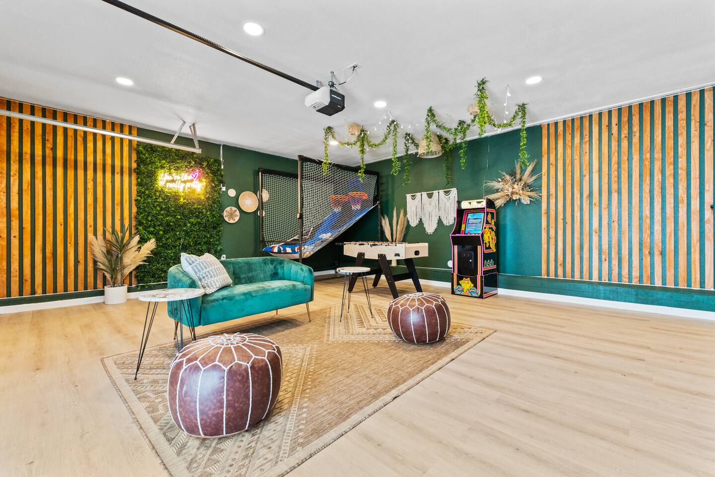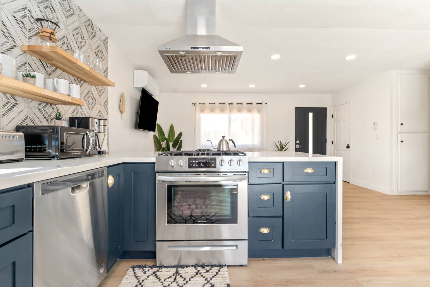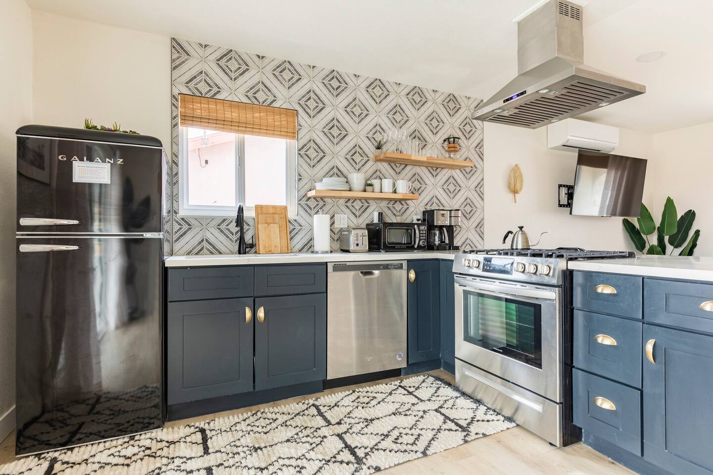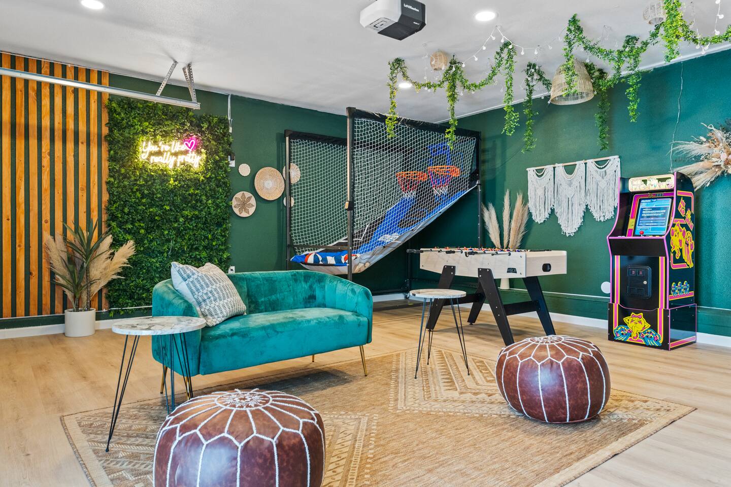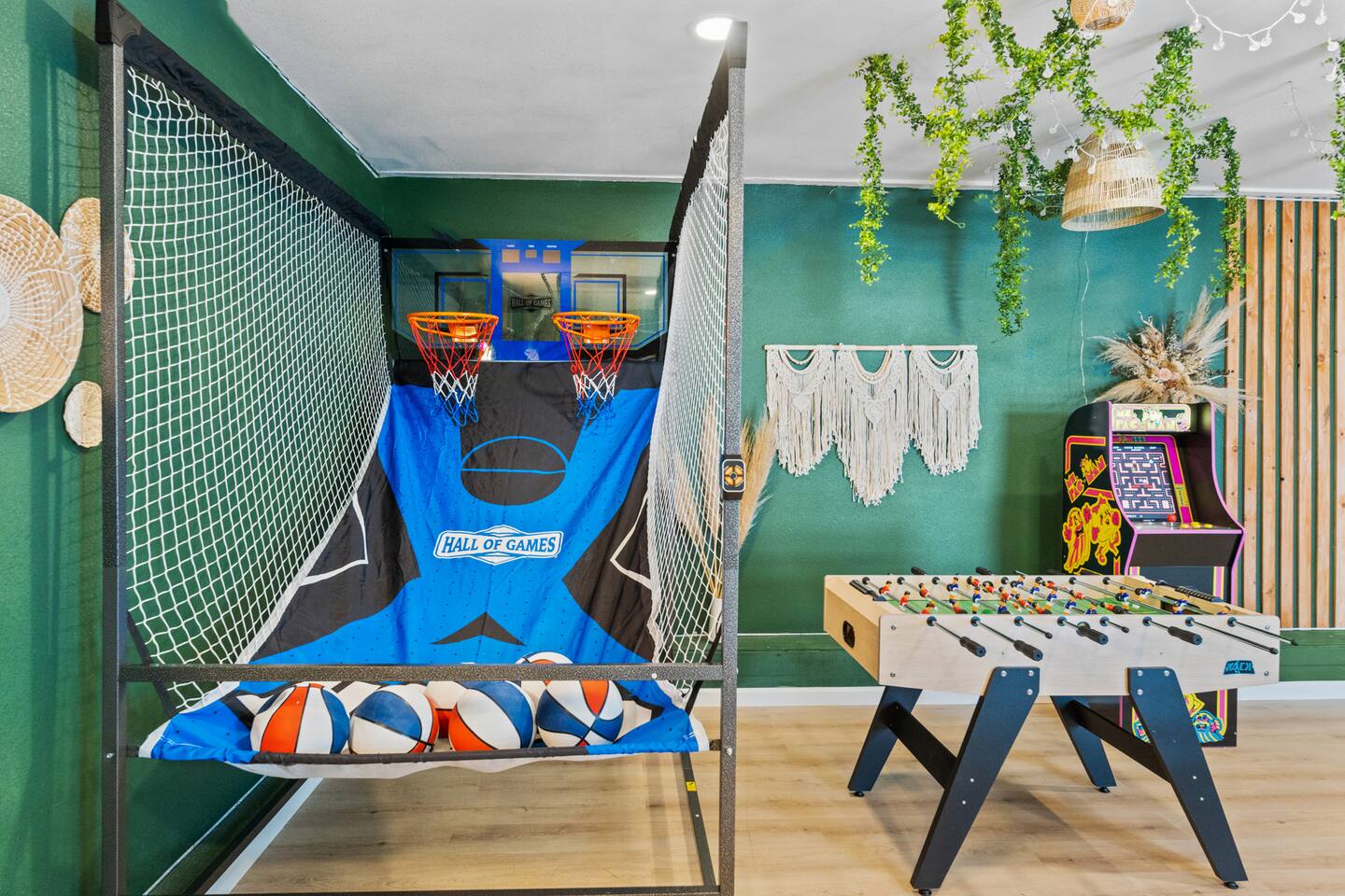 KEY FEATURES: ☀ 2 beautifully decorated bedrooms; 2 Queen-sized beds ☀ 2 full bathroom; both are showers only ☀ Open floor kitchen, dining + lounge area ☀ Fully-equipped kitchen ☀ Stocked coffee bar with assorted K-cups, whole bean coffee and coffee grounds ☀ Salt, pepper, and cooking spray are provided ☀ Large smart TV ☀ Private backyard w/ a stock tank pool, hot tub, fire pit + pergola w/ hanging hammock chairs ☀ Beautiful and fun game room complete with smart TV, Foosball, arcade games, arcade basketball and vintage popcorn machine ☀ Air conditioning + central heating ☀ Dedicated workspace + wifi ☀ External security cameras covering the front door ☀ Free on site laundry ☀ Free parking on-site ☀ Single-level home w/ stairless access ☆☆ BEDROOMS ☆☆ This perfect desert home provides you with two beautiful bedrooms to rest your head for the night. Both bedrooms are stylishly furnished with queen-sized beds and topped with extra-comfortable Zinus memory foam mattresses. Our guests rave about our luxurious mattresses! All of the spacious bedrooms are light, airy spaces and offer plenty of storage space for your clothing and personal belongings. The thoughtful touches and beautiful decor make them the perfect spot to kick back and relax after a long day seeing the sights of the desert ☆☆ BATHROOMS ☆☆ Make use of the good-sized bathrooms, complete with gorgeous tiled showers, and stylish vanity. This bright space is the perfect place for unwinding after an energetic hike through Joshua Tree National Park. ☆☆ KITCHEN & LOUNGE ☆☆ Our open-plan kitchen, dining area, and lounge are full of natural light, making it a relaxing space to gather in as a family or small group. We provide everything you need to make delicious meals, from new stainless steel appliances to a dedicated coffee station. We know how important a good cup of Joe is, so our coffee station features an automatic coffee machine as well as a drip coffee kettle. Enjoy coffee your way! Four bar stools are arranged around the kitchen island, making it a lovely spot for breakfast or just to chat with the chef. For formal and fun dinners, make use of the dining table. It’s set for four and overlooks the backyard, ideal for a relaxing meal. The whole space is completed with the spacious living room. Here you’ll be able to enjoy evenings in front of the smart TV, curling up with a good book, or enjoying the company of family and friends ☆☆ OUTSIDE SPACE ☆☆ Our favorite feature of our peaceful desert oasis house is the fully-fenced backyard. We’ve lovingly created a private, relaxing space for you to enjoy. Why not take advantage of our stock tank pool to chill out and get some refreshments from the hot weather? If hot tubs are more your thing, we’ve got you covered there, too. Next to the stock tank pool, you’ll find a heated jacuzzi, which will help you soak away any tiredness you might have from your adventures of the day. For the ultimate desert experience, turn on the pretty string lights, light up the fire pit and make some s’mores as the evening draws in. Stargazing is a must when you’re in the desert, and you can do so at the pergola, where you’ll be able to sway under the stars in a cozy hammock. ☆☆Game Room ☆☆ Check out the newly remodeled game room and challenge your friends or family to some friendly competition on the Foosball Table, Arcade Basketball or Ms. Pacman. After the winner is crowned, relax on the couch enjoying some popcorn from the vintage popcorn machine! ★☆ Book Today & Let Us Take Care Of You In Joshua Tree! ☆★