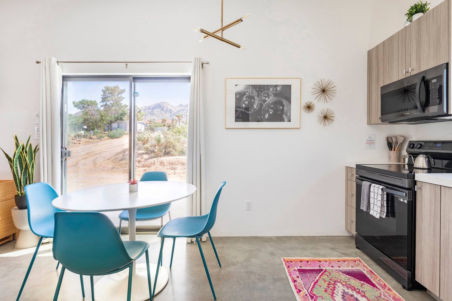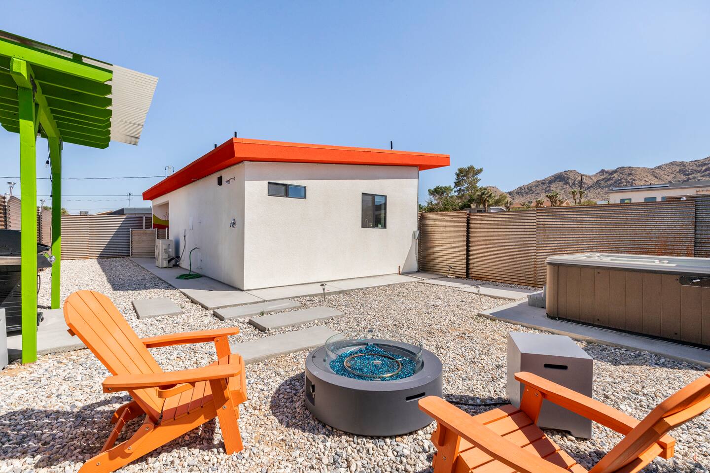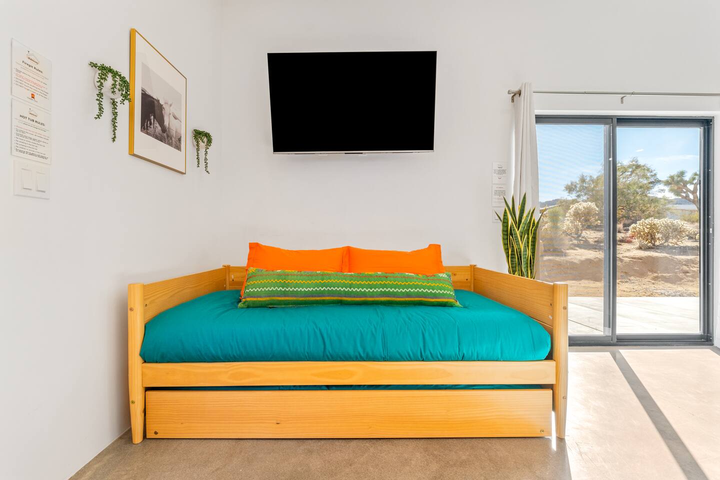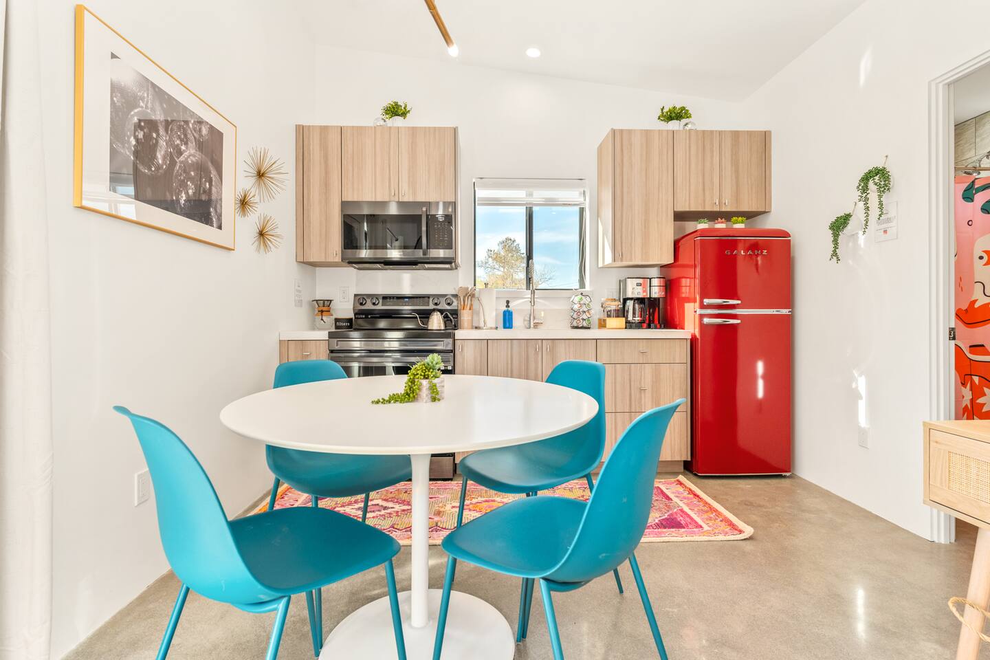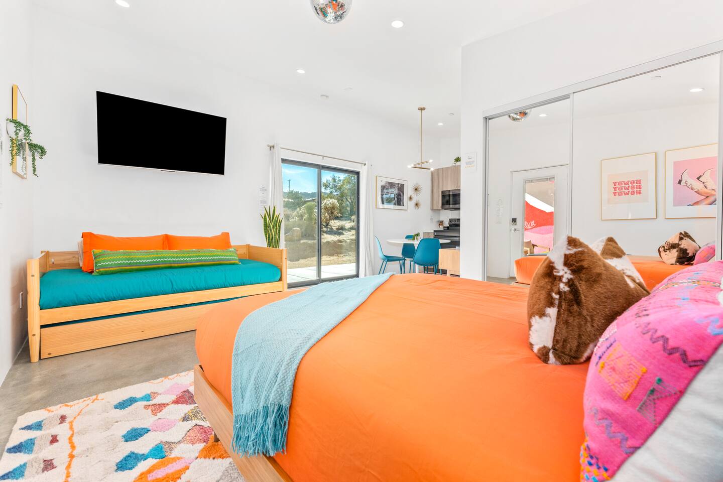 KEY FEATURES ☀ Spacious 391 square foot studio with 1 Queen sized bed and 2 Twin size trundle beds ☀ 1 full bathroom w/ shower ☀ Full kitchen, with all the tools needed to make a delicious meal! (there is no dishwasher available) ☀ Stocked coffee bar with assorted K-cups, whole bean coffee and coffee grounds ☀ Salt, pepper, and cooking spray are provided ☀ 55” flat screen TV with access to all streaming platforms (logins not provided) ☀ Free WiFi ☀ Washer + dryer ☀ Easy access; no steps to entry ☀ Convenient location; short drive to National Park, restaurants and activities ☀ Beautiful Views of Joshua Tree Mountain Range ☀ Fully fenced in backyard with hot tub, outdoor shower, propane fire pit, and pergola with hanging hammock chairs ☆☆ BEDROOM & LIVING AREA ☆☆ Ultimate comfort and relaxation awaits you on our Queen size bed with Zinus memory foam mattress. There are also two Twin size trundle beds perfect for additional guests or kids. (FYI, there is no wall/room that separates these beds from one another. You will all be sleeping in the same “room”) You can have a cozy movie night relaxing in bed and watch your favorite shows on the 55” TV. Netflix, Hulu and Disney+ are available for your use, but you will need to provide your own login ☆☆ BATHROOMS ☆☆ There is one full size bathroom complete with plush bath linen, towels for the spa, hairdryer and first aid kit ☆☆ KITCHEN & DINING ROOM ☆☆ The fully equipped kitchen has everything you’ll need for whipping up tasty meals for the whole group, including stainless steel appliances, a toaster, a blender, a coffee machine, a Keurig, and all the basic kitchen essentials like pots, pans, plates, cups, and utensils. Enjoy meals together at the kitchen table with seating for 4. There is a stocked coffee bar with assorted K-cups, whole bean coffee and coffee grounds. Salt, pepper, and cooking spray are also included! ☆☆ OUTSIDE SPACE ☆☆ Step outside and into your private desert oasis. The entire backyard is fenced in, not only for your privacy, but also so your furry friends can safely explore! The best part about coming to Joshua Tree is being able to enjoy the outdoors and we think the backyard will do just that. The backyard features a hot tub, great for soaking in after long days hiking in the national park, as well as a fire pit surrounded by a pergola with hanging hammock chairs which is perfect for enjoying the starry night skies. ★☆ Book Today & Let Us Take Care Of You In Joshua Tree! ☆★