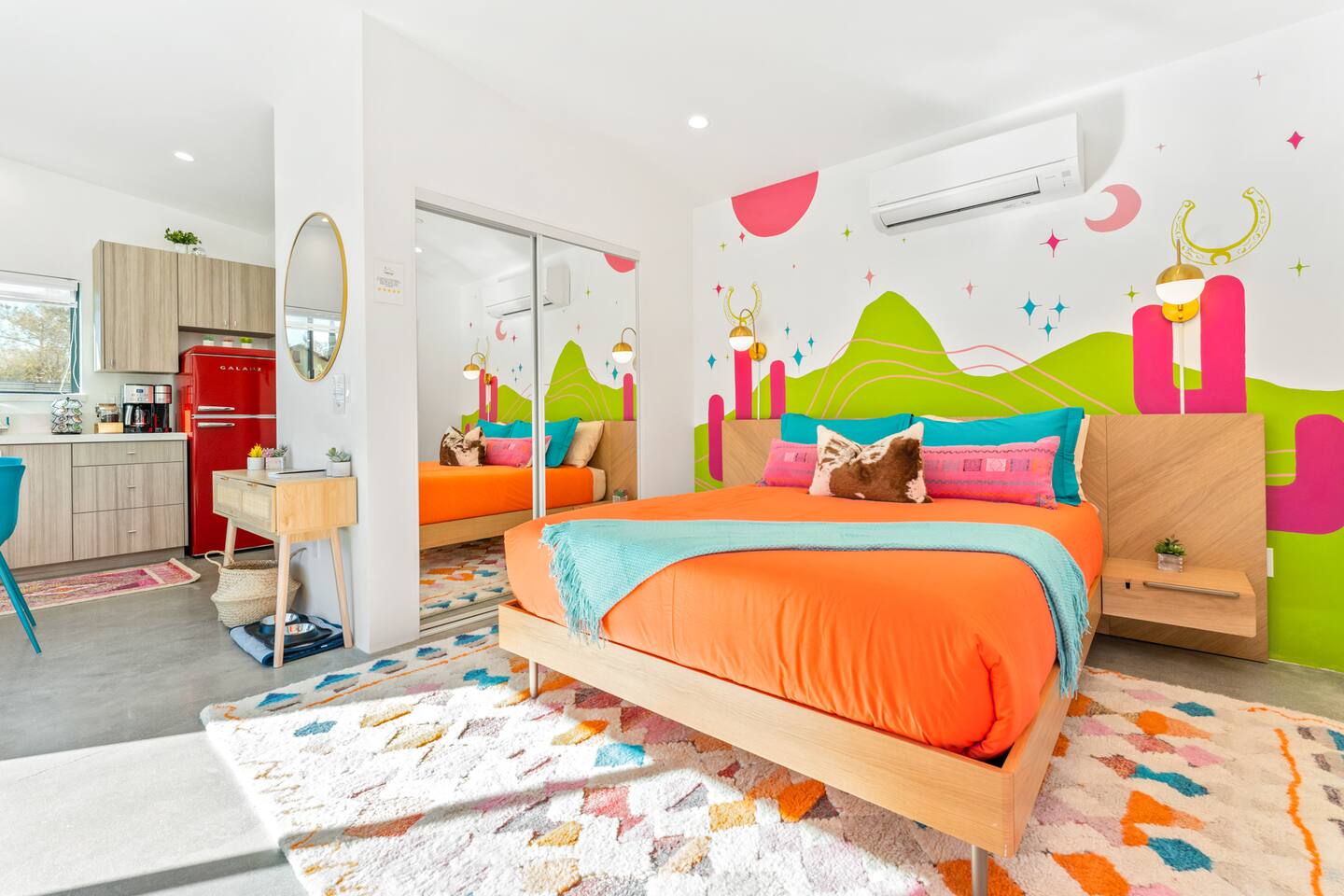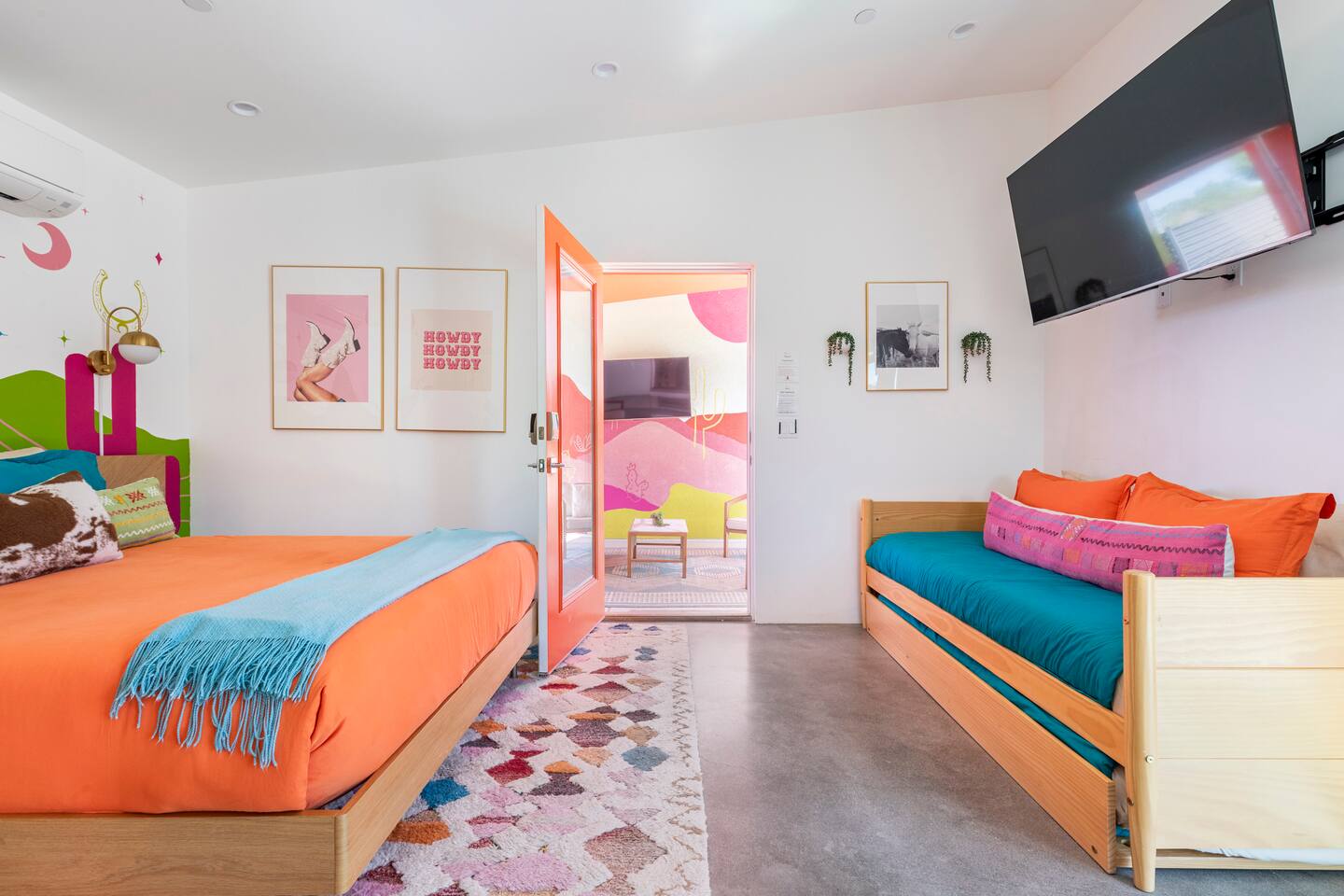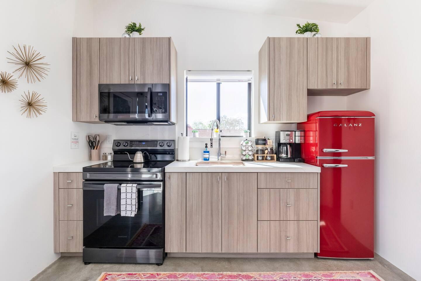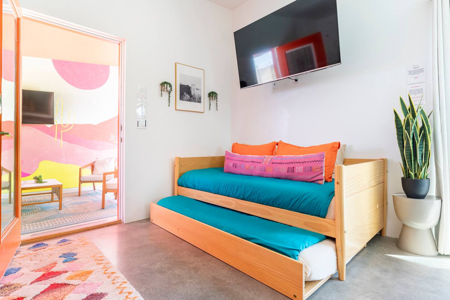 KEY FEATURES ☀ Spacious 391 square foot studio with 1 Queen sized bed and 2 Twin size trundle beds ☀ 1 full bathroom w/ shower ☀ Full kitchen, with all the tools needed to make a delicious meal! (there is no dishwasher available) ☀ Stocked coffee bar with assorted K-cups, whole bean coffee and coffee grounds ☀ Salt, pepper, and cooking spray are provided ☀ 55” flat screen TV with access to all streaming platforms (logins not provided) ☀ Free WiFi ☀ Washer + dryer ☀ Easy access; no steps to entry ☀ Convenient location; short drive to National Park, restaurants and activities ☀ Beautiful Views of Joshua Tree Mountain Range ☀ Fully fenced in backyard with hot tub, outdoor shower, propane fire pit, and pergola with hanging hammock chairs ☆☆ BEDROOM & LIVING AREA ☆☆ Ultimate comfort and relaxation awaits you on our Queen size bed with Zinus memory foam mattress. There are also two Twin size trundle beds perfect for additional guests or kids. (FYI, there is no wall/room that separates these beds from one another. You will all be sleeping in the same “room”) You can have a cozy movie night relaxing in bed and watch your favorite shows on the 55” TV. Netflix, Hulu and Disney+ are available for your use, but you will need to provide your own login ☆☆ BATHROOMS ☆☆ There is one full size bathroom complete with plush bath linen, towels for the spa, hairdryer and first aid kit ☆☆ KITCHEN & DINING ROOM ☆☆ The fully equipped kitchen has everything you’ll need for whipping up tasty meals for the whole group, including stainless steel appliances, a toaster, a blender, a coffee machine, a Keurig, and all the basic kitchen essentials like pots, pans, plates, cups, and utensils. Enjoy meals together at the kitchen table with seating for 4. There is a stocked coffee bar with assorted K-cups, whole bean coffee and coffee grounds. Salt, pepper, and cooking spray are also included! ☆☆ OUTSIDE SPACE ☆☆ Step outside and into your private desert oasis. The entire backyard is fenced in, not only for your privacy, but also so your furry friends can safely explore! The best part about coming to Joshua Tree is being able to enjoy the outdoors and we think the backyard will do just that. The backyard features a hot tub, great for soaking in after long days hiking in the national park, as well as a fire pit surrounded by a pergola with hanging hammock chairs which is perfect for enjoying the starry night skies. ★☆ Book Today & Let Us Take Care Of You In Joshua Tree! ☆★