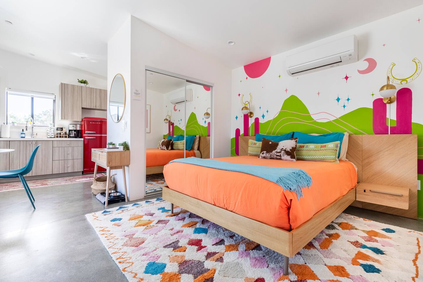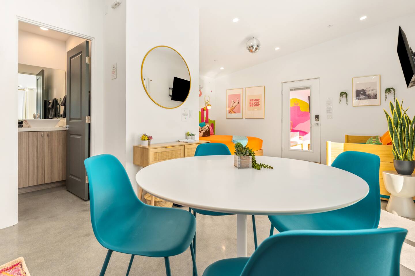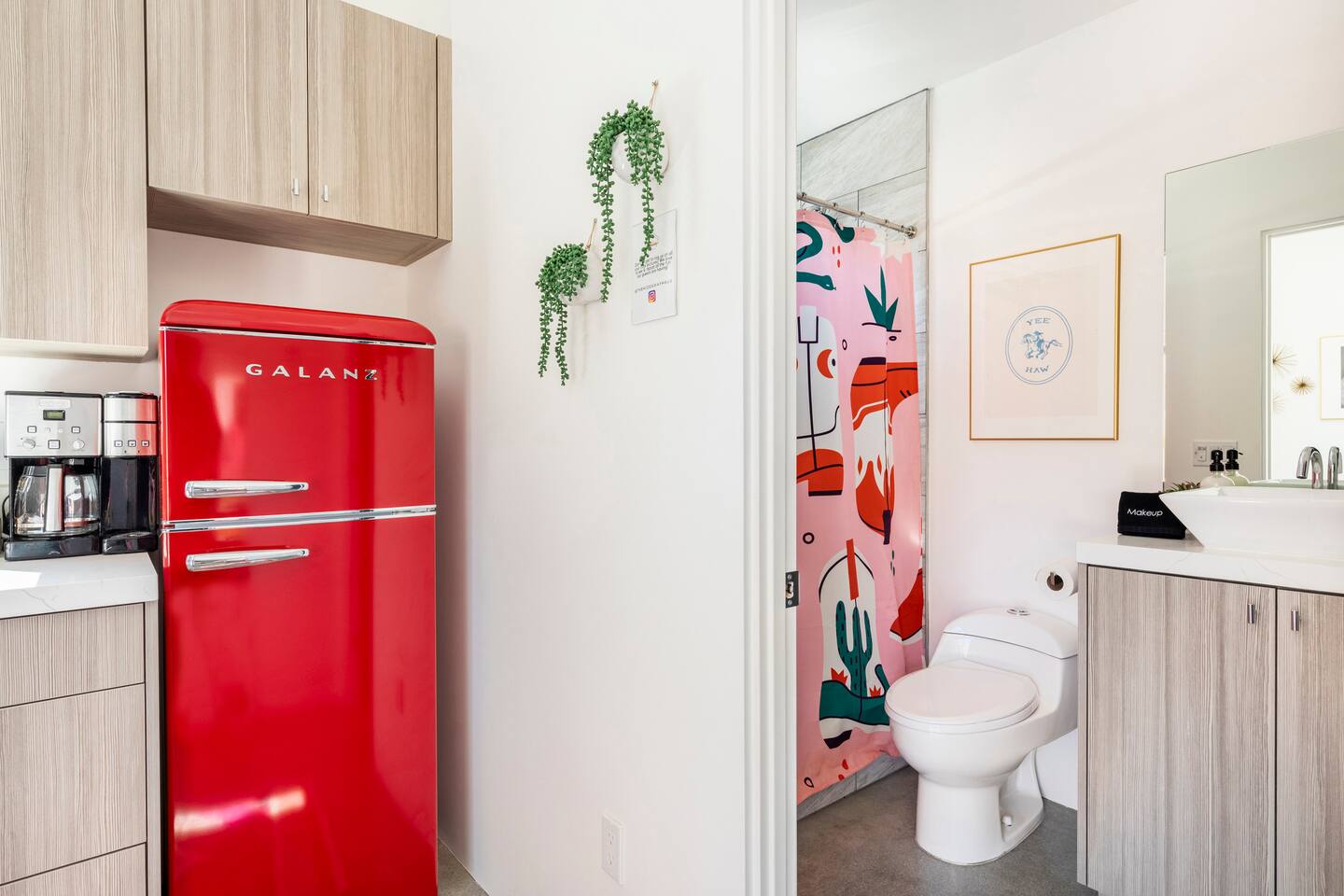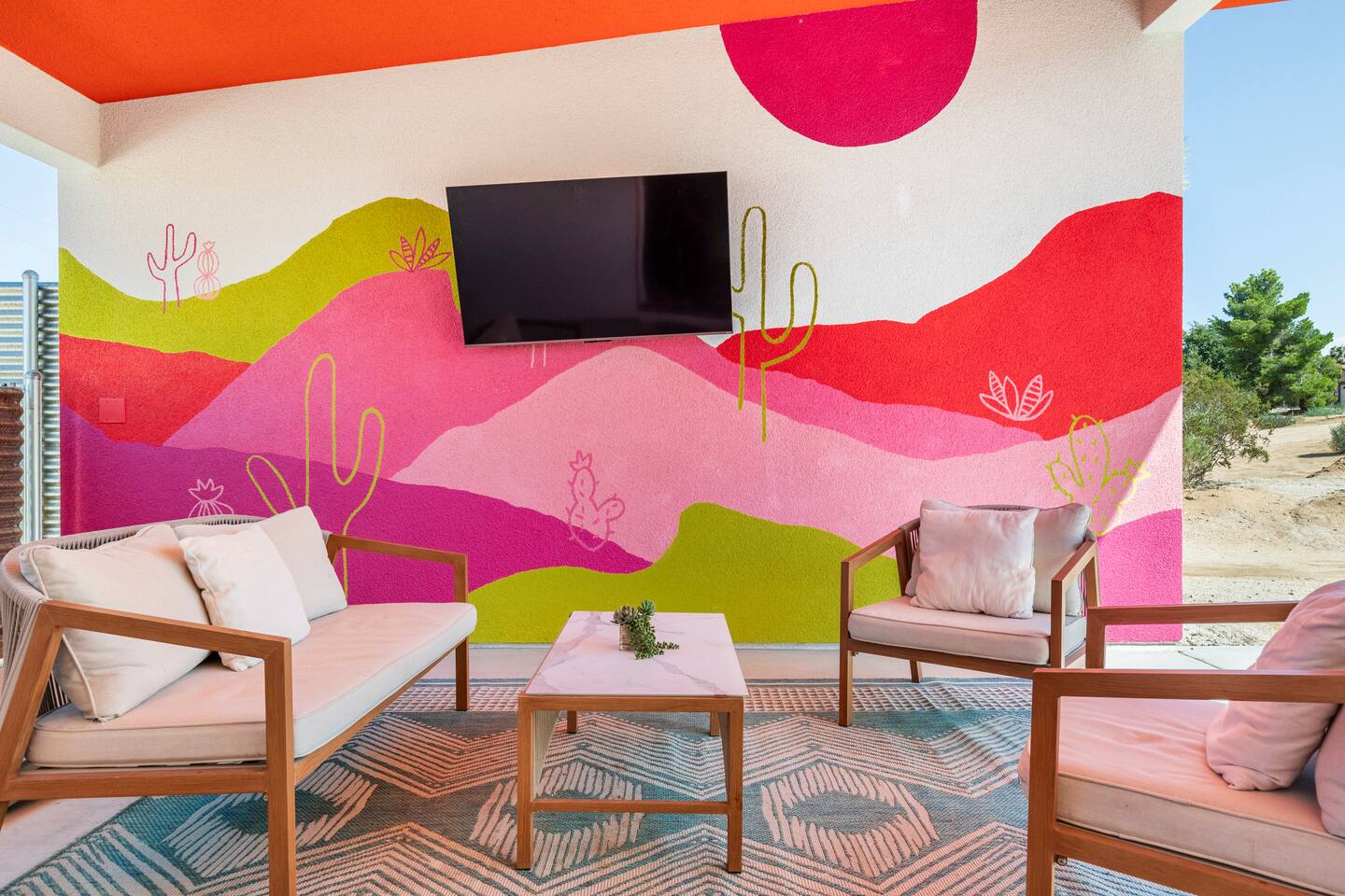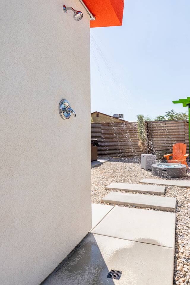KEY FEATURES ☀ Spacious 391 square foot studio with 1 Queen sized bed and 2 Twin size trundle beds ☀ 1 full bathroom w/ shower ☀ Full kitchen, with all the tools needed to make a delicious meal! (there is no dishwasher available) ☀ Stocked coffee bar with assorted K-cups, whole bean coffee and coffee grounds ☀ Salt, pepper, and cooking spray are provided ☀ 55” flat screen TV with access to all streaming platforms (logins not provided) ☀ Free WiFi ☀ Washer + dryer ☀ Easy access; no steps to entry ☀ Convenient location; short drive to National Park, restaurants and activities ☀ Beautiful Views of Joshua Tree Mountain Range ☀ Fully fenced in backyard with hot tub, outdoor shower, propane fire pit, and pergola with hanging hammock chairs ☆☆ BEDROOM & LIVING AREA ☆☆ Ultimate comfort and relaxation awaits you on our Queen size bed with Zinus memory foam mattress. There are also two Twin size trundle beds perfect for additional guests or kids. (FYI, there is no wall/room that separates these beds from one another. You will all be sleeping in the same “room”) You can have a cozy movie night relaxing in bed and watch your favorite shows on the 55” TV. Netflix, Hulu and Disney+ are available for your use, but you will need to provide your own login ☆☆ BATHROOMS ☆☆ There is one full size bathroom complete with plush bath linen, towels for the spa, hairdryer and first aid kit ☆☆ KITCHEN & DINING ROOM ☆☆ The fully equipped kitchen has everything you’ll need for whipping up tasty meals for the whole group, including stainless steel appliances, a toaster, a blender, a coffee machine, a Keurig, and all the basic kitchen essentials like pots, pans, plates, cups, and utensils. Enjoy meals together at the kitchen table with seating for 4. There is a stocked coffee bar with assorted K-cups, whole bean coffee and coffee grounds. Salt, pepper, and cooking spray are also included! ☆☆ OUTSIDE SPACE ☆☆ Step outside and into your private desert oasis. The entire backyard is fenced in, not only for your privacy, but also so your furry friends can safely explore! The best part about coming to Joshua Tree is being able to enjoy the outdoors and we think the backyard will do just that. The backyard features a hot tub, great for soaking in after long days hiking in the national park, as well as a fire pit surrounded by a pergola with hanging hammock chairs which is perfect for enjoying the starry night skies. ★☆ Book Today & Let Us Take Care Of You In Joshua Tree! ☆★