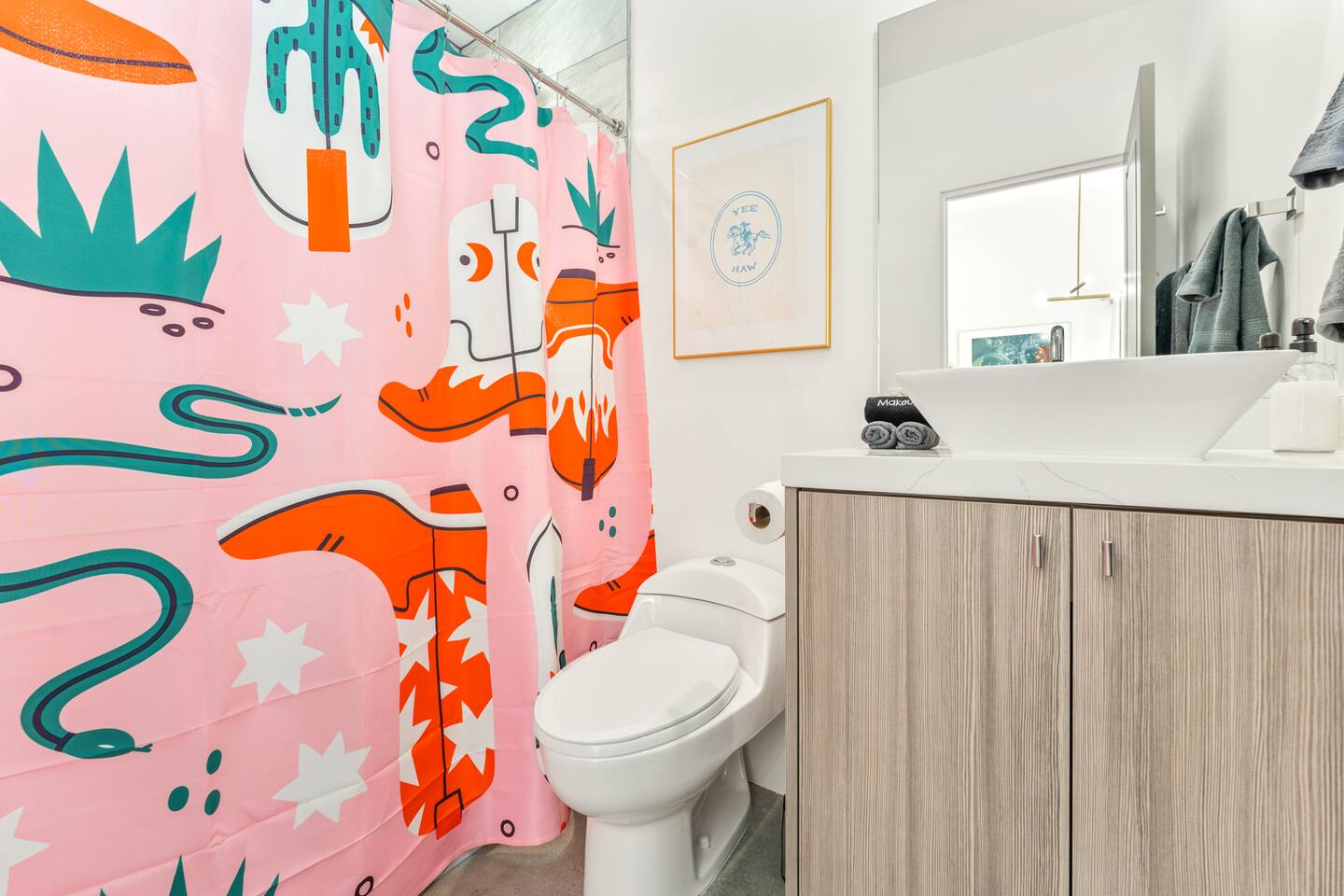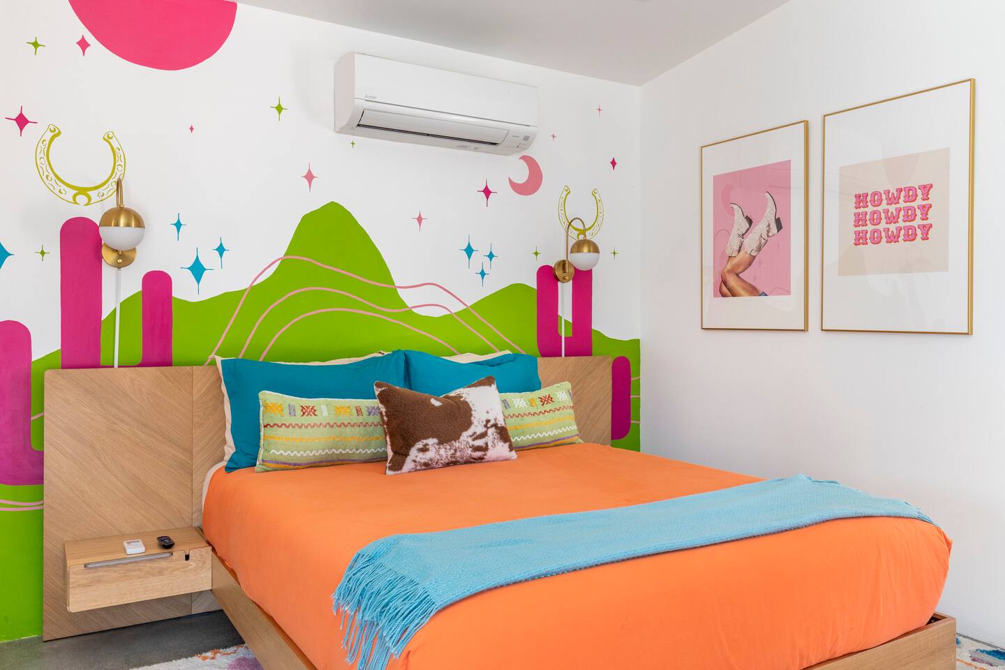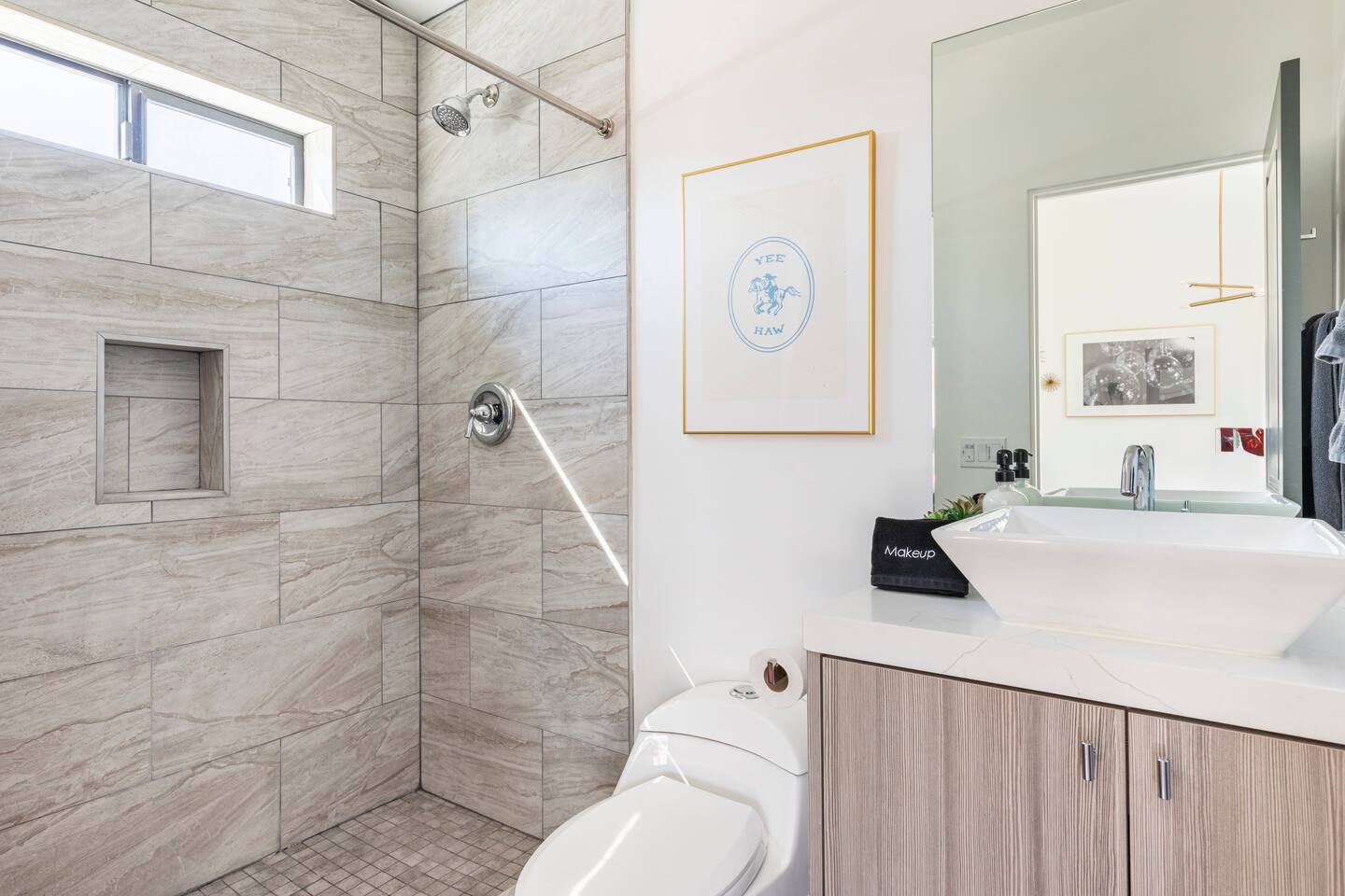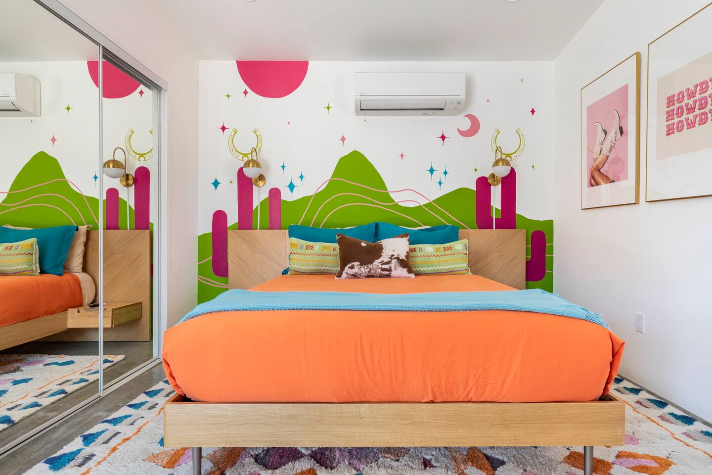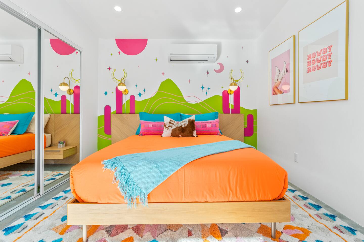 KEY FEATURES ☀ Spacious 391 square foot studio with 1 Queen sized bed and 2 Twin size trundle beds ☀ 1 full bathroom w/ shower ☀ Full kitchen, with all the tools needed to make a delicious meal! (there is no dishwasher available) ☀ Stocked coffee bar with assorted K-cups, whole bean coffee and coffee grounds ☀ Salt, pepper, and cooking spray are provided ☀ 55” flat screen TV with access to all streaming platforms (logins not provided) ☀ Free WiFi ☀ Washer + dryer ☀ Easy access; no steps to entry ☀ Convenient location; short drive to National Park, restaurants and activities ☀ Beautiful Views of Joshua Tree Mountain Range ☀ Fully fenced in backyard with hot tub, outdoor shower, propane fire pit, and pergola with hanging hammock chairs ☆☆ BEDROOM & LIVING AREA ☆☆ Ultimate comfort and relaxation awaits you on our Queen size bed with Zinus memory foam mattress. There are also two Twin size trundle beds perfect for additional guests or kids. (FYI, there is no wall/room that separates these beds from one another. You will all be sleeping in the same “room”) You can have a cozy movie night relaxing in bed and watch your favorite shows on the 55” TV. Netflix, Hulu and Disney+ are available for your use, but you will need to provide your own login ☆☆ BATHROOMS ☆☆ There is one full size bathroom complete with plush bath linen, towels for the spa, hairdryer and first aid kit ☆☆ KITCHEN & DINING ROOM ☆☆ The fully equipped kitchen has everything you’ll need for whipping up tasty meals for the whole group, including stainless steel appliances, a toaster, a blender, a coffee machine, a Keurig, and all the basic kitchen essentials like pots, pans, plates, cups, and utensils. Enjoy meals together at the kitchen table with seating for 4. There is a stocked coffee bar with assorted K-cups, whole bean coffee and coffee grounds. Salt, pepper, and cooking spray are also included! ☆☆ OUTSIDE SPACE ☆☆ Step outside and into your private desert oasis. The entire backyard is fenced in, not only for your privacy, but also so your furry friends can safely explore! The best part about coming to Joshua Tree is being able to enjoy the outdoors and we think the backyard will do just that. The backyard features a hot tub, great for soaking in after long days hiking in the national park, as well as a fire pit surrounded by a pergola with hanging hammock chairs which is perfect for enjoying the starry night skies. ★☆ Book Today & Let Us Take Care Of You In Joshua Tree! ☆★