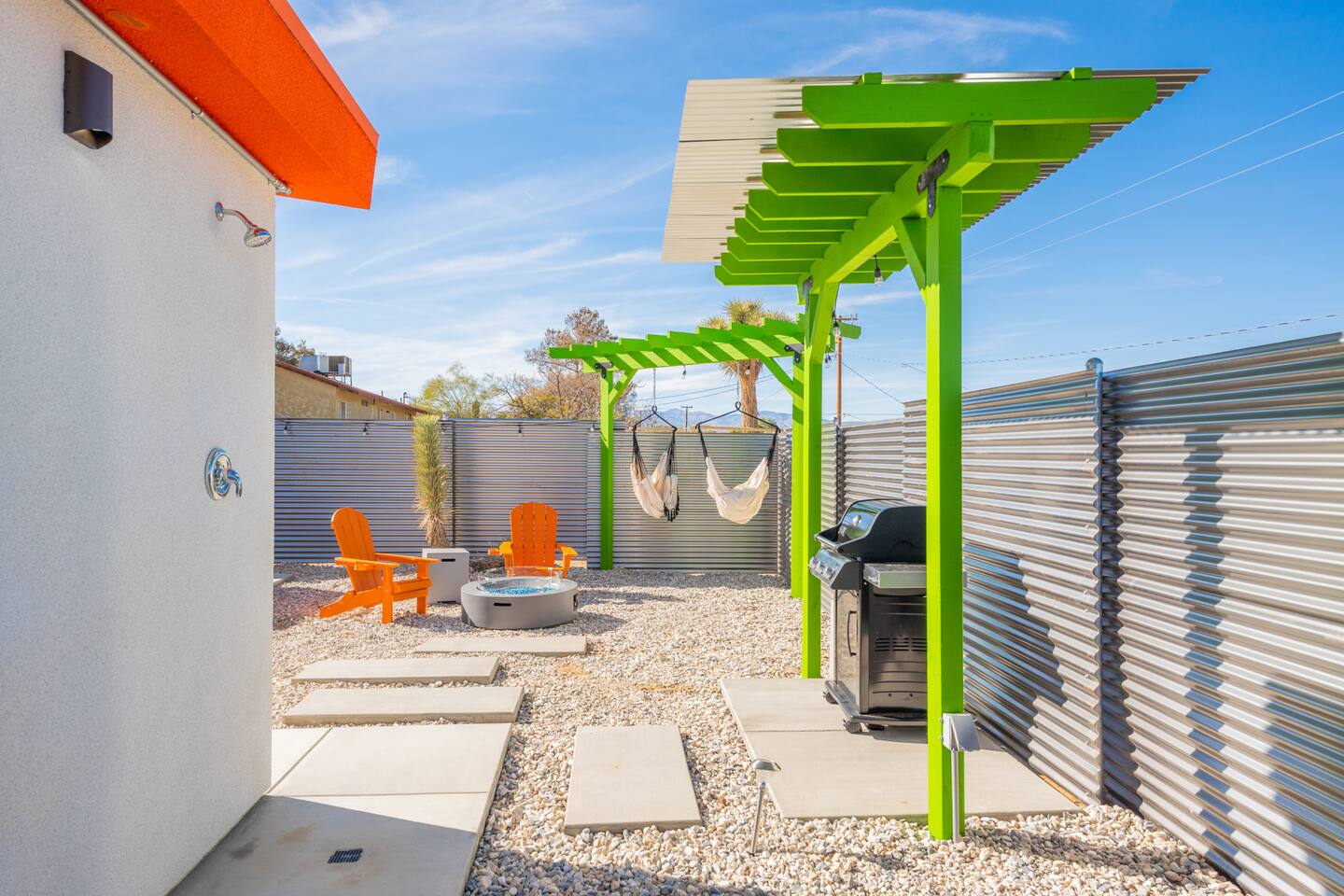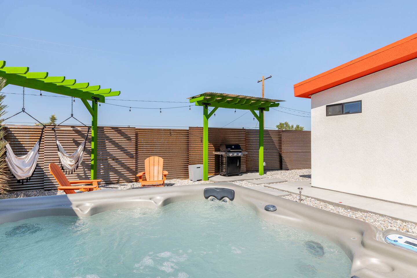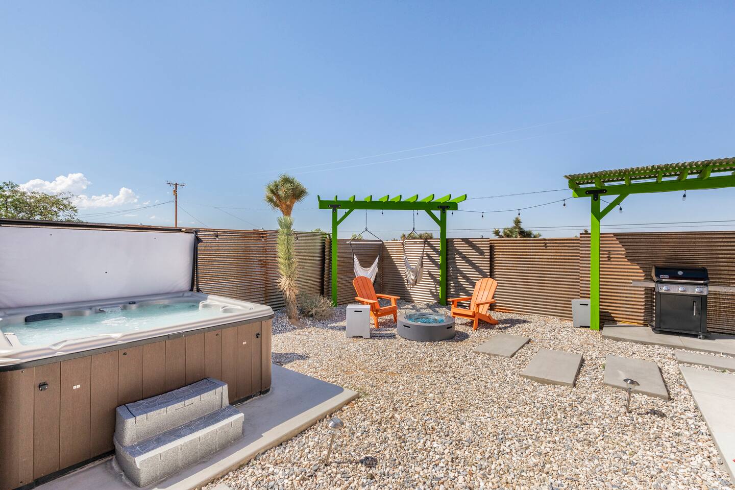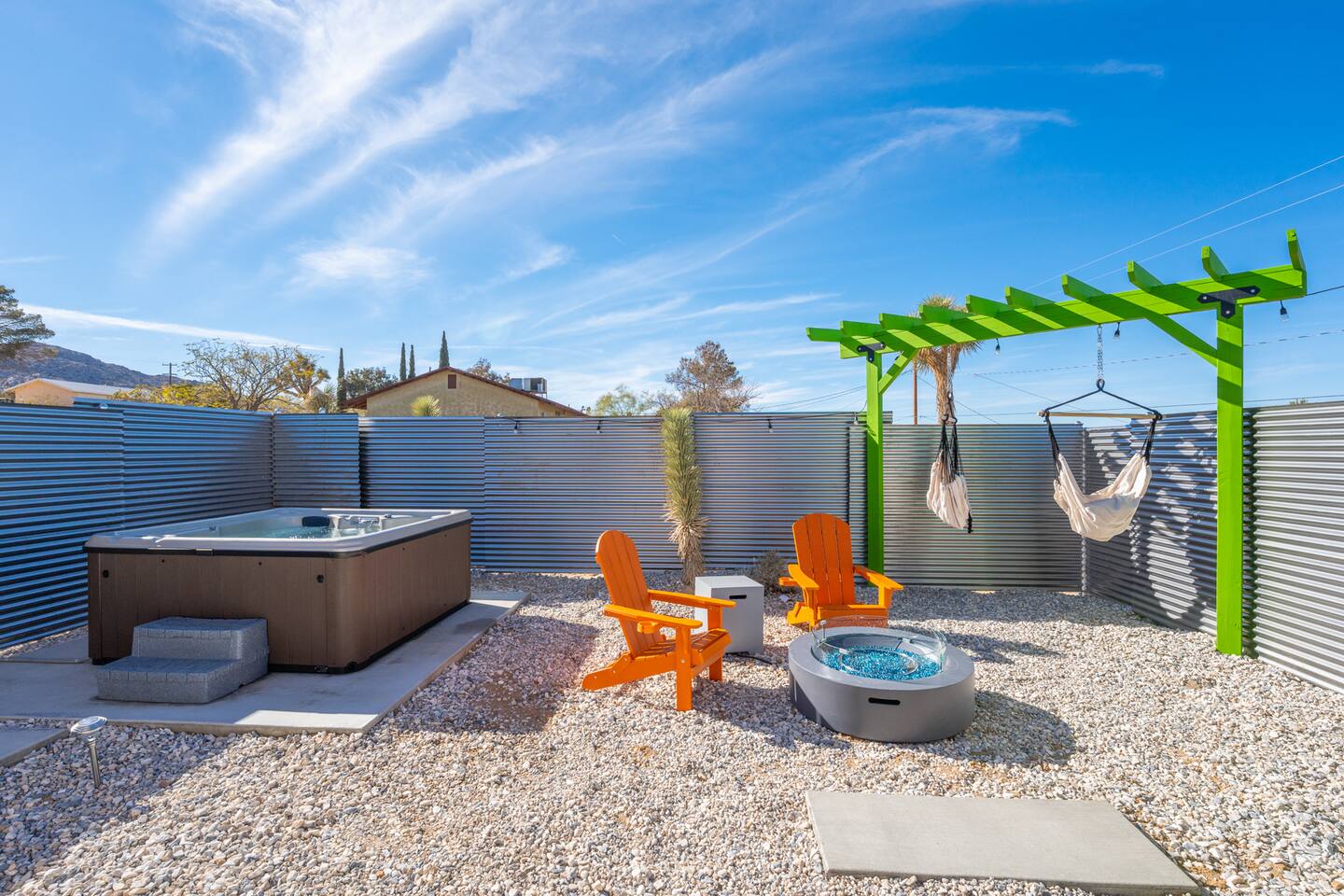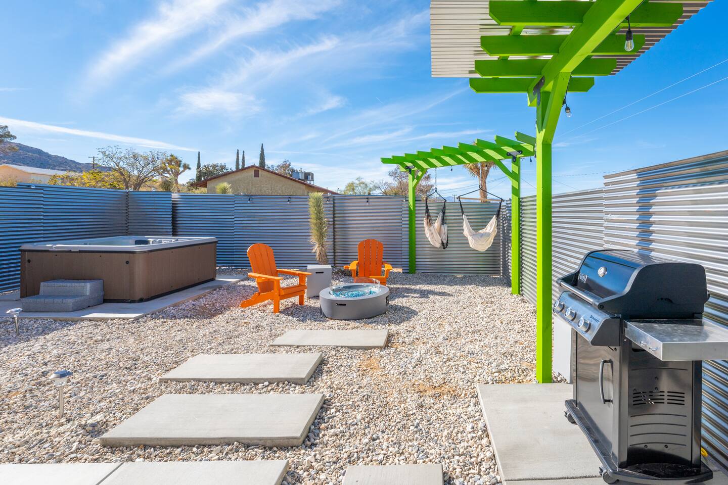 A beautiful desert oasis awaits you, perfect for work or play. Our tiny home was carefully designed to give you the perfect escape from the stresses of life. This is the ideal getaway for a couple or small group and includes a fully fenced in yard, hot tub, outdoor shower, grill, fire pit and pergola with hanging hammock chairs to enjoy the night sky. 11 Min to the West Entrance to Joshua Tree National Park 5 Min to downtown JT 6 Min to Walmart