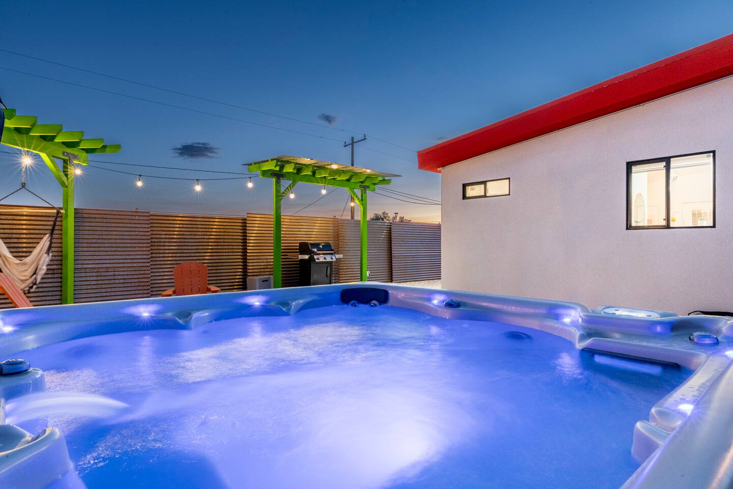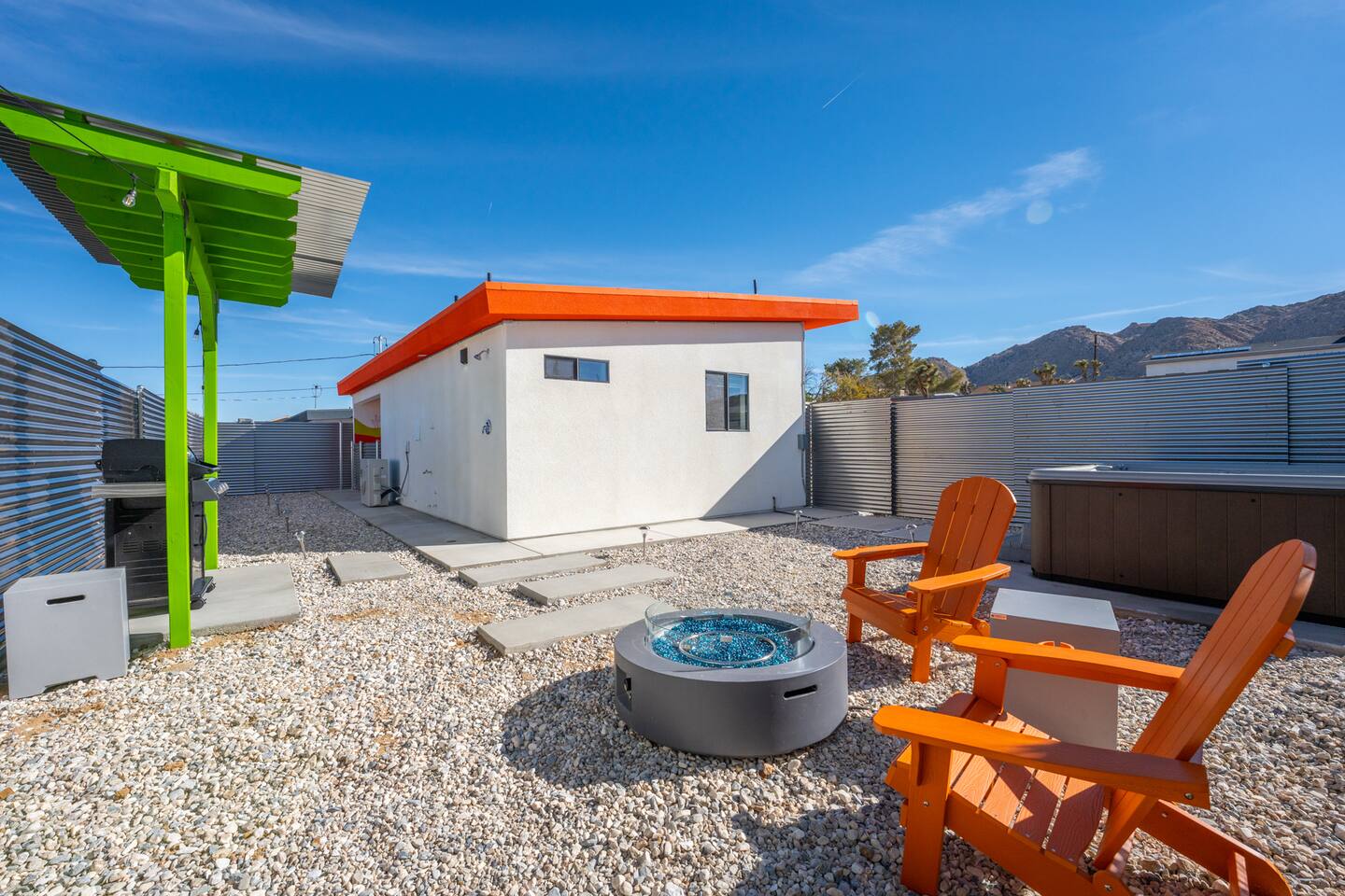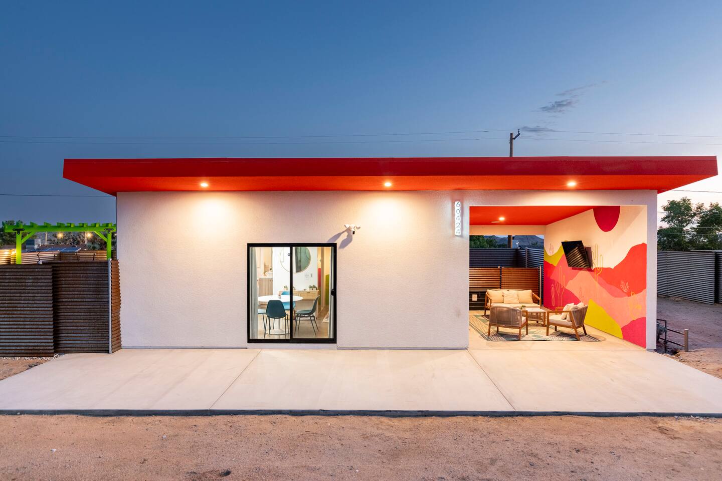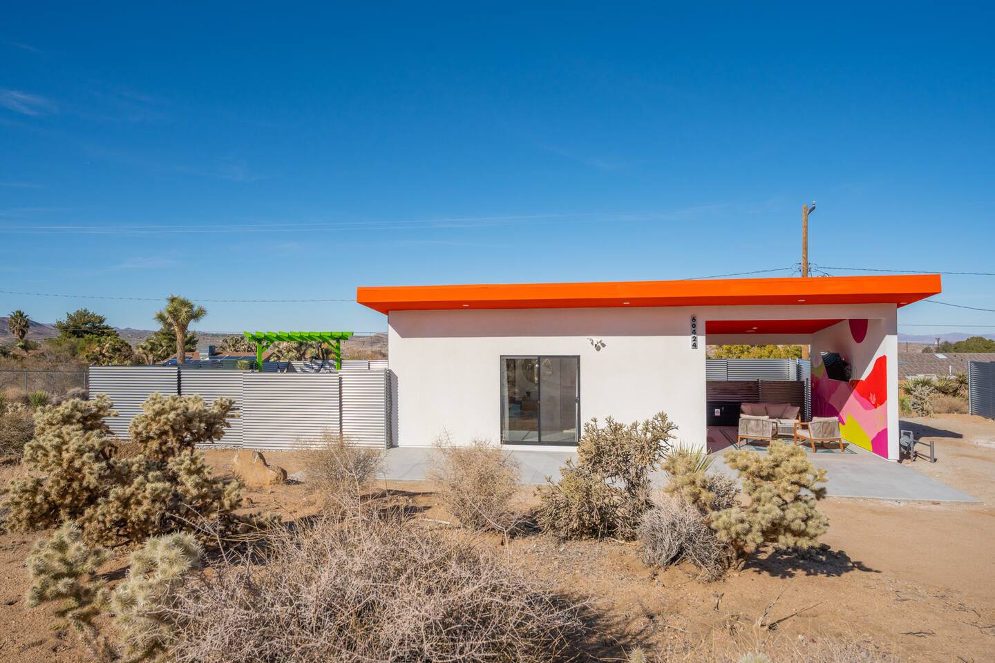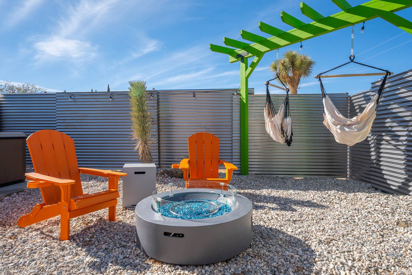 A beautiful desert oasis awaits you, perfect for work or play. Our tiny home was carefully designed to give you the perfect escape from the stresses of life. This is the ideal getaway for a couple or small group and includes a fully fenced in yard, hot tub, outdoor shower, grill, fire pit and pergola with hanging hammock chairs to enjoy the night sky. 11 Min to the West Entrance to Joshua Tree National Park 5 Min to downtown JT 6 Min to Walmart