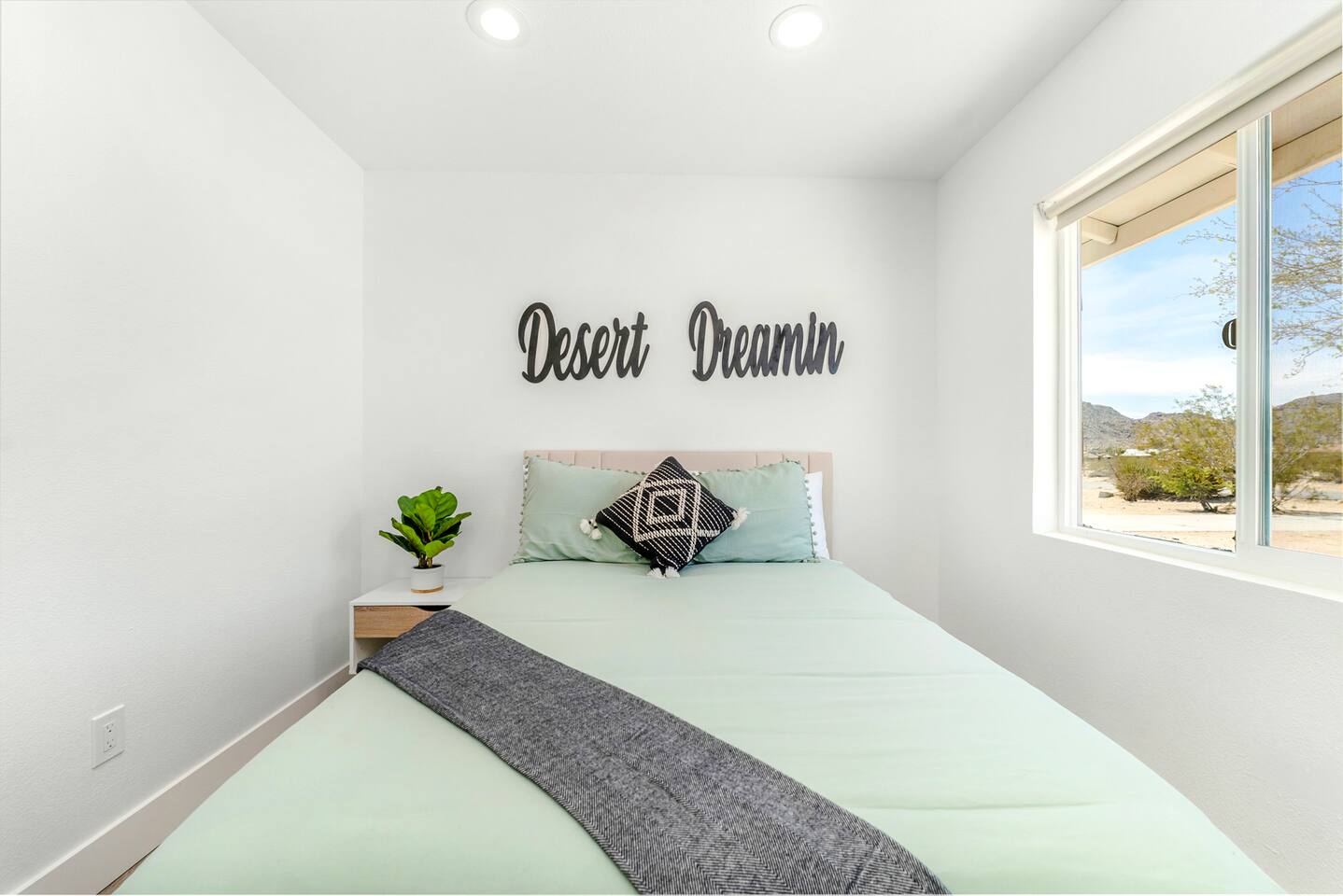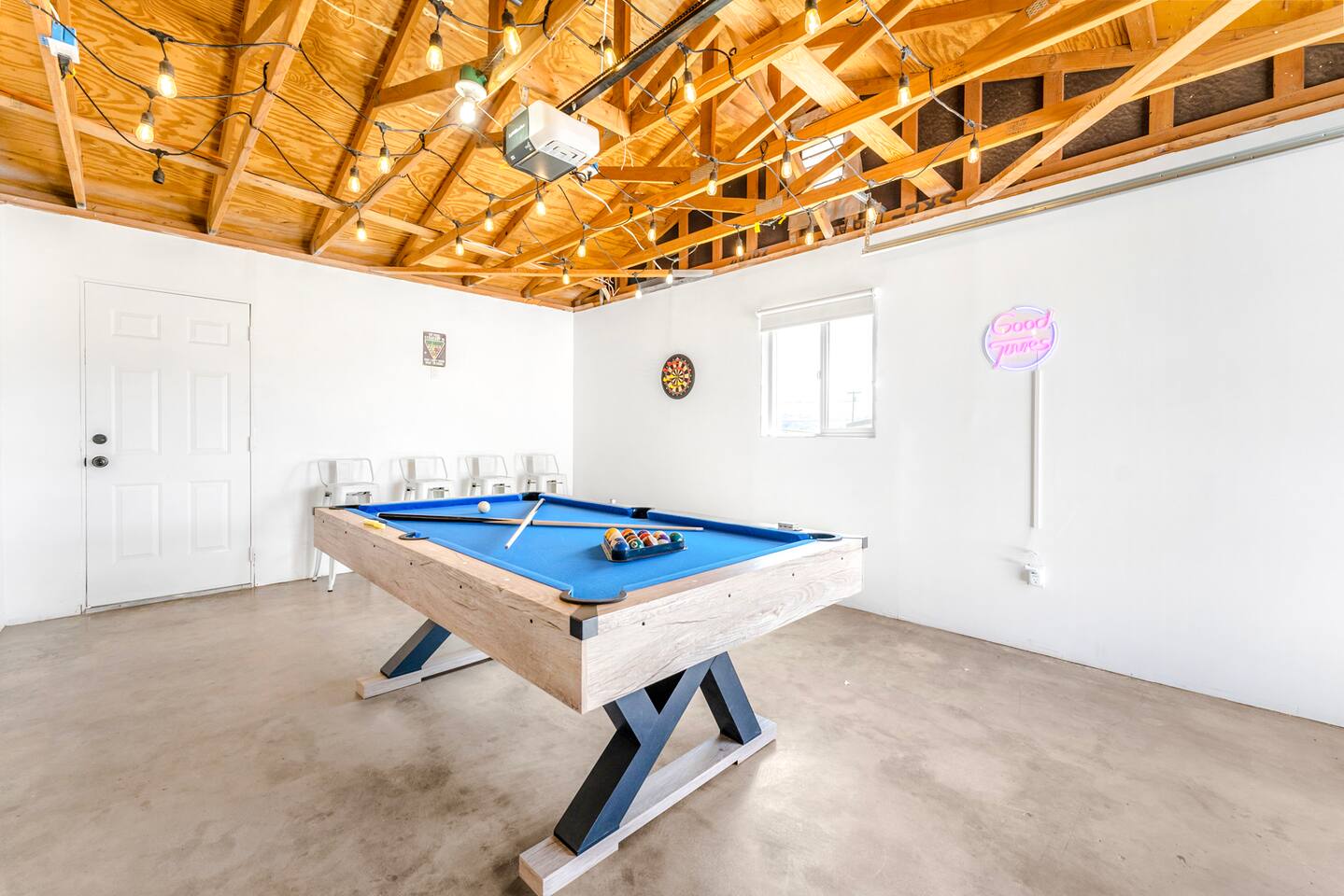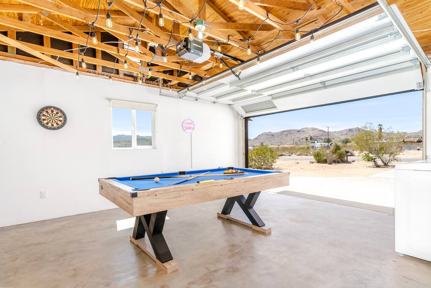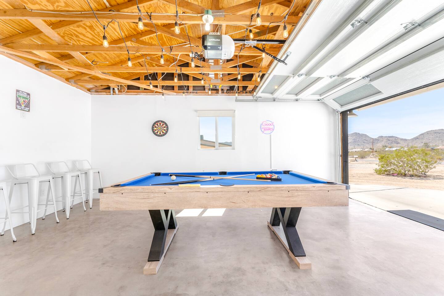 KEY FEATURES: ☀ 3 large bedrooms; The master bedroom has a queen size bed and the two guest bedrooms have Full size mattresses ☀ 2 full bathrooms; one is an ensuite bathroom connected to the master and the second bathroom is a shared bathroom ☀ Open floor kitchen, dining + lounge area ☀ Fully-equipped kitchen ☀ Stocked coffee bar with assorted K-cups, whole bean coffee and coffee grounds ☀ Salt, pepper, and cooking spray are provided ☀ Large smart TV ☀ Private backyard w/ a stock tank pool, hot tub, fire pit + pergola w/ hanging hammock chairs ☀ Air conditioning + central heating ☀ Free high speed WiFi ☀ External security cameras covering the front door ☀ Free parking on-site ☀ Onsite laundry in the garage ☀ Single-level home w/ stairless access ☀ Located in a quiet community ☀Game room in the garage with pool table, dart board, and TV ☆☆ BEDROOMS ☆☆ This perfect desert home provides you with three beautiful bedrooms to rest your head for the night. The master bedroom features a Queen size Zinus mattress with ensuite bathroom. The two guest rooms are stylishly furnished with full-sized beds and topped with extra-comfortable Zuris memory foam mattresses. Our guests rave about our luxurious mattresses! All of the spacious bedrooms are light, airy spaces and offer plenty of storage space for your clothing and personal belongings. The thoughtful touches and beautiful decor make them the perfect spot to kick back and relax after a long day seeing the sights of the beautiful Joshua Tree. ☆☆ BATHROOMS ☆☆ Make use of the 2 full bathrooms, complete with a shower, stylish vanity, and plush bath linen. These bright spaces are the perfect place for unwinding after an energetic hike through Joshua Tree National Park. ☆☆ KITCHEN & LOUNGE ☆☆ Our open-plan kitchen, dining area, and lounge are full of natural light, making it a relaxing space to gather in as a family or small group. We provide everything you need to make delicious meals, from new stainless steel appliances to a dedicated coffee station. We know how important a good cup of Joe is, so our coffee station features an automatic coffee machine as well as a drip coffee kettle. Enjoy coffee your way! Two bar stools are arranged around the kitchen island, making it a lovely spot for breakfast or just to chat with the chef. For formal and fun dinners, make use of the dining table that has seating for 6, or enjoy dinner around the outdoor patio set and enjoy the setting desert dun The whole space is completed with the spacious living room decorated in desert-chic style. Here you’ll be able to enjoy evenings in front of the smart TV, curling up with a good book, or chatting with friends and family. ☆☆ OUTSIDE SPACE ☆☆ Our favorite feature of our peaceful desert oasis house is the fully-fenced backyard. We’ve lovingly created a private, relaxing space for you to enjoy. Why not take advantage of our stock tank pool to chill out and get some refreshments from the hot weather? If hot tubs are more your thing, we’ve got you covered there, too. Next to the stock tank pool, you’ll find a heated jacuzzi, which will help you soak away any tiredness you might have from your adventures of the day. For the ultimate desert experience, turn on the pretty string lights, light up the fire pit and make some s’mores as the evening draws in. Stargazing is a must when you’re in the desert, and you can do so at the pergola, where you’ll be able to sway under the stars in a cozy hammock. ★☆ Book Today & Let Us Take Care Of You In Joshua Tree! ☆★