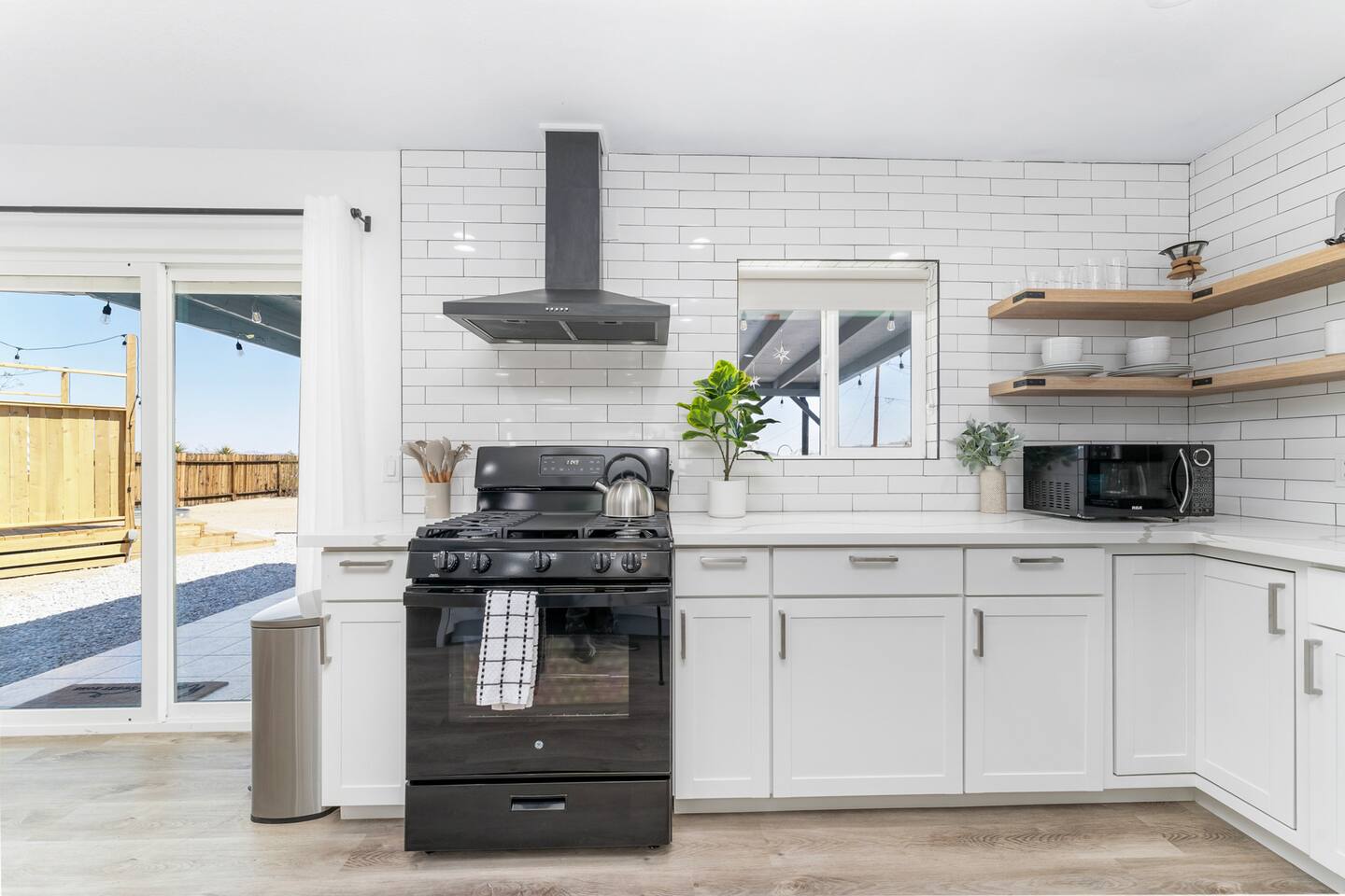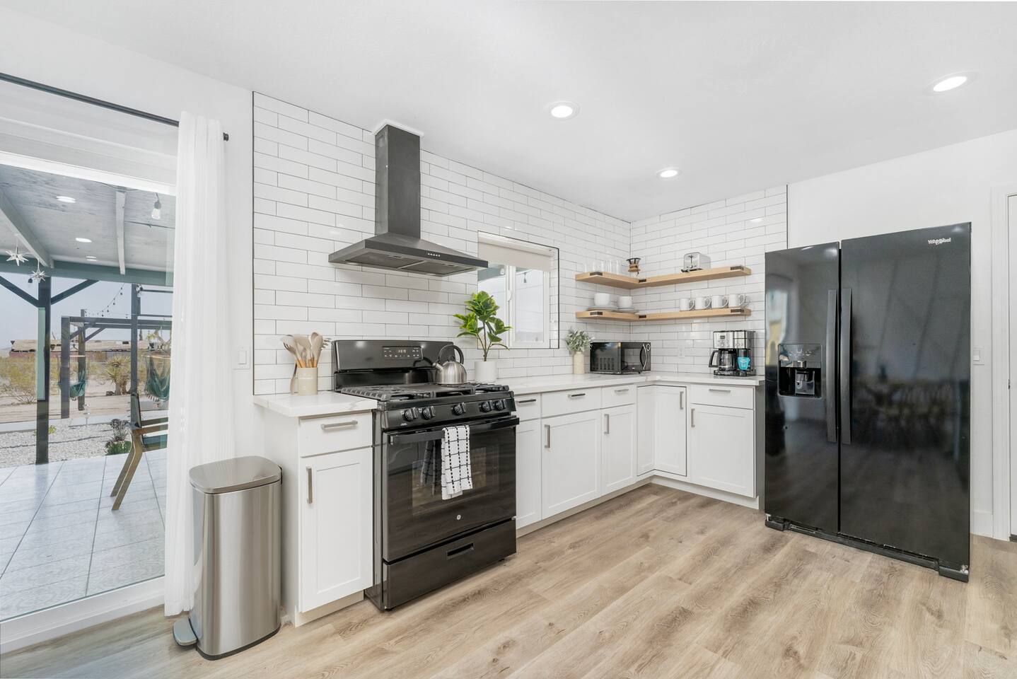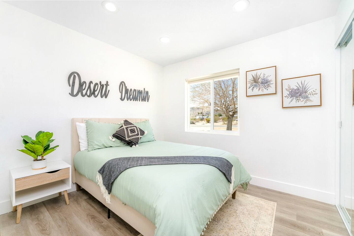 KEY FEATURES: ☀ 3 large bedrooms; The master bedroom has a queen size bed and the two guest bedrooms have Full size mattresses ☀ 2 full bathrooms; one is an ensuite bathroom connected to the master and the second bathroom is a shared bathroom ☀ Open floor kitchen, dining + lounge area ☀ Fully-equipped kitchen ☀ Stocked coffee bar with assorted K-cups, whole bean coffee and coffee grounds ☀ Salt, pepper, and cooking spray are provided ☀ Large smart TV ☀ Private backyard w/ a stock tank pool, hot tub, fire pit + pergola w/ hanging hammock chairs ☀ Air conditioning + central heating ☀ Free high speed WiFi ☀ External security cameras covering the front door ☀ Free parking on-site ☀ Onsite laundry in the garage ☀ Single-level home w/ stairless access ☀ Located in a quiet community ☀Game room in the garage with pool table, dart board, and TV ☆☆ BEDROOMS ☆☆ This perfect desert home provides you with three beautiful bedrooms to rest your head for the night. The master bedroom features a Queen size Zinus mattress with ensuite bathroom. The two guest rooms are stylishly furnished with full-sized beds and topped with extra-comfortable Zuris memory foam mattresses. Our guests rave about our luxurious mattresses! All of the spacious bedrooms are light, airy spaces and offer plenty of storage space for your clothing and personal belongings. The thoughtful touches and beautiful decor make them the perfect spot to kick back and relax after a long day seeing the sights of the beautiful Joshua Tree. ☆☆ BATHROOMS ☆☆ Make use of the 2 full bathrooms, complete with a shower, stylish vanity, and plush bath linen. These bright spaces are the perfect place for unwinding after an energetic hike through Joshua Tree National Park. ☆☆ KITCHEN & LOUNGE ☆☆ Our open-plan kitchen, dining area, and lounge are full of natural light, making it a relaxing space to gather in as a family or small group. We provide everything you need to make delicious meals, from new stainless steel appliances to a dedicated coffee station. We know how important a good cup of Joe is, so our coffee station features an automatic coffee machine as well as a drip coffee kettle. Enjoy coffee your way! Two bar stools are arranged around the kitchen island, making it a lovely spot for breakfast or just to chat with the chef. For formal and fun dinners, make use of the dining table that has seating for 6, or enjoy dinner around the outdoor patio set and enjoy the setting desert dun The whole space is completed with the spacious living room decorated in desert-chic style. Here you’ll be able to enjoy evenings in front of the smart TV, curling up with a good book, or chatting with friends and family. ☆☆ OUTSIDE SPACE ☆☆ Our favorite feature of our peaceful desert oasis house is the fully-fenced backyard. We’ve lovingly created a private, relaxing space for you to enjoy. Why not take advantage of our stock tank pool to chill out and get some refreshments from the hot weather? If hot tubs are more your thing, we’ve got you covered there, too. Next to the stock tank pool, you’ll find a heated jacuzzi, which will help you soak away any tiredness you might have from your adventures of the day. For the ultimate desert experience, turn on the pretty string lights, light up the fire pit and make some s’mores as the evening draws in. Stargazing is a must when you’re in the desert, and you can do so at the pergola, where you’ll be able to sway under the stars in a cozy hammock. ★☆ Book Today & Let Us Take Care Of You In Joshua Tree! ☆★