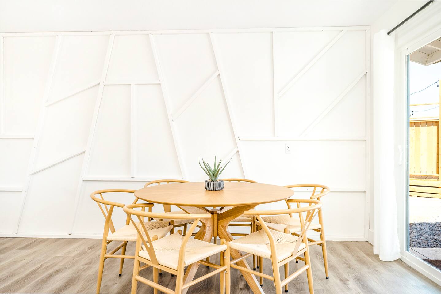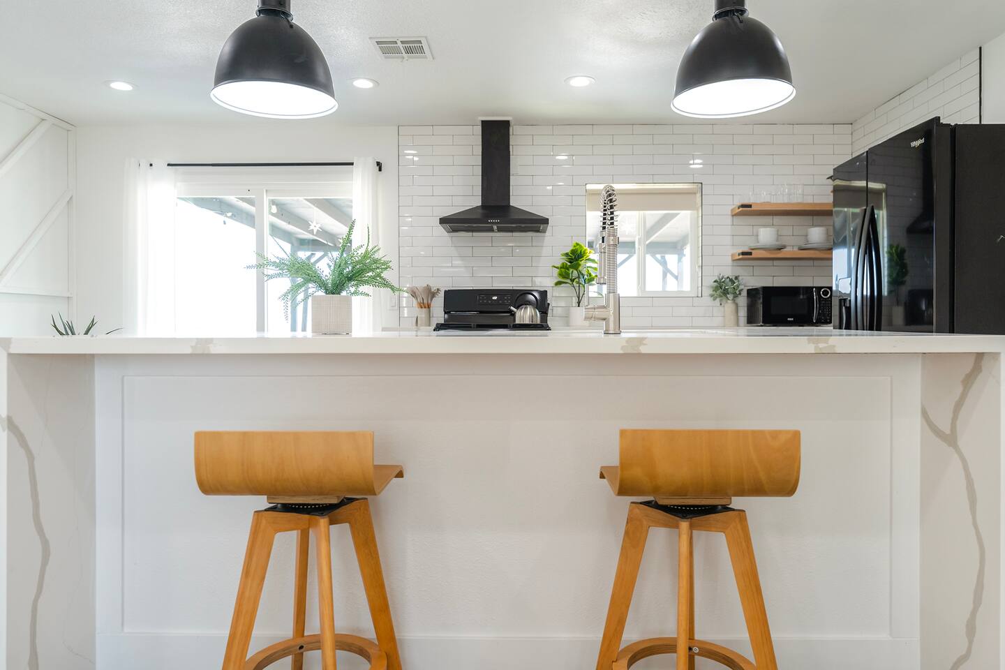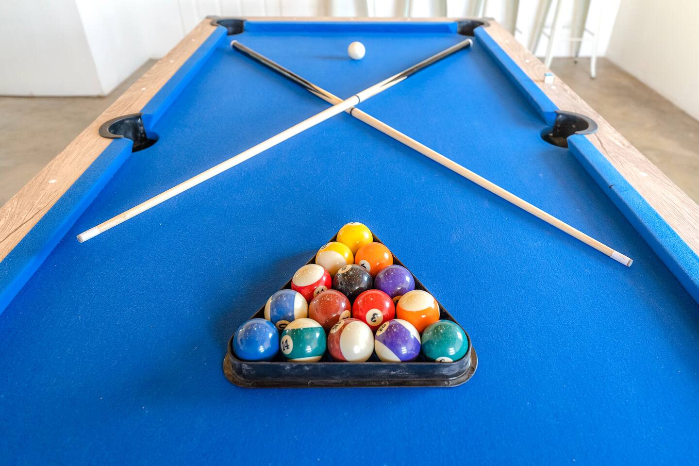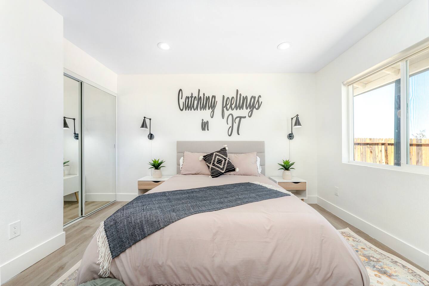 KEY FEATURES: ☀ 3 large bedrooms; The master bedroom has a queen size bed and the two guest bedrooms have Full size mattresses ☀ 2 full bathrooms; one is an ensuite bathroom connected to the master and the second bathroom is a shared bathroom ☀ Open floor kitchen, dining + lounge area ☀ Fully-equipped kitchen ☀ Stocked coffee bar with assorted K-cups, whole bean coffee and coffee grounds ☀ Salt, pepper, and cooking spray are provided ☀ Large smart TV ☀ Private backyard w/ a stock tank pool, hot tub, fire pit + pergola w/ hanging hammock chairs ☀ Air conditioning + central heating ☀ Free high speed WiFi ☀ External security cameras covering the front door ☀ Free parking on-site ☀ Onsite laundry in the garage ☀ Single-level home w/ stairless access ☀ Located in a quiet community ☀Game room in the garage with pool table, dart board, and TV ☆☆ BEDROOMS ☆☆ This perfect desert home provides you with three beautiful bedrooms to rest your head for the night. The master bedroom features a Queen size Zinus mattress with ensuite bathroom. The two guest rooms are stylishly furnished with full-sized beds and topped with extra-comfortable Zuris memory foam mattresses. Our guests rave about our luxurious mattresses! All of the spacious bedrooms are light, airy spaces and offer plenty of storage space for your clothing and personal belongings. The thoughtful touches and beautiful decor make them the perfect spot to kick back and relax after a long day seeing the sights of the beautiful Joshua Tree. ☆☆ BATHROOMS ☆☆ Make use of the 2 full bathrooms, complete with a shower, stylish vanity, and plush bath linen. These bright spaces are the perfect place for unwinding after an energetic hike through Joshua Tree National Park. ☆☆ KITCHEN & LOUNGE ☆☆ Our open-plan kitchen, dining area, and lounge are full of natural light, making it a relaxing space to gather in as a family or small group. We provide everything you need to make delicious meals, from new stainless steel appliances to a dedicated coffee station. We know how important a good cup of Joe is, so our coffee station features an automatic coffee machine as well as a drip coffee kettle. Enjoy coffee your way! Two bar stools are arranged around the kitchen island, making it a lovely spot for breakfast or just to chat with the chef. For formal and fun dinners, make use of the dining table that has seating for 6, or enjoy dinner around the outdoor patio set and enjoy the setting desert dun The whole space is completed with the spacious living room decorated in desert-chic style. Here you’ll be able to enjoy evenings in front of the smart TV, curling up with a good book, or chatting with friends and family. ☆☆ OUTSIDE SPACE ☆☆ Our favorite feature of our peaceful desert oasis house is the fully-fenced backyard. We’ve lovingly created a private, relaxing space for you to enjoy. Why not take advantage of our stock tank pool to chill out and get some refreshments from the hot weather? If hot tubs are more your thing, we’ve got you covered there, too. Next to the stock tank pool, you’ll find a heated jacuzzi, which will help you soak away any tiredness you might have from your adventures of the day. For the ultimate desert experience, turn on the pretty string lights, light up the fire pit and make some s’mores as the evening draws in. Stargazing is a must when you’re in the desert, and you can do so at the pergola, where you’ll be able to sway under the stars in a cozy hammock. ★☆ Book Today & Let Us Take Care Of You In Joshua Tree! ☆★
