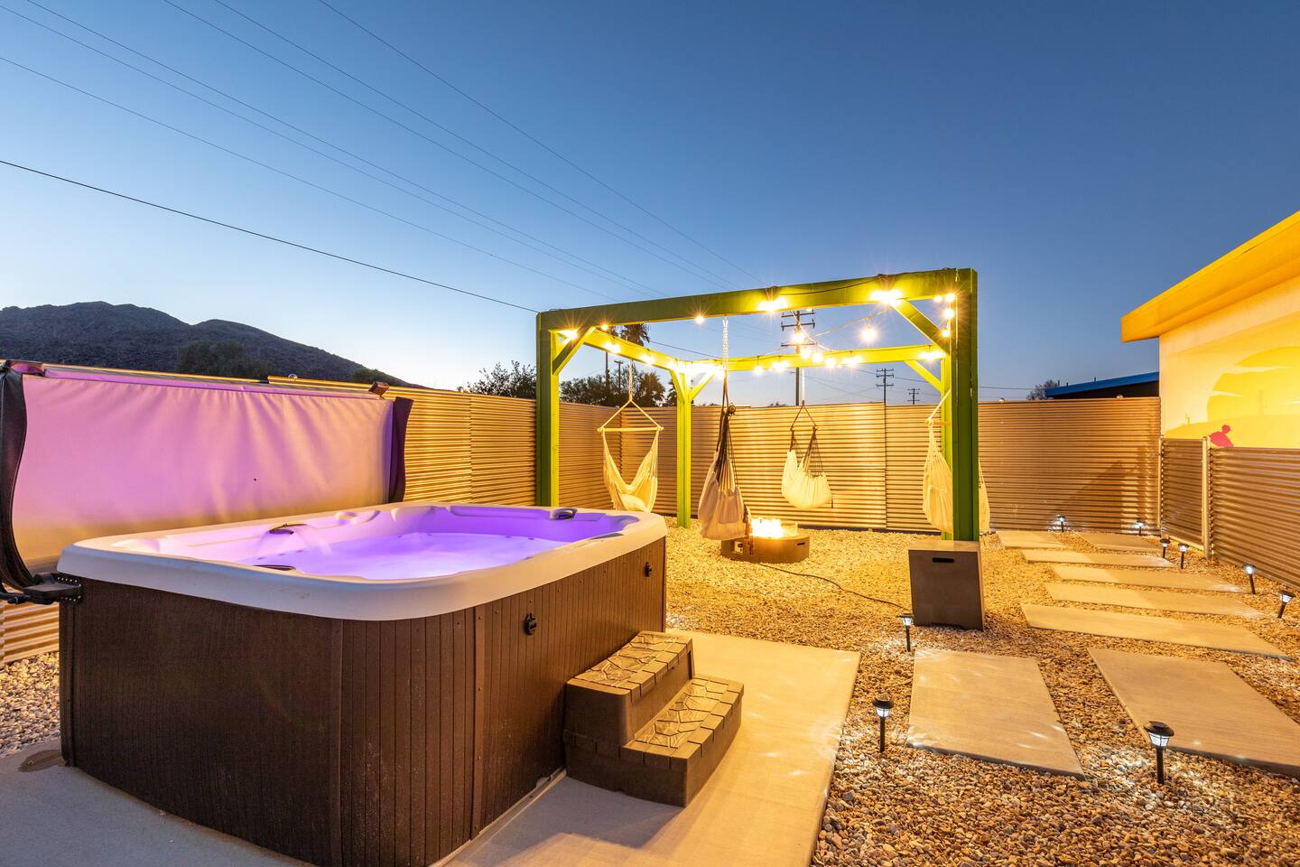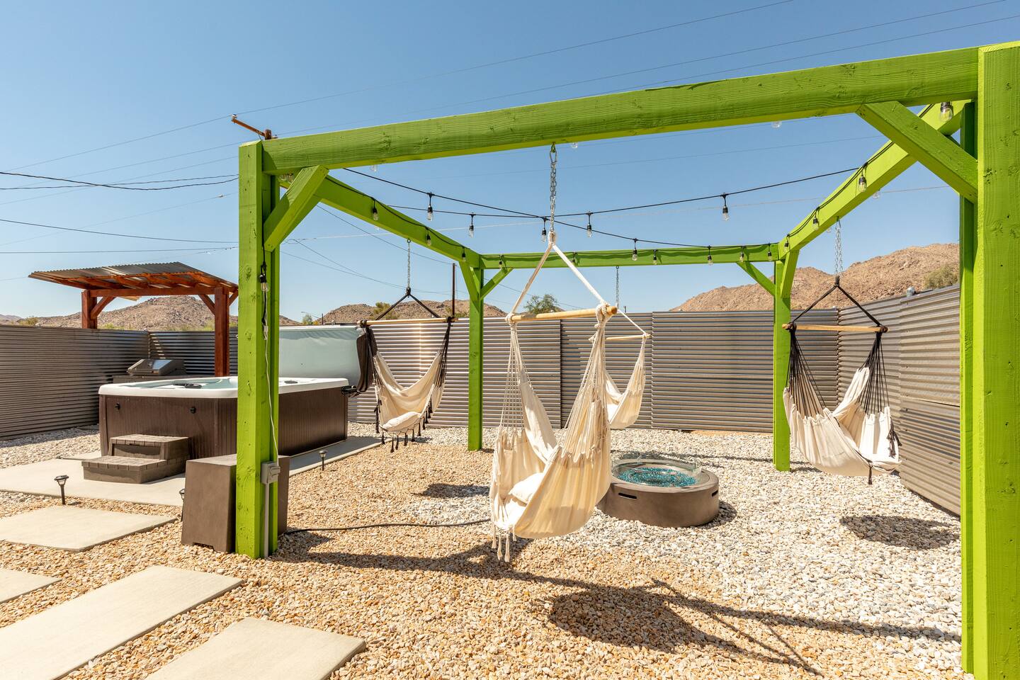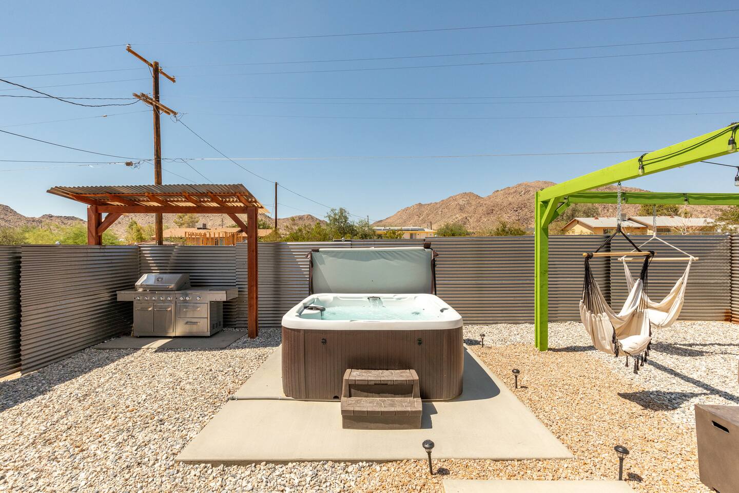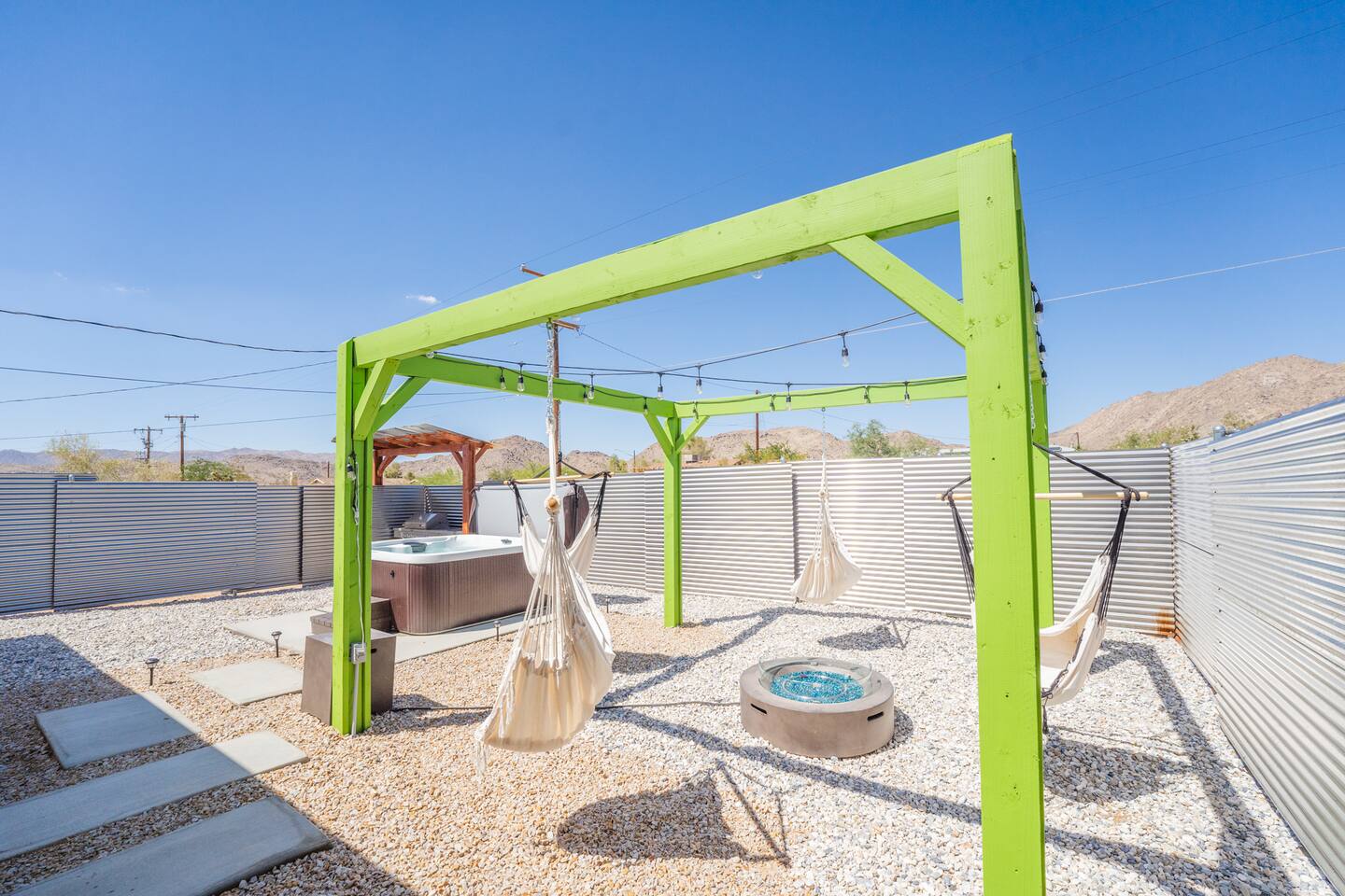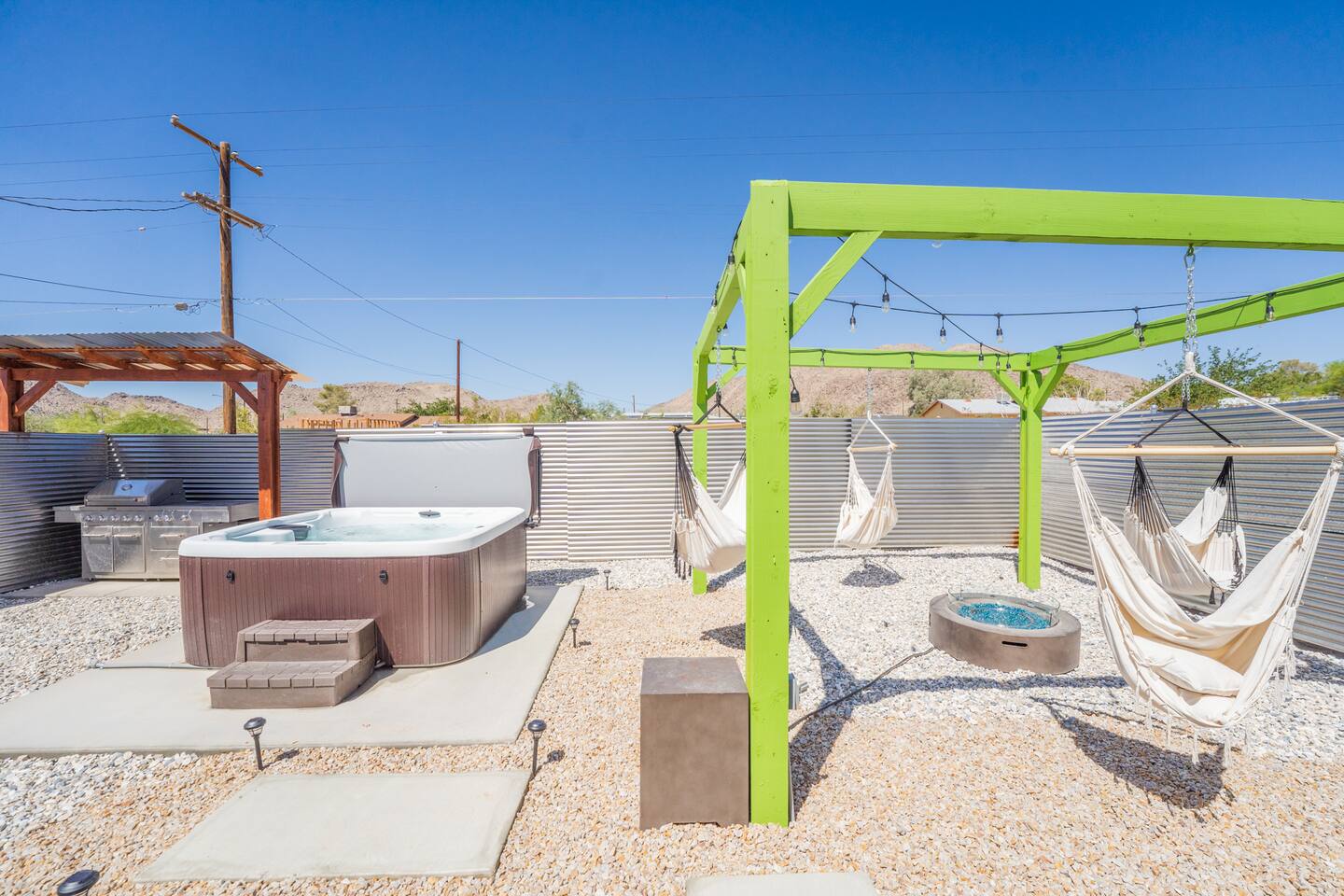 A peaceful desert oasis designed for pure relaxation. This thoughtfully styled tiny home is the perfect escape for couples or small groups, featuring a fully fenced yard, private hot tub, grill, fire pit, and a dreamy pergola with hammocks—ideal for stargazing! Whether you're unwinding or exploring, this retreat offers comfort, charm, and a touch of magic. 15 Min to the West Entrance to Joshua Tree National Park 5 Min to downtown JT 12 Min to Walmart Relax, Enjoy and Explore Joshua Tree!