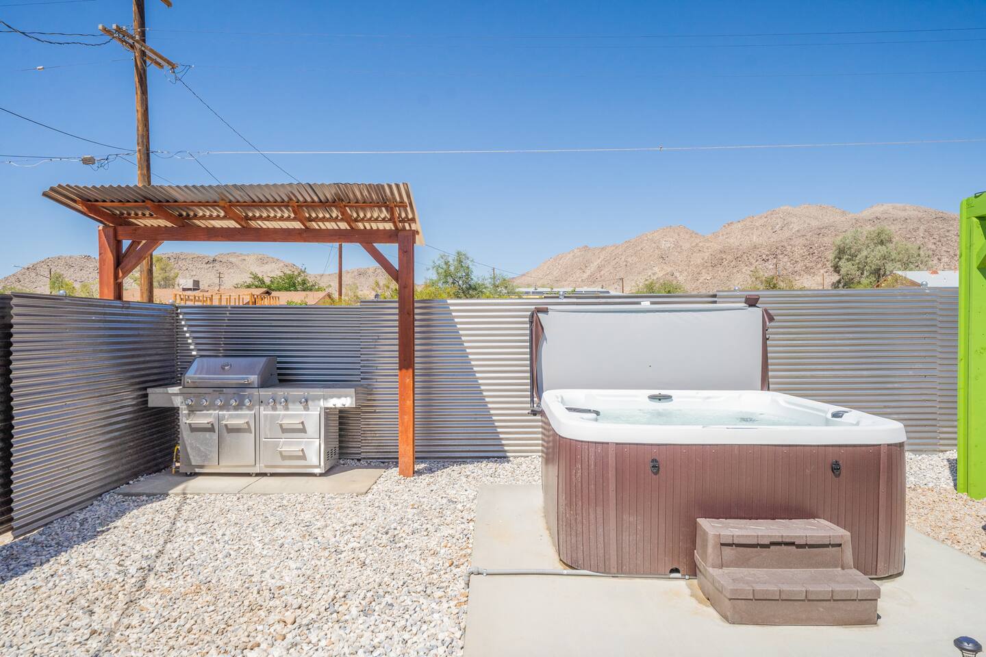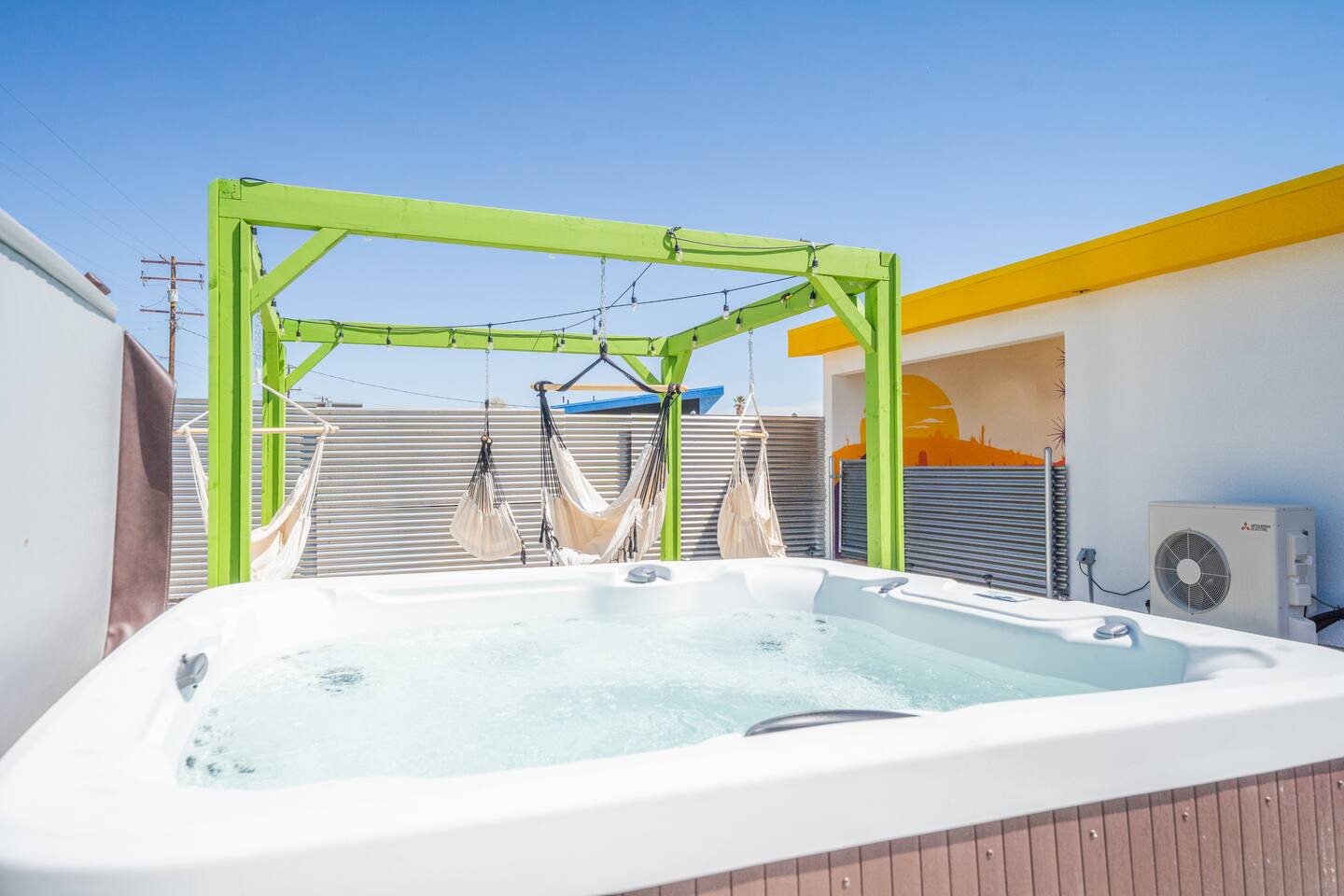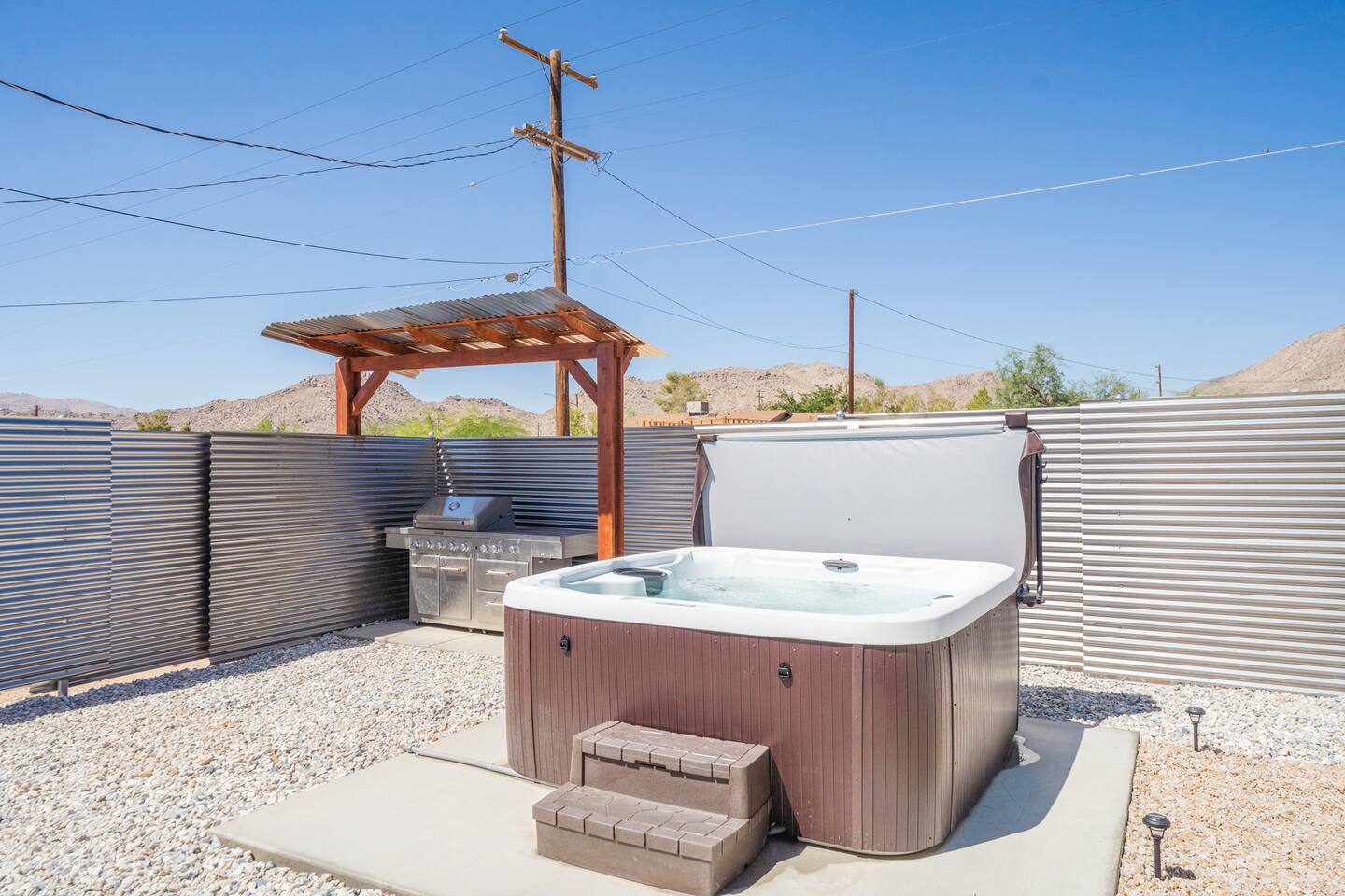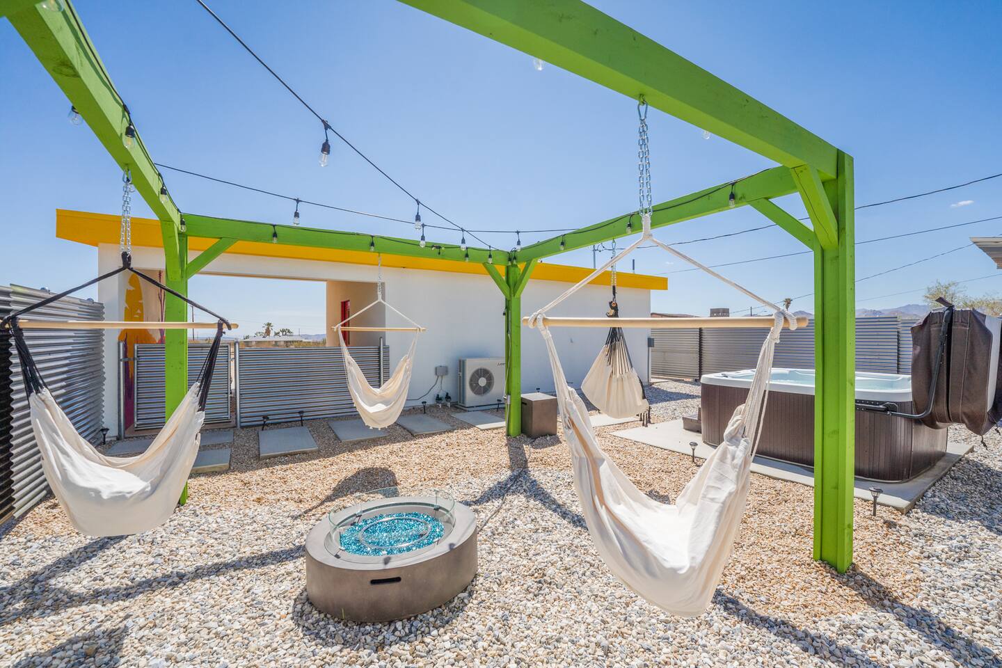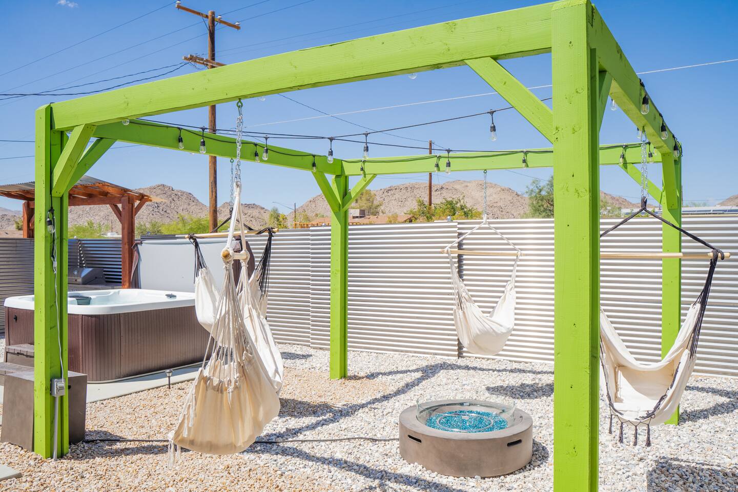 A peaceful desert oasis designed for pure relaxation. This thoughtfully styled tiny home is the perfect escape for couples or small groups, featuring a fully fenced yard, private hot tub, grill, fire pit, and a dreamy pergola with hammocks—ideal for stargazing! Whether you're unwinding or exploring, this retreat offers comfort, charm, and a touch of magic. 15 Min to the West Entrance to Joshua Tree National Park 5 Min to downtown JT 12 Min to Walmart Relax, Enjoy and Explore Joshua Tree!