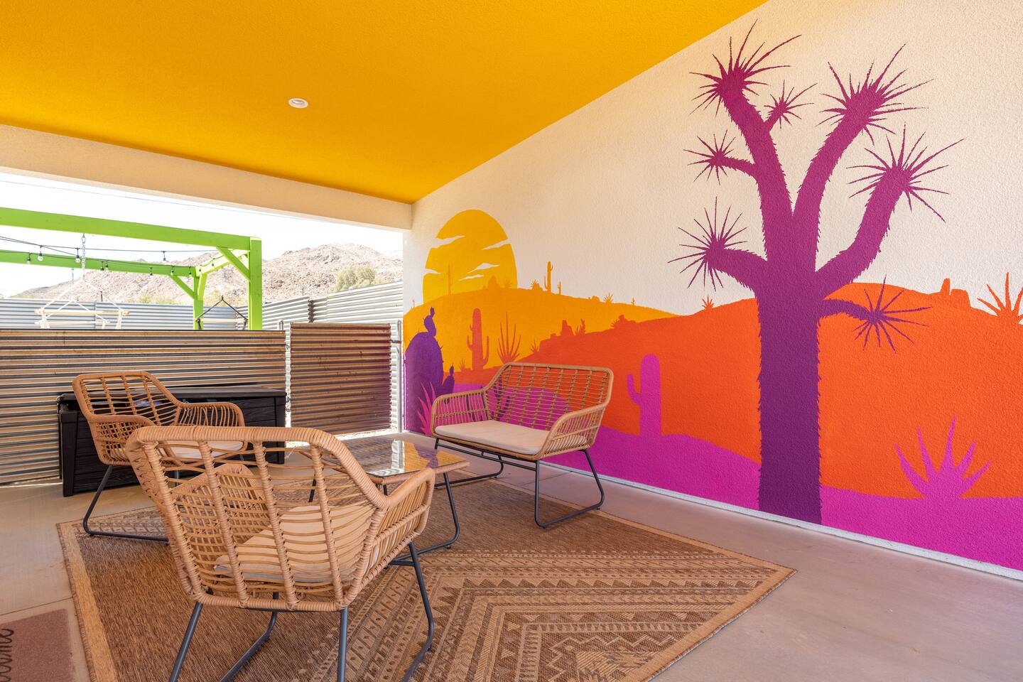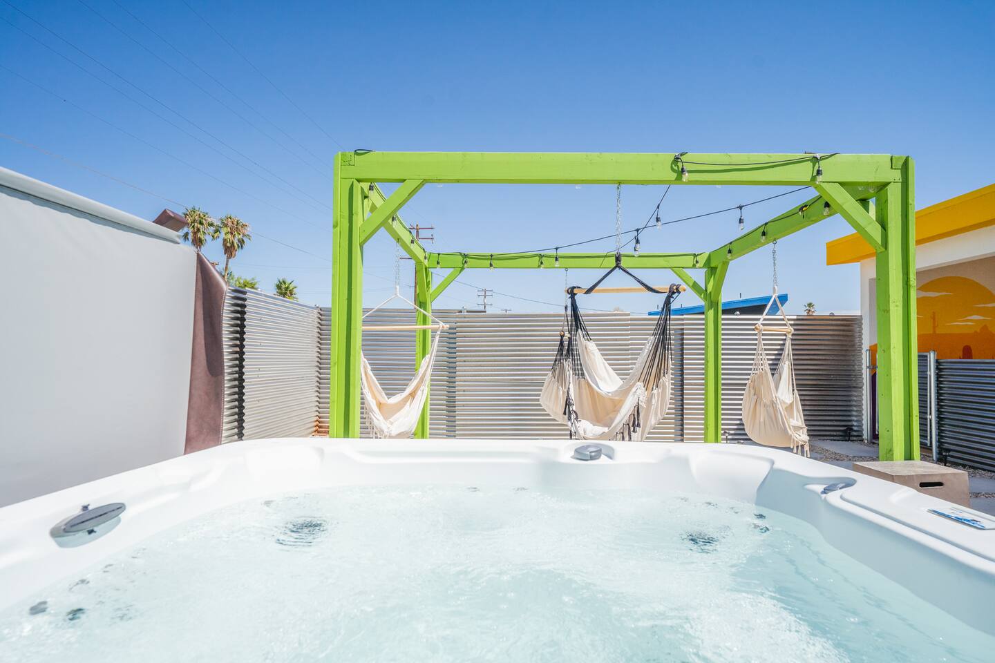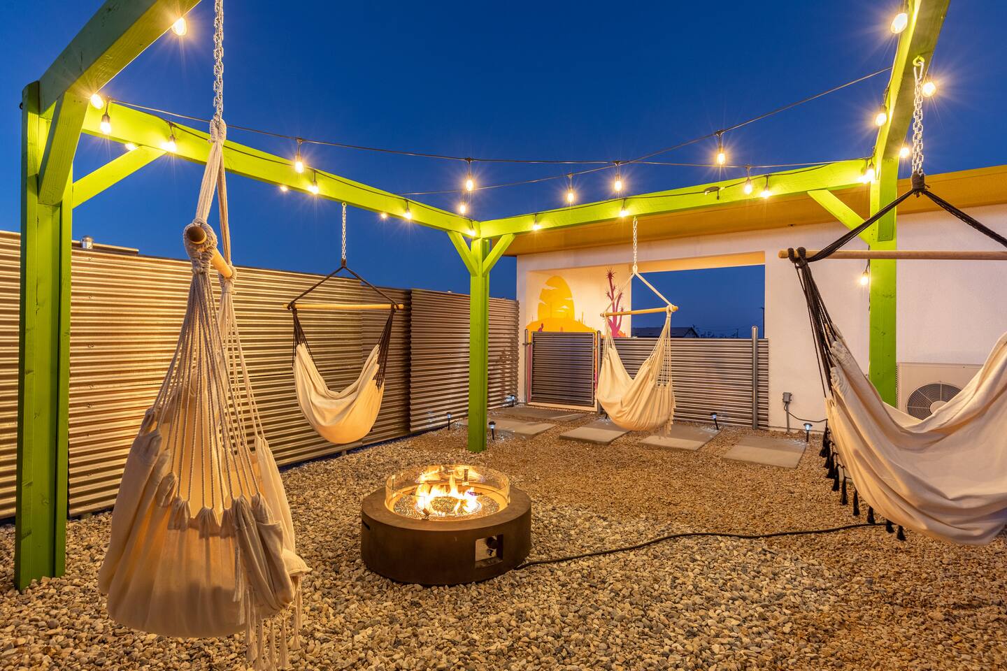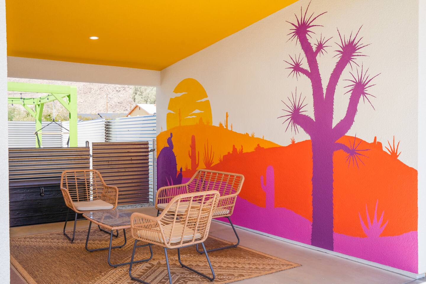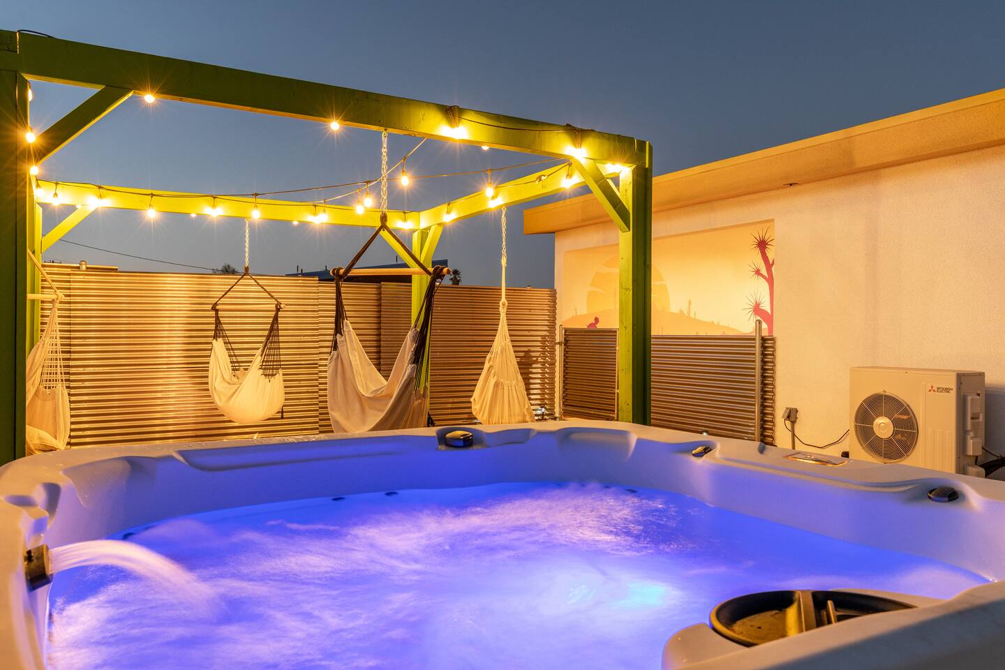 A peaceful desert oasis designed for pure relaxation. This thoughtfully styled tiny home is the perfect escape for couples or small groups, featuring a fully fenced yard, private hot tub, grill, fire pit, and a dreamy pergola with hammocks—ideal for stargazing! Whether you're unwinding or exploring, this retreat offers comfort, charm, and a touch of magic. 15 Min to the West Entrance to Joshua Tree National Park 5 Min to downtown JT 12 Min to Walmart Relax, Enjoy and Explore Joshua Tree!