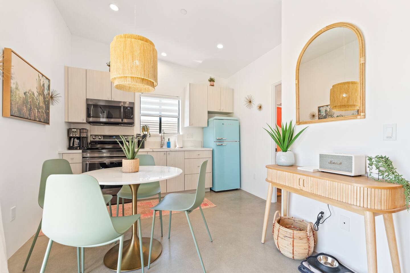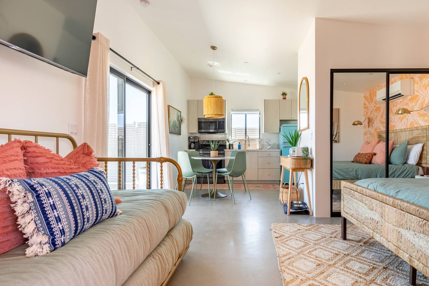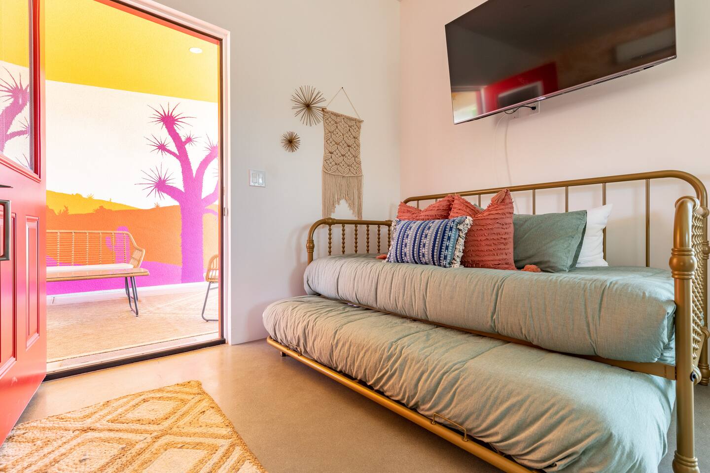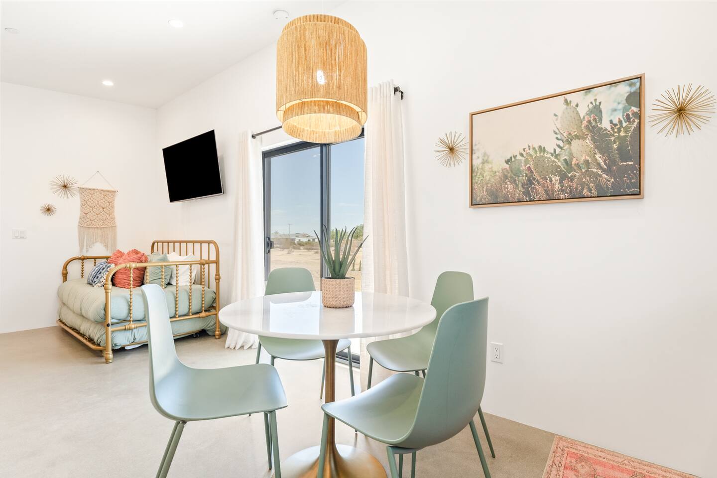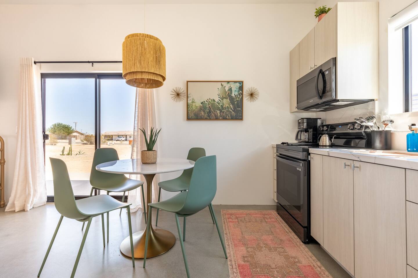 KEY FEATURES ☀ Spacious 391 square foot studio with 1 Queen sized bed and 2 Twin size trundle beds ☀ 1 full bathroom. ☀ Full kitchen, with all the tools needed to make a delicious meal! (there is no dishwasher available) ☀ Stocked coffee bar with assorted K-cups, whole bean coffee and coffee grounds ☀ Salt, pepper, and cooking spray are provided ☀ 55” flat screen TV with access to all streaming platforms (logins not provided) ☀ Free WiFi ☀ Washer + dryer ☀ Easy access; no steps to entry ☀ Fully fenced in backyard with hot tub, propane firepit, grill, and pergola with handing hammock chairs ☀ Convenient location; short drive to National Park, restaurants and activities ☀ Beautiful Views of Joshua Tree Mountain Range ☆☆ BEDROOM & LIVING AREA ☆☆ Ultimate comfort and relaxation awaits you on our Queen size bed with Zinus memory foam mattress. There are also two Twin size trundle beds perfect for additional guests or kids. (FYI, there is no wall/room that separates these beds from one another. You will all be sleeping in the same “room”) You can have a cozy movie night relaxing in bed and watch your favorite shows on the 55” TV. Netflix, Hulu and Disney+ are available for your use, but you will need to provide your own login ☆☆ BATHROOMS ☆☆ There is one full size bathroom complete with plush bath linen, towels for the spa, hairdryer and first aid kit ☆☆ KITCHEN & DINING ROOM ☆☆ The fully equipped kitchen has everything you’ll need for whipping up tasty meals for the whole group, including stainless steel appliances, a toaster, a blender, a coffee machine, a Keurig, and all the basic kitchen essentials like pots, pans, plates, cups, and utensils. Enjoy meals together at the kitchen table with seating for 4. There is a stocked coffee bar with assorted K-cups, whole bean coffee and coffee grounds. Salt, pepper, and cooking spray are also included! ☆☆ OUTSIDE SPACE ☆☆ Step outside and into your private desert oasis. The entire backyard is fenced in, not only for your privacy, but also so your furry friends can safely explore! The best part about coming to Joshua Tree is being able to enjoy the outdoors and we think the backyard will do just that. The backyard features a hot tub, great for soaking in after long days hiking in the national park, as well as a fire pit surrounded by a pergola with hanging hammock chairs which is perfect for enjoying the starry night skies. ★☆ Book Today & Let Us Take Care Of You In Joshua Tree! ☆★