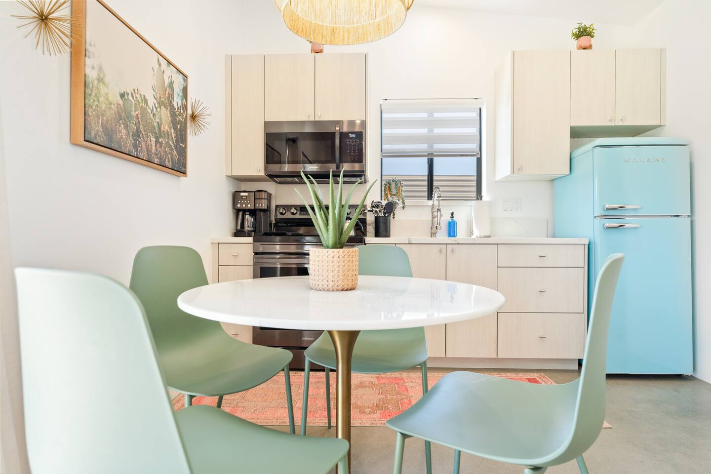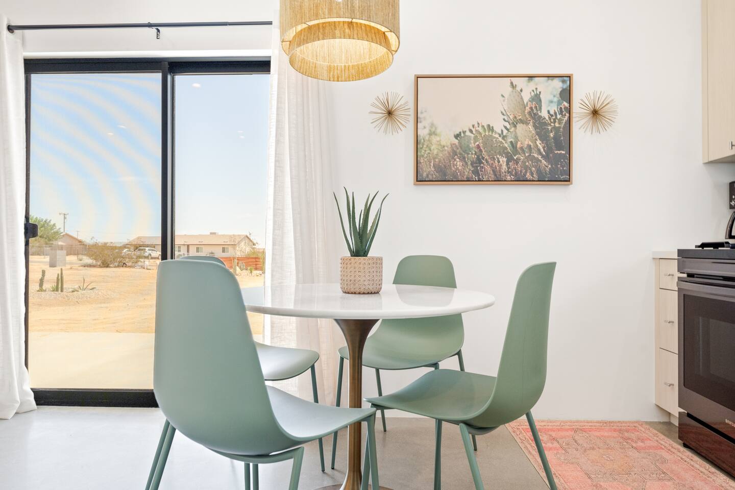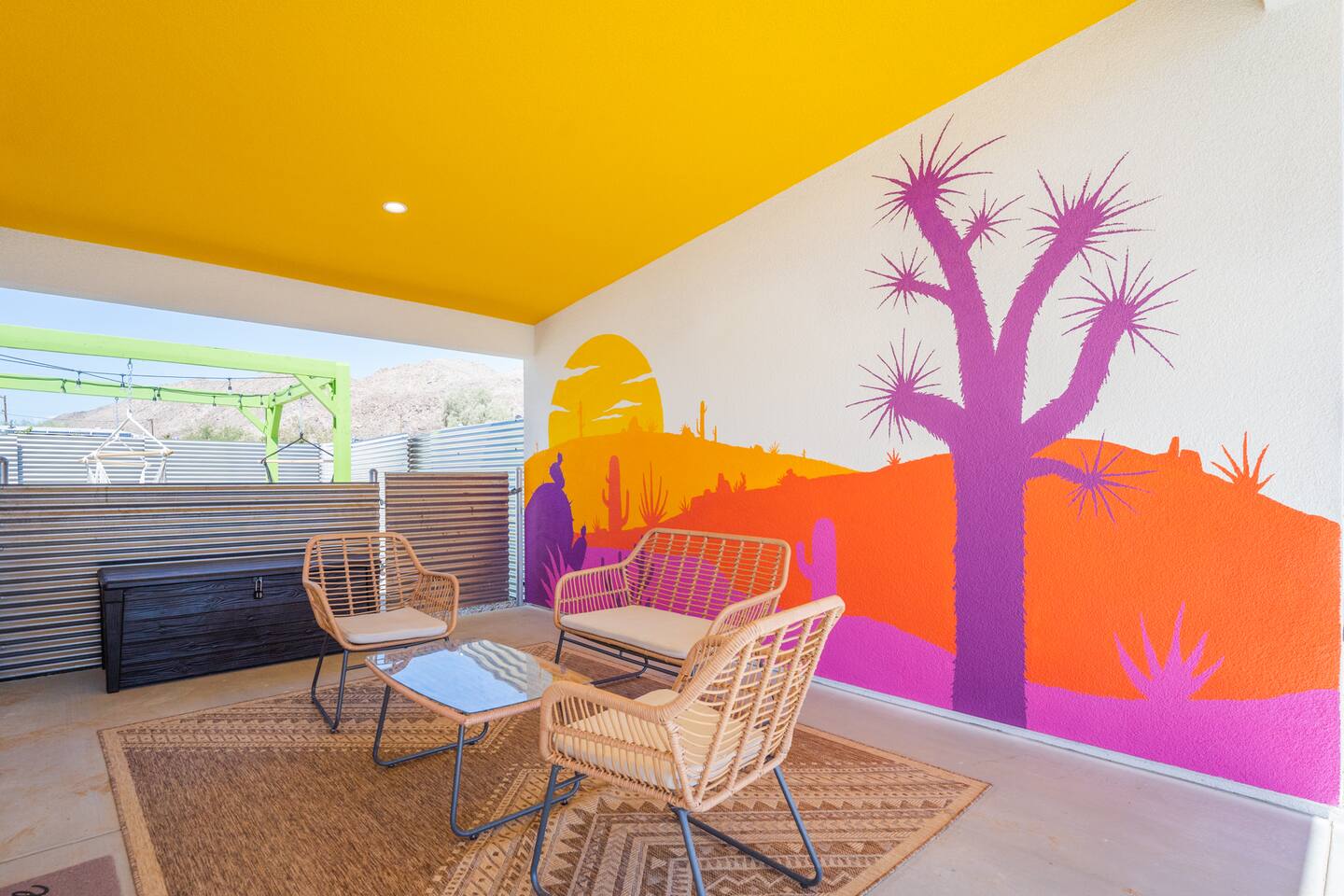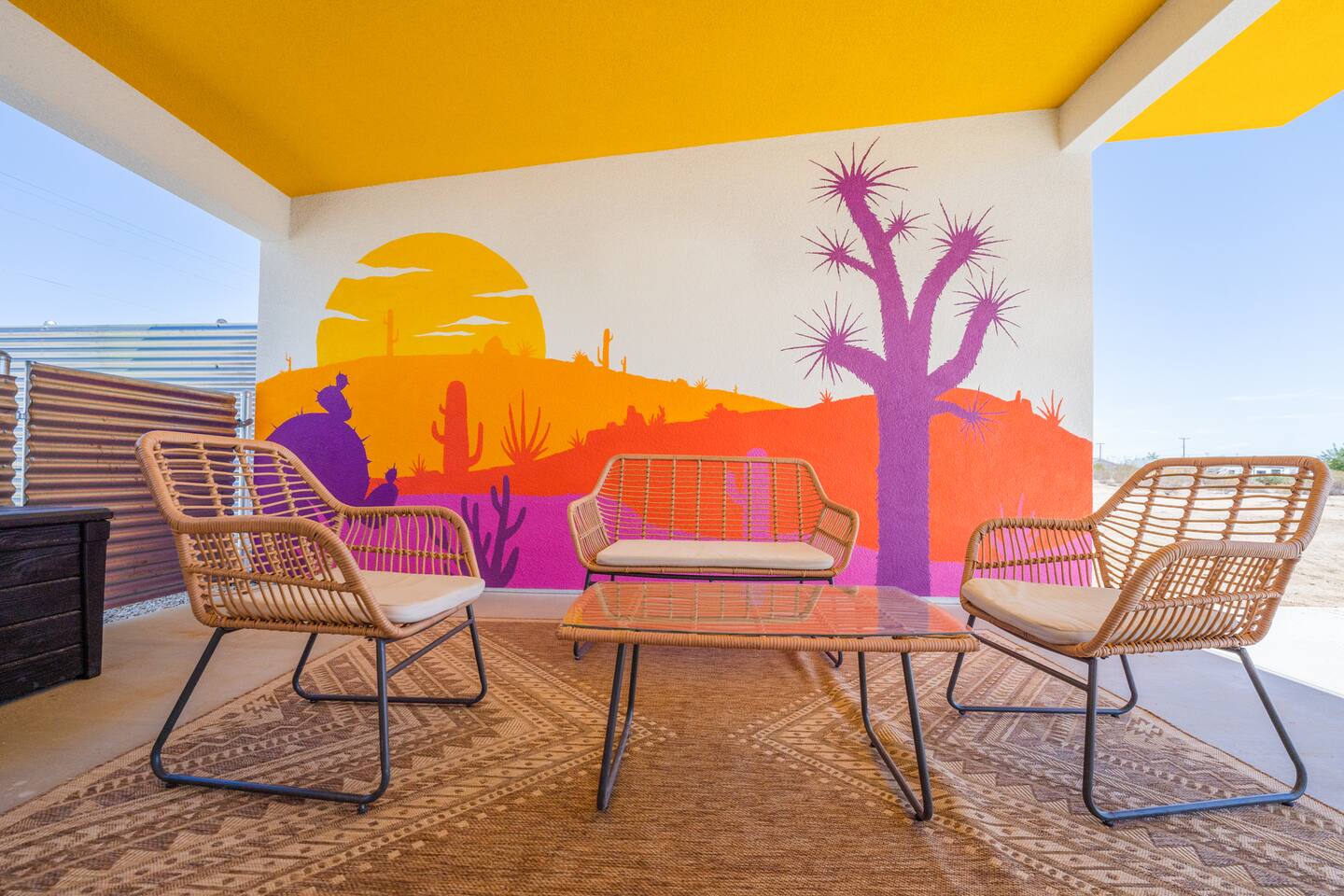 KEY FEATURES ☀ Spacious 391 square foot studio with 1 Queen sized bed and 2 Twin size trundle beds ☀ 1 full bathroom. ☀ Full kitchen, with all the tools needed to make a delicious meal! (there is no dishwasher available) ☀ Stocked coffee bar with assorted K-cups, whole bean coffee and coffee grounds ☀ Salt, pepper, and cooking spray are provided ☀ 55” flat screen TV with access to all streaming platforms (logins not provided) ☀ Free WiFi ☀ Washer + dryer ☀ Easy access; no steps to entry ☀ Fully fenced in backyard with hot tub, propane firepit, grill, and pergola with handing hammock chairs ☀ Convenient location; short drive to National Park, restaurants and activities ☀ Beautiful Views of Joshua Tree Mountain Range ☆☆ BEDROOM & LIVING AREA ☆☆ Ultimate comfort and relaxation awaits you on our Queen size bed with Zinus memory foam mattress. There are also two Twin size trundle beds perfect for additional guests or kids. (FYI, there is no wall/room that separates these beds from one another. You will all be sleeping in the same “room”) You can have a cozy movie night relaxing in bed and watch your favorite shows on the 55” TV. Netflix, Hulu and Disney+ are available for your use, but you will need to provide your own login ☆☆ BATHROOMS ☆☆ There is one full size bathroom complete with plush bath linen, towels for the spa, hairdryer and first aid kit ☆☆ KITCHEN & DINING ROOM ☆☆ The fully equipped kitchen has everything you’ll need for whipping up tasty meals for the whole group, including stainless steel appliances, a toaster, a blender, a coffee machine, a Keurig, and all the basic kitchen essentials like pots, pans, plates, cups, and utensils. Enjoy meals together at the kitchen table with seating for 4. There is a stocked coffee bar with assorted K-cups, whole bean coffee and coffee grounds. Salt, pepper, and cooking spray are also included! ☆☆ OUTSIDE SPACE ☆☆ Step outside and into your private desert oasis. The entire backyard is fenced in, not only for your privacy, but also so your furry friends can safely explore! The best part about coming to Joshua Tree is being able to enjoy the outdoors and we think the backyard will do just that. The backyard features a hot tub, great for soaking in after long days hiking in the national park, as well as a fire pit surrounded by a pergola with hanging hammock chairs which is perfect for enjoying the starry night skies. ★☆ Book Today & Let Us Take Care Of You In Joshua Tree! ☆★