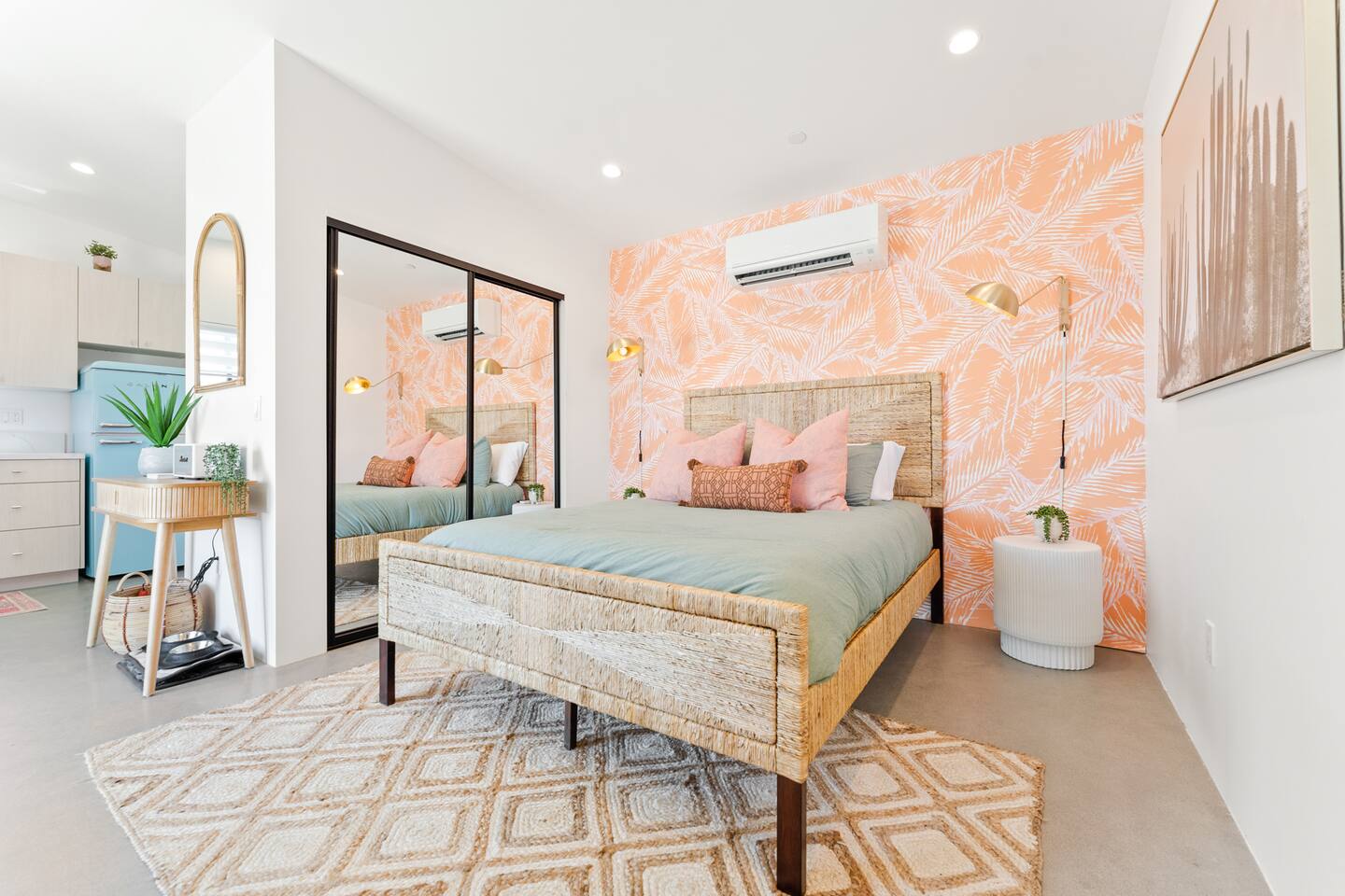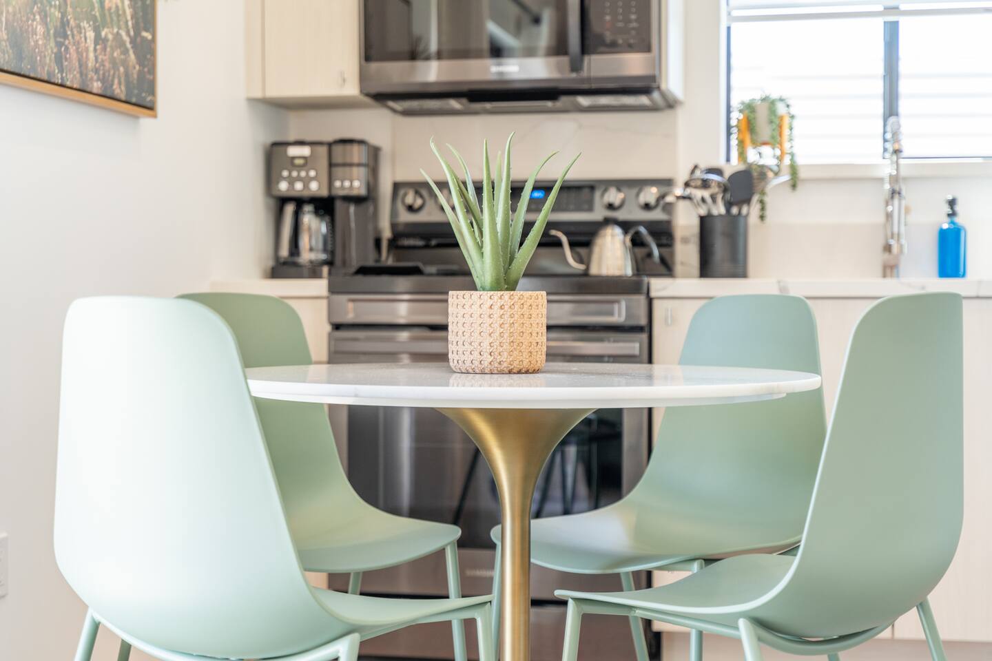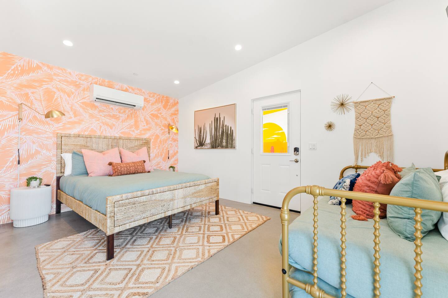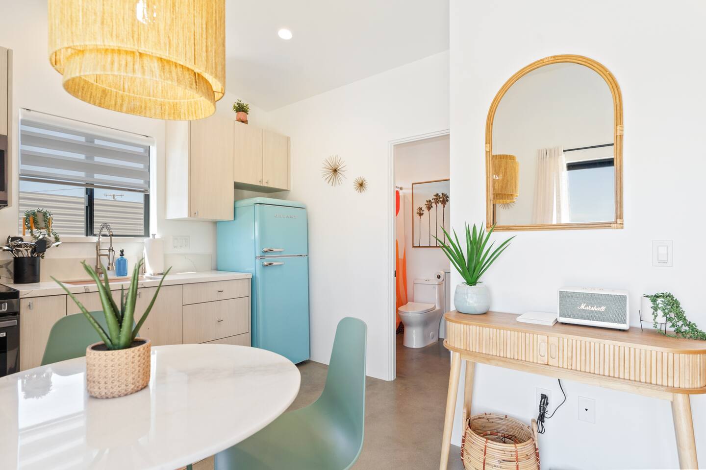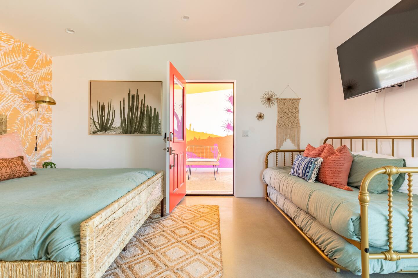 KEY FEATURES ☀ Spacious 391 square foot studio with 1 Queen sized bed and 2 Twin size trundle beds ☀ 1 full bathroom. ☀ Full kitchen, with all the tools needed to make a delicious meal! (there is no dishwasher available) ☀ Stocked coffee bar with assorted K-cups, whole bean coffee and coffee grounds ☀ Salt, pepper, and cooking spray are provided ☀ 55” flat screen TV with access to all streaming platforms (logins not provided) ☀ Free WiFi ☀ Washer + dryer ☀ Easy access; no steps to entry ☀ Fully fenced in backyard with hot tub, propane firepit, grill, and pergola with handing hammock chairs ☀ Convenient location; short drive to National Park, restaurants and activities ☀ Beautiful Views of Joshua Tree Mountain Range ☆☆ BEDROOM & LIVING AREA ☆☆ Ultimate comfort and relaxation awaits you on our Queen size bed with Zinus memory foam mattress. There are also two Twin size trundle beds perfect for additional guests or kids. (FYI, there is no wall/room that separates these beds from one another. You will all be sleeping in the same “room”) You can have a cozy movie night relaxing in bed and watch your favorite shows on the 55” TV. Netflix, Hulu and Disney+ are available for your use, but you will need to provide your own login ☆☆ BATHROOMS ☆☆ There is one full size bathroom complete with plush bath linen, towels for the spa, hairdryer and first aid kit ☆☆ KITCHEN & DINING ROOM ☆☆ The fully equipped kitchen has everything you’ll need for whipping up tasty meals for the whole group, including stainless steel appliances, a toaster, a blender, a coffee machine, a Keurig, and all the basic kitchen essentials like pots, pans, plates, cups, and utensils. Enjoy meals together at the kitchen table with seating for 4. There is a stocked coffee bar with assorted K-cups, whole bean coffee and coffee grounds. Salt, pepper, and cooking spray are also included! ☆☆ OUTSIDE SPACE ☆☆ Step outside and into your private desert oasis. The entire backyard is fenced in, not only for your privacy, but also so your furry friends can safely explore! The best part about coming to Joshua Tree is being able to enjoy the outdoors and we think the backyard will do just that. The backyard features a hot tub, great for soaking in after long days hiking in the national park, as well as a fire pit surrounded by a pergola with hanging hammock chairs which is perfect for enjoying the starry night skies. ★☆ Book Today & Let Us Take Care Of You In Joshua Tree! ☆★
