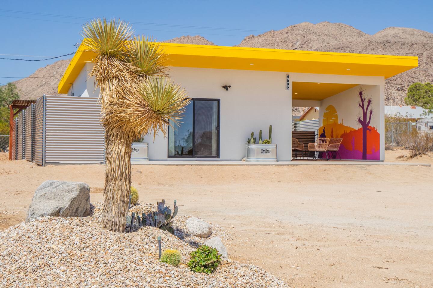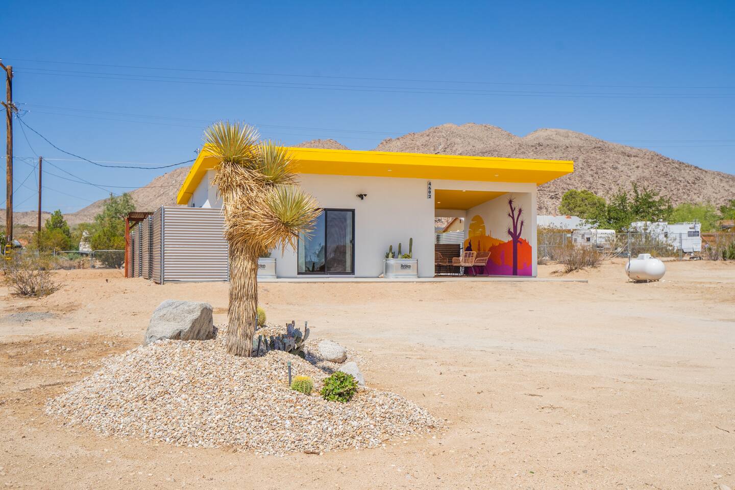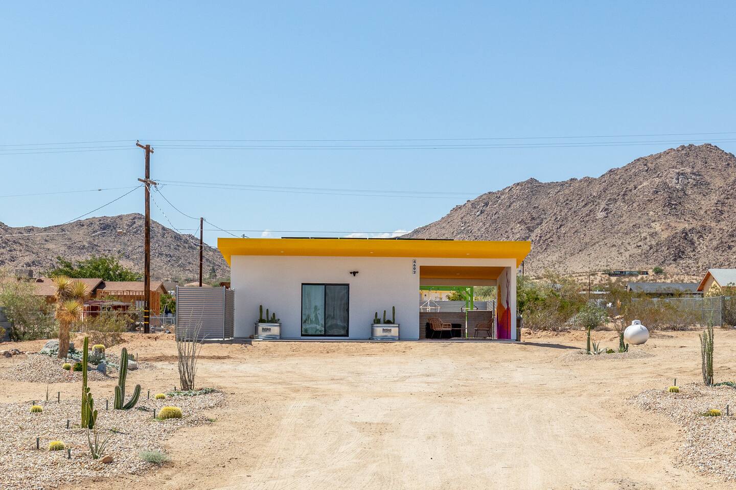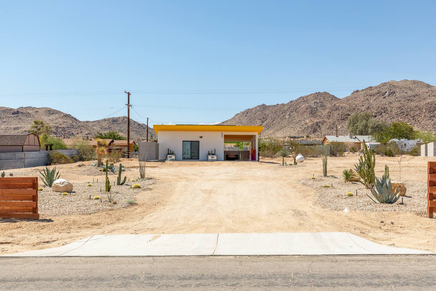 Pros - Short drive to downtown Joshua Tree - 100% paved roads to get to the property - 6 minute drive to Dollar General - 6 minute drive to the Joshua Tree Saloon - 13 minute drive to Walmart Supercenter - Beautiful views of the surrounding mountain ranges - Large lot to enjoy and beautiful landscaping Cons - Still in a residential area, so guests must keep noise down after hours