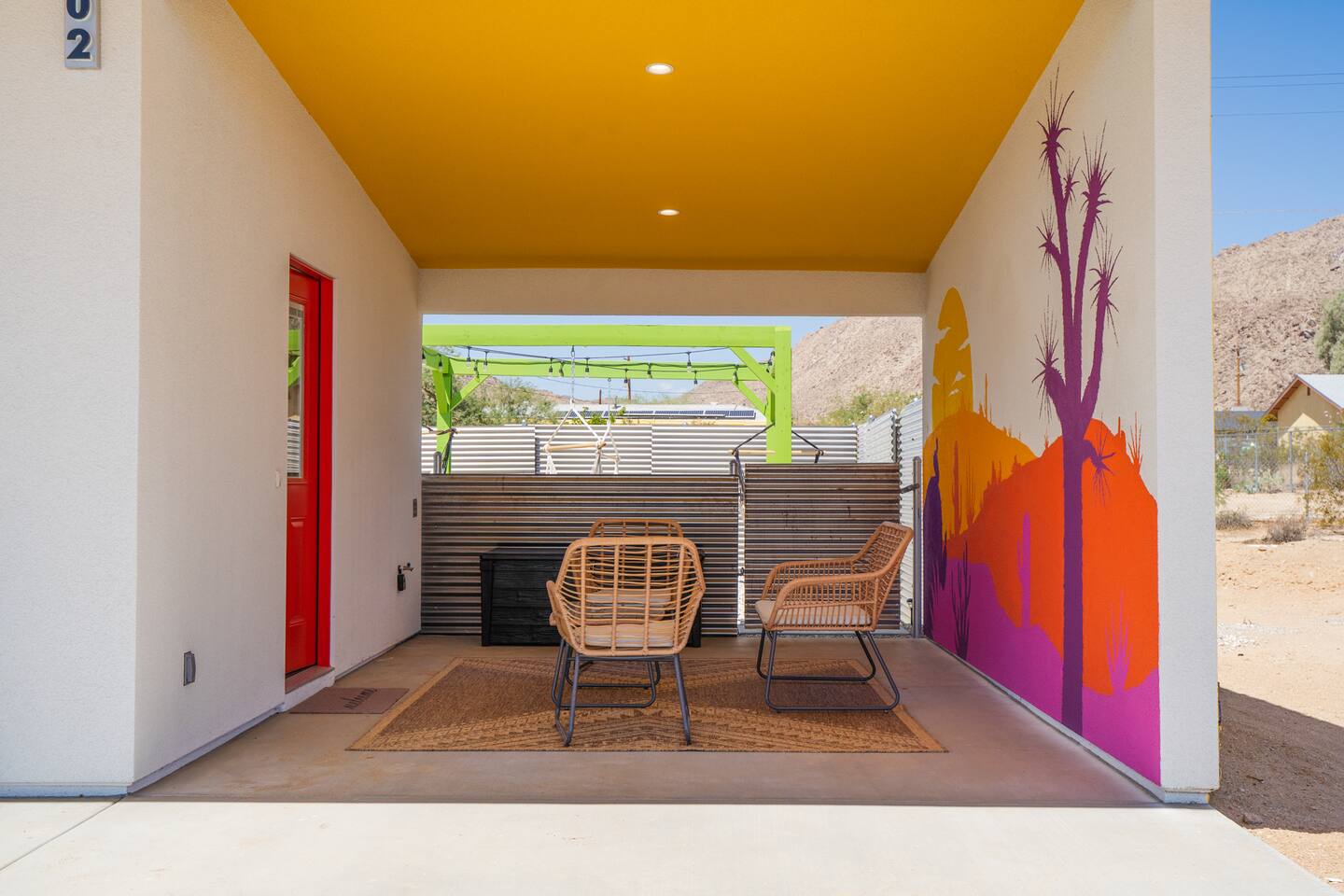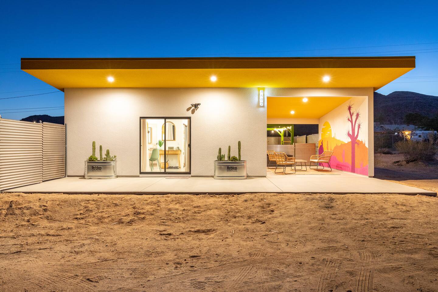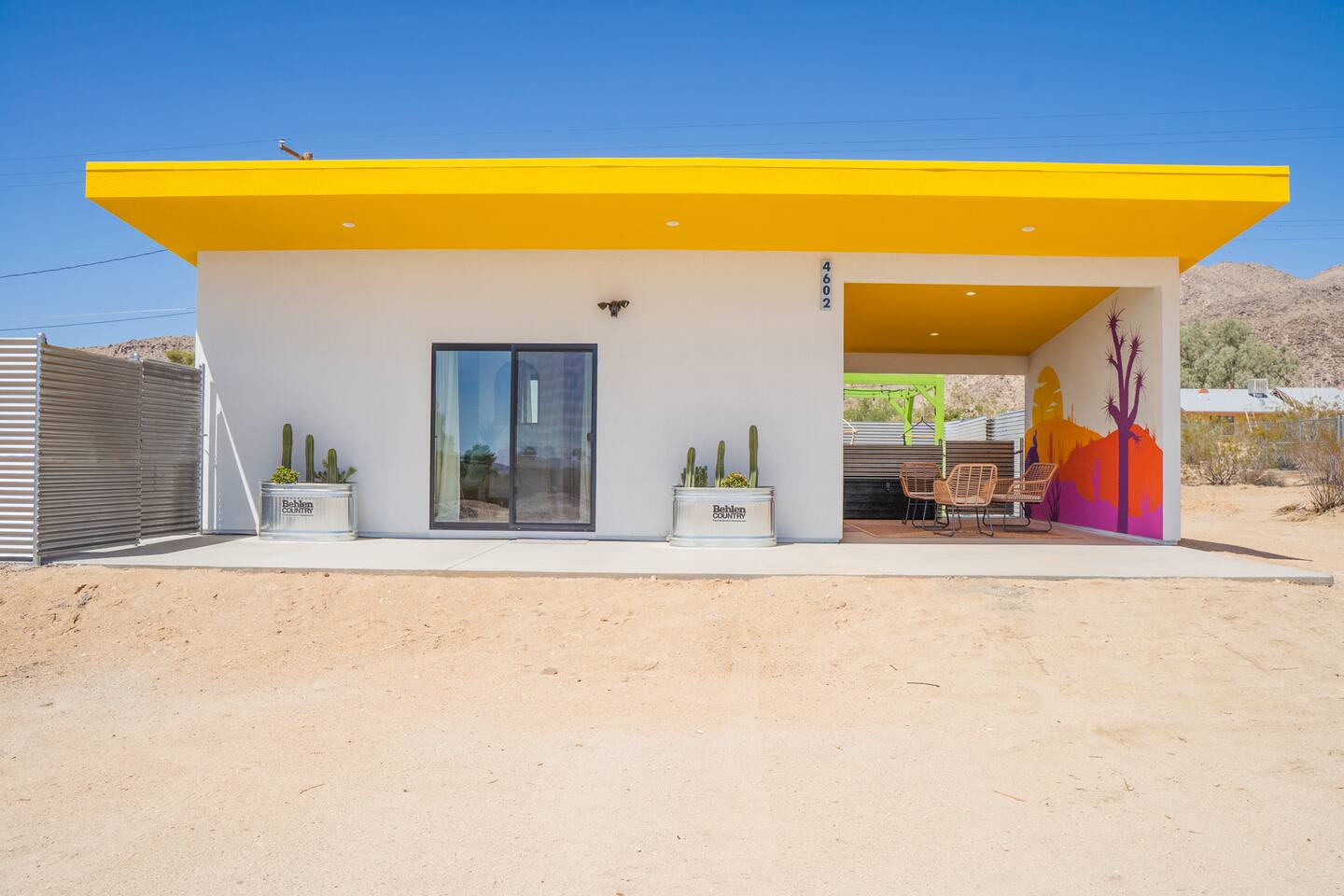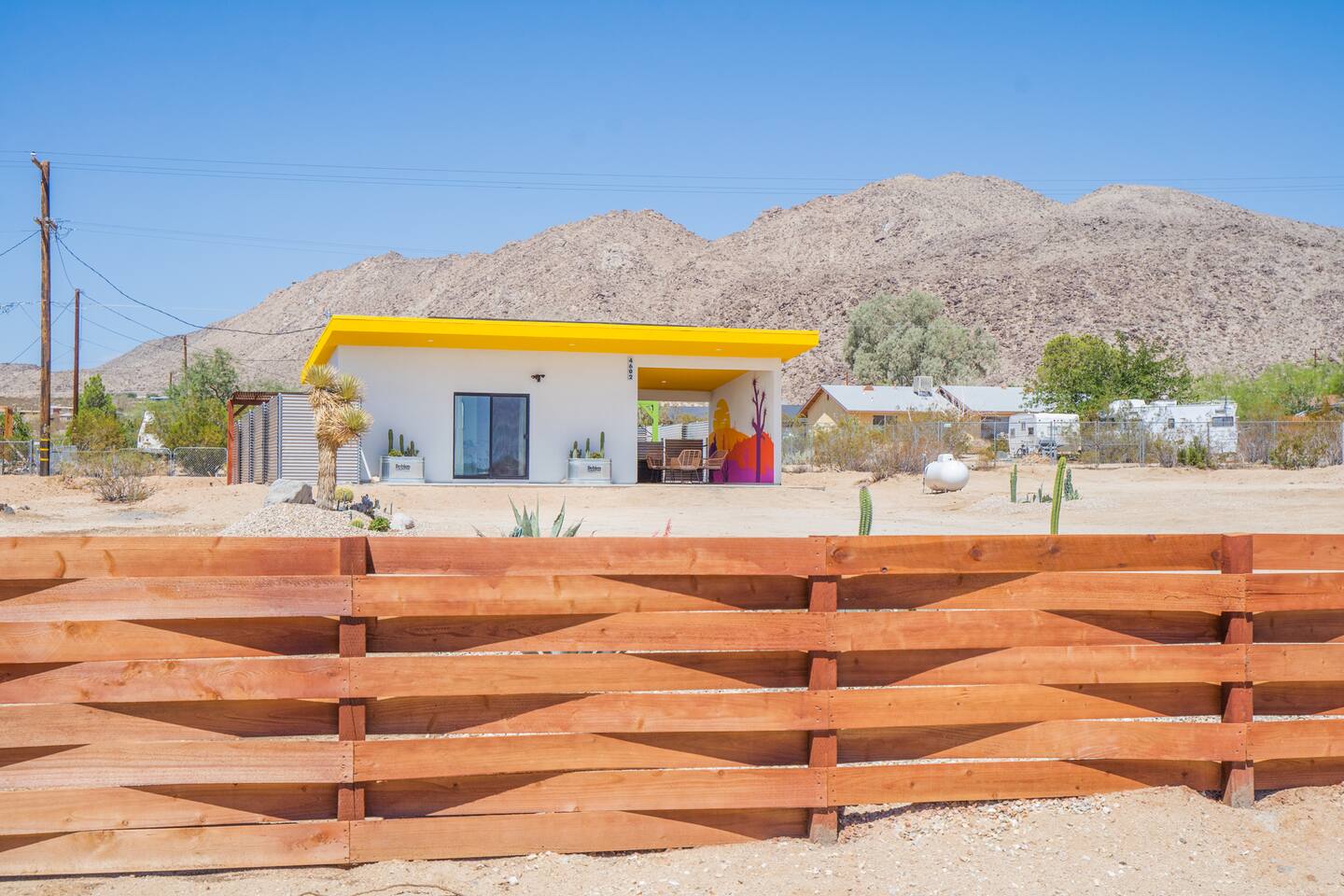 Pros - Short drive to downtown Joshua Tree - 100% paved roads to get to the property - 6 minute drive to Dollar General - 6 minute drive to the Joshua Tree Saloon - 13 minute drive to Walmart Supercenter - Beautiful views of the surrounding mountain ranges - Large lot to enjoy and beautiful landscaping Cons - Still in a residential area, so guests must keep noise down after hours