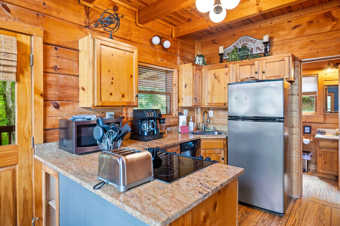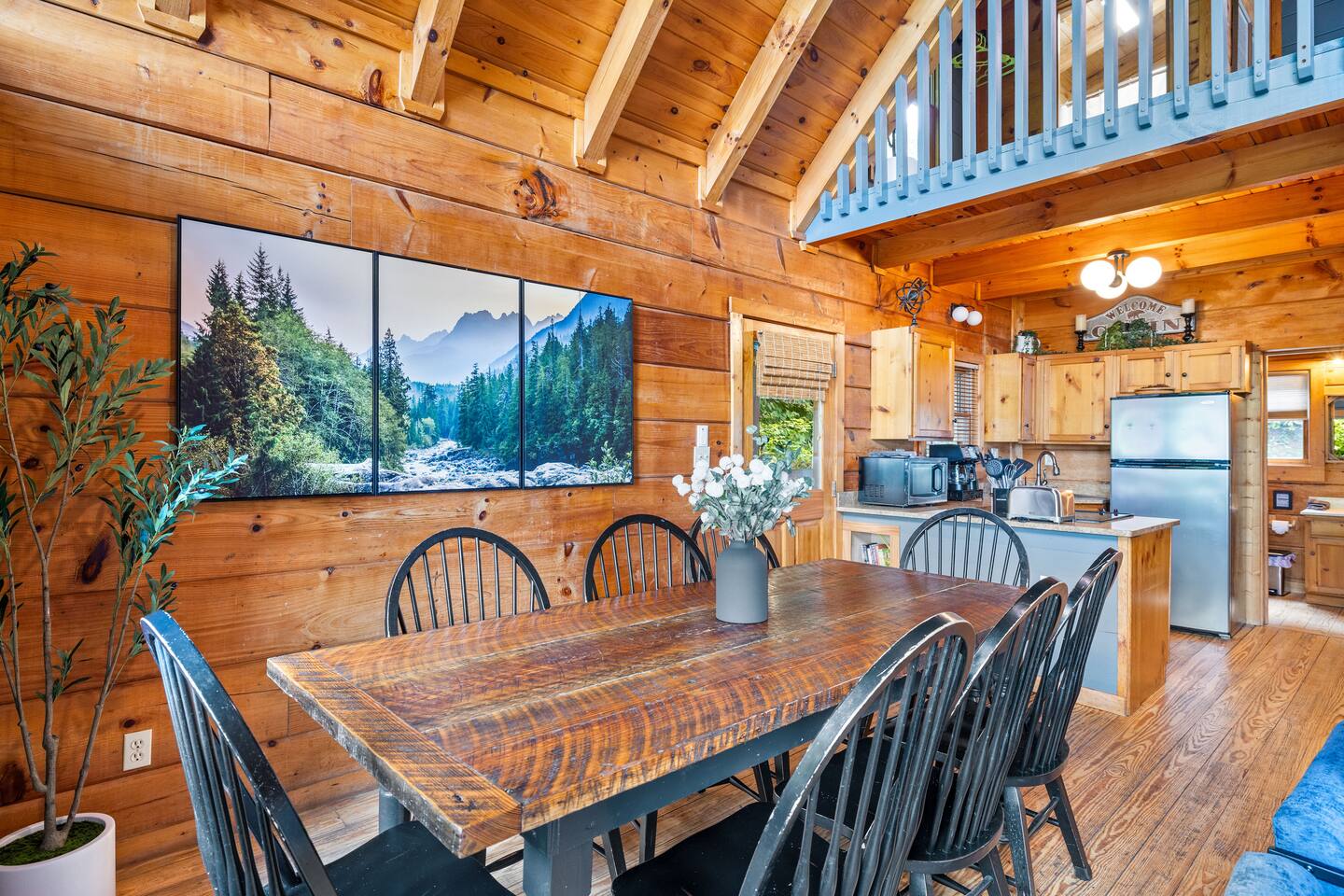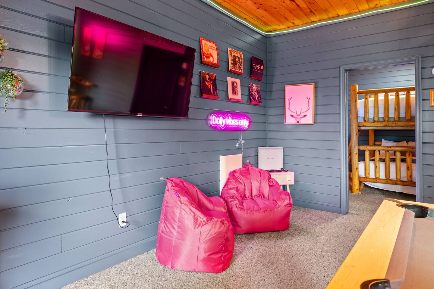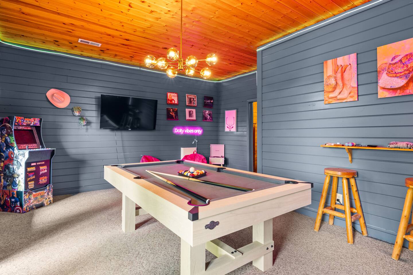 Stay in this homey cabin and access amazing amenities, including a laundry, game room, hot tub, Apple TVs, and high-speed WiFi. Free parking is available on the driveway, with additional street parking. The outdoor cameras on the driveway are for your peace of mind, and the home features a smart lock for convenient and smooth check-in. Please note there is a Ring Flood Light security camera located at the front and side of the cabin facing the parking and entrance for your security. There are no cameras inside the property. *We’ve made some fun updates downstairs! The bunk beds are now in the game room so everyone can be right by the pool table, and the old bunk room has been transformed into a cozy corner perfect for relaxing.