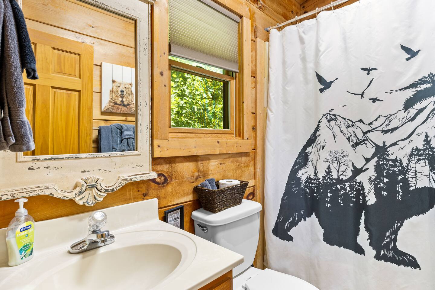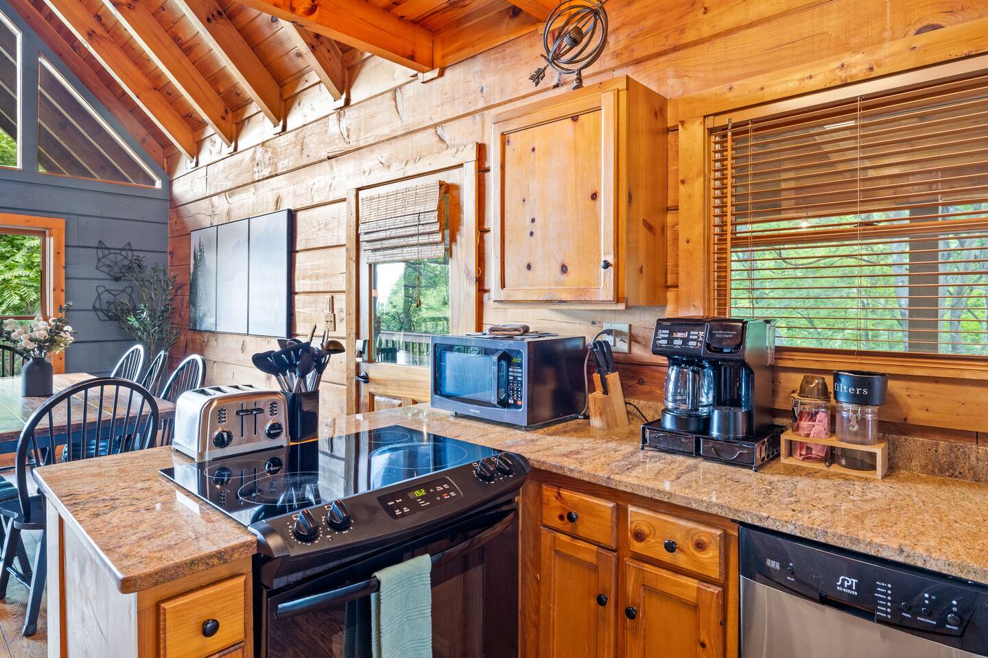 KEY FEATURES: ☀ 3 Large bedrooms; 1 king-size bed, 1 queen-size bed, 1 full-size bunk bed, 1 full-size sleeper sofa ☀ 3 Bathrooms; 3 full bathrooms with combination baths and showers ☀ Well-stocked kitchen with gorgeous views from the dining area that seats 8 guests ☀ Stocked coffee bar with assorted K-cups, whole bean coffee and coffee grounds ☀ Salt, pepper, and cooking spray are provided ☀ Warm and inviting lounge with a electric fireplace and large Apple TV ☀ Games room with pool table, darts, and arcade games, along with an additional Apple TV ☀ A convenient laundry with both a washer and dryer ☀ 2 Incredible wrap-around decks with stunning mountain and forest views ☀ Private outdoor hot tub ☀ High-speed WiFi throughout the home (200 MBPS) ☆☆ BEDROOMS ☆☆ This two-level cabin offers three spacious bedrooms, each featuring a homely finish and sunny atmosphere. The main bedroom is lofted, with a luxurious king-size bed, an Apple TV, and large windows presenting amazing forest views. The second bedroom has a queen-size bed, cozy decor, and enough storage for your belongings. The third bedroom provides a deluxe bunk bed with comfortable full-size beds. Additional sleeping is available for two on the full-size sleeper sofa in the living room. ☆☆ BATHROOMS ☆☆ Three bathrooms are thoughtfully stocked with everything you may need for your stay, including luxury essentials and bath towels. The full bathrooms feature combination baths and showers, so you can choose between a quick shower or a long soak after an active day at the National Park. ☆☆ KITCHEN & LOUNGE ☆☆ The modern kitchen with sparkling appliances invites you to create delicious meals for family and friends. You’ll find a stove, oven, microwave, coffee maker, silverware, dishes, pots, and pans. Enjoy your meals together at the eight-seater dining table. Gorgeous views surround this open-concept area thanks to the large windows providing breathtaking sights of the forest and mountains beyond. The living area is complete with comfortable seating options and a gas fireplace for colder evenings. It also features a large Apple TV paired with high-speed internet for your entertainment. ☆☆ GAME ROOM ☆☆ For even more fun, head over to the game room for tournaments at the pool table or Arcade with a variety of games. ☆☆ OUTSIDE SPACE ☆☆ Take in the panoramic views from the wrap-around decks on the upper and lower levels of the home. Both viewing decks have ample seating to relax and enjoy the forest and mountain views. The upper level includes a lovely outdoor dining area. The lower deck features a private hot tub, crystal clear with stunning views, offering guests a memorable and unique stay. ★☆ Book Today & Let Us Take Care Of You In Sevierville! ☆★